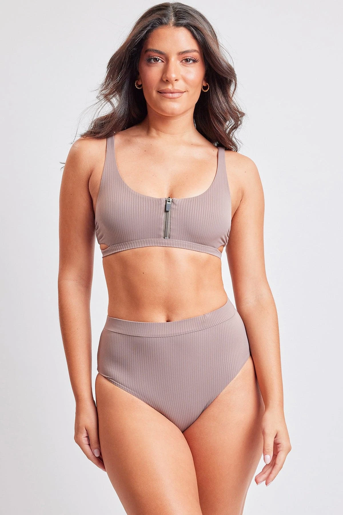 Look as hot as you feel this summer in our women’s Bae Watch Zip Up Bikini swimsuit. This two-piece bathing suit is constructed with a ribbed, stretchy fabric that hugs you in all the right places. The pull-on top features a zip front and cutout detail at the sides and back for a sexy amount of coverage, while the high-rise bottom sits up on the waist for a tummy-cinching look and hourglass shape. Pair with your favorite YMI linen and sandals for a breezy look that is sure to make a splash!