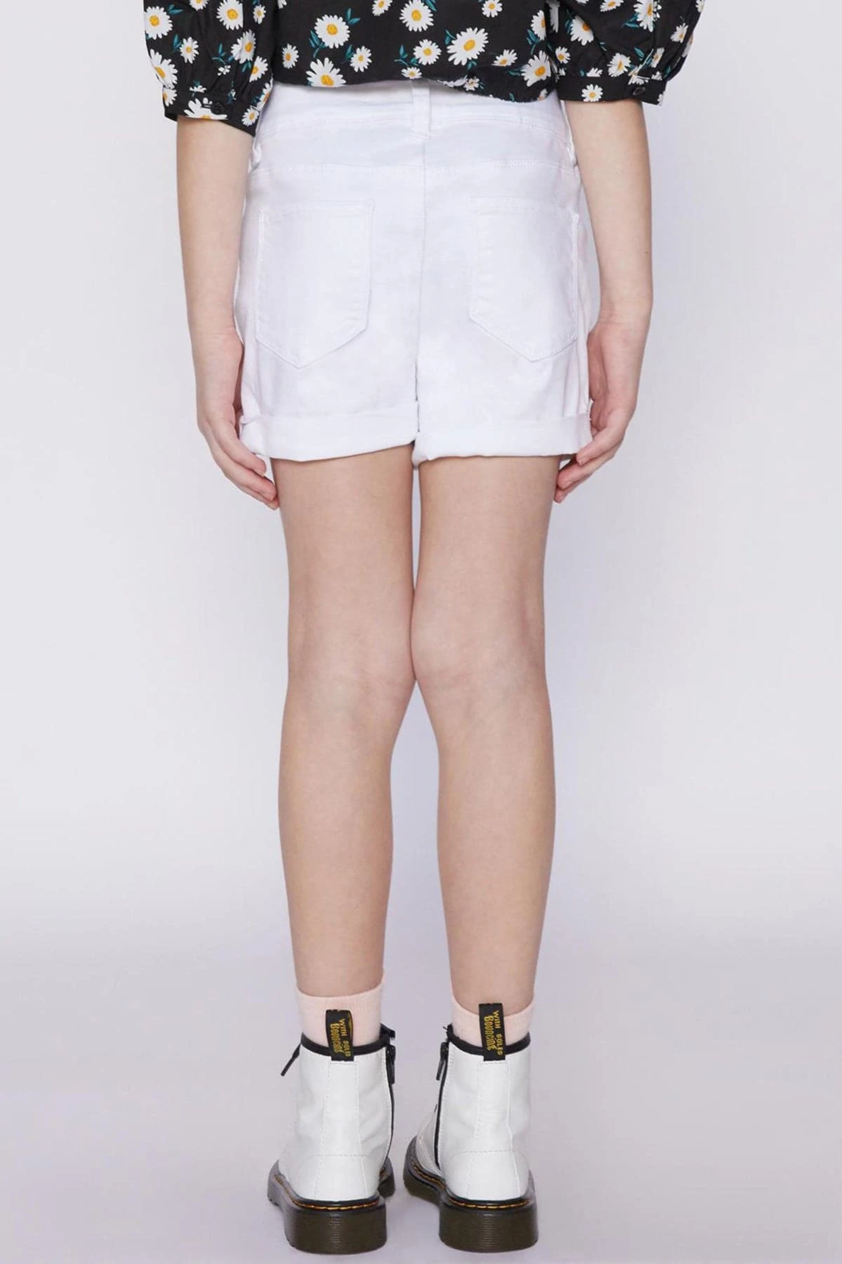 Our Basic Girl’s Cuffed Shorts featuring whisker detailing, faux front pockets, double-summary closure, functional back pockets, and belt loops.