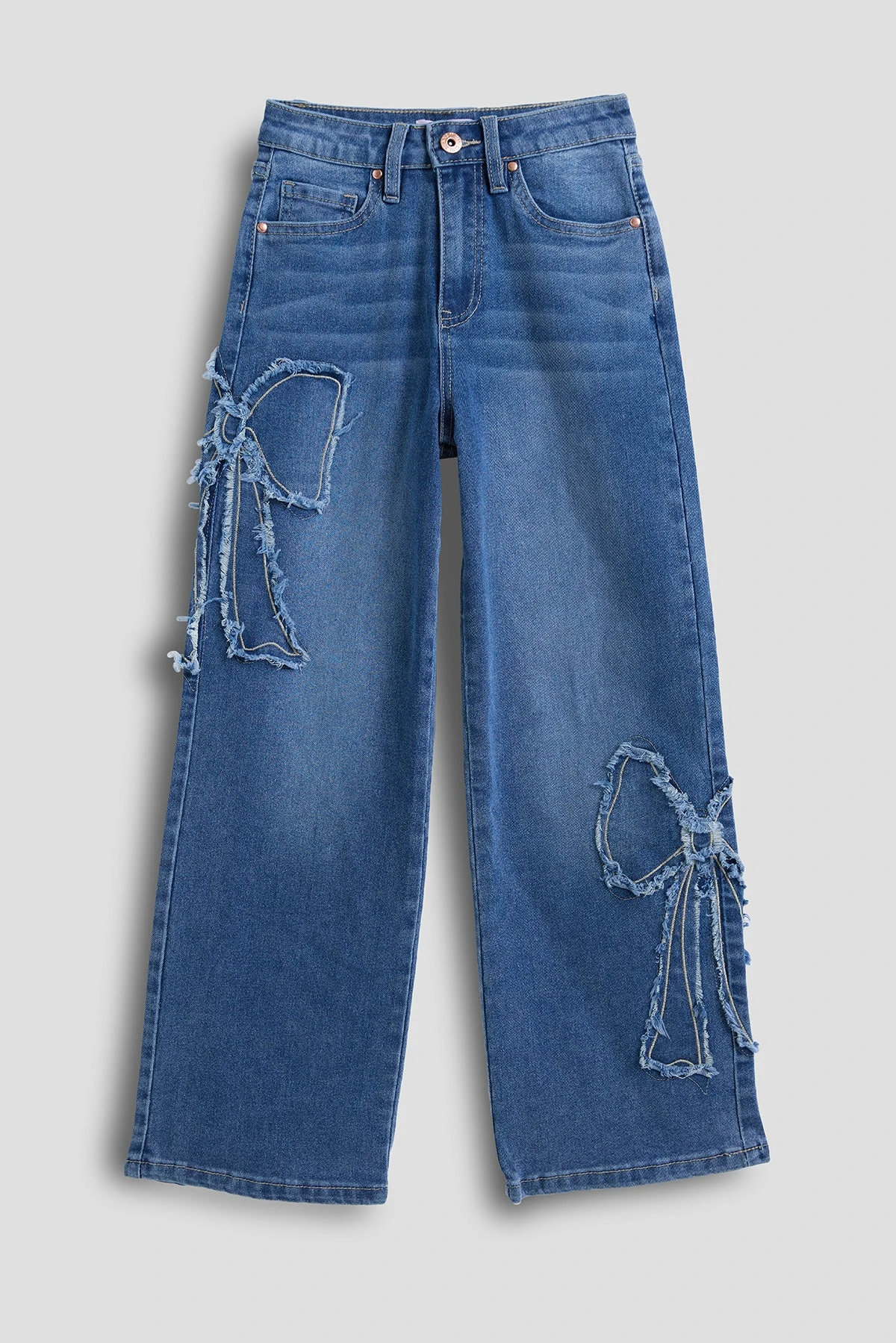 Playful and stylish, these Girls Wide Leg Bow Patchwork Jeans add a fun twist to a classic denim look. Featuring adorable bow patchwork details, a timeless 5-pocket design, and a secure zipper and summary fly closure, these jeans blend fashion with everyday comfort. The wide-leg fit offers a relaxed and trendy look, while belt loops provide the option to accessorize. Made from a soft and stretchy denim blend, they’re perfect for pairing with a favorite top and sneakers for a look that stands out with effortless charm.