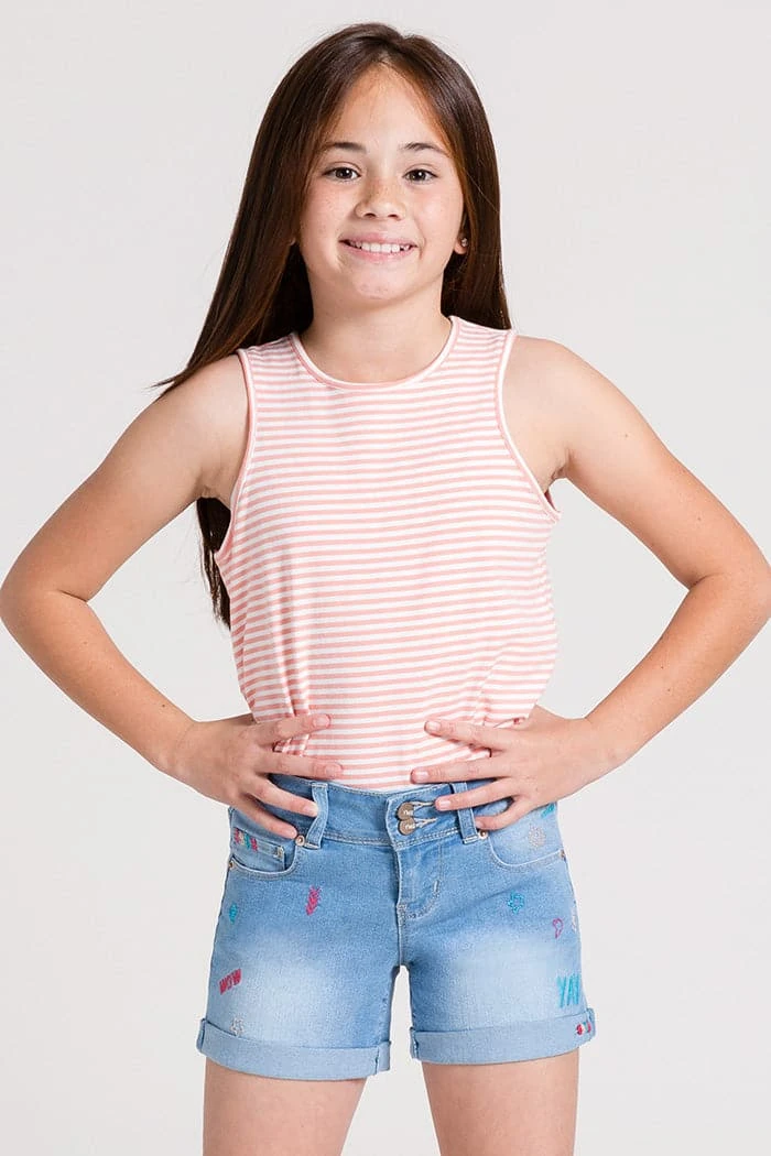 Our Kids Cuffed Shorts With Words And Embroidery. Featuring 5-pocket construction, 2-summary with zipper closure and belt loops.