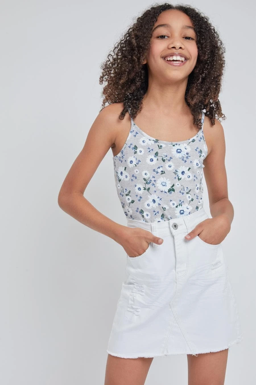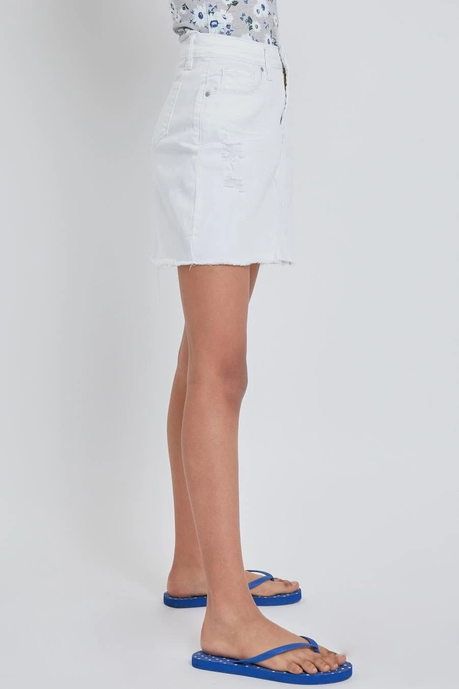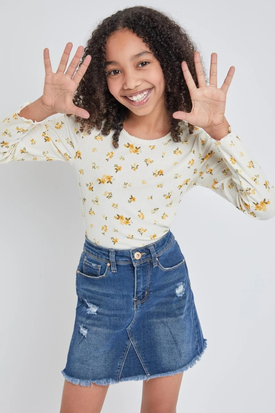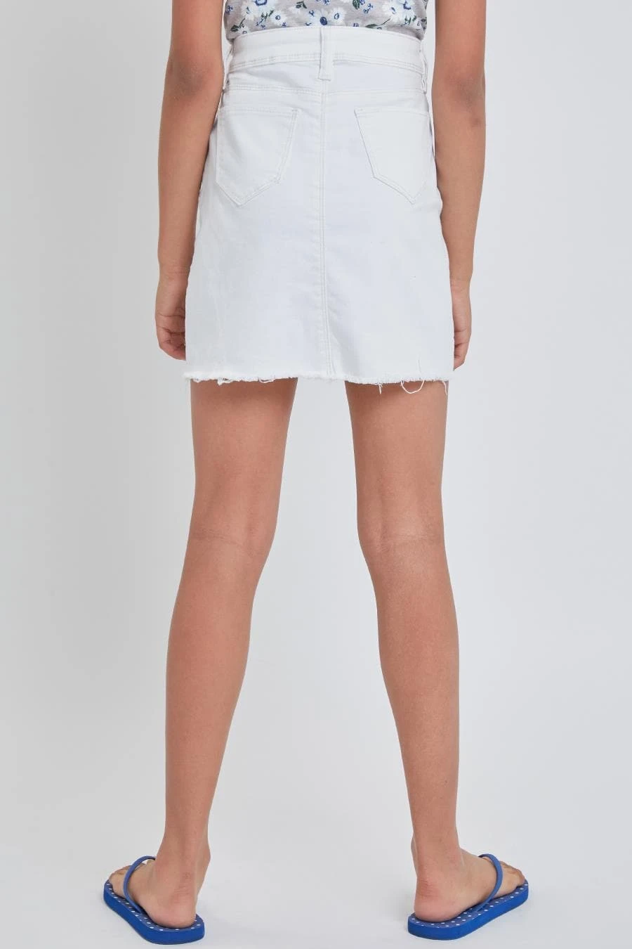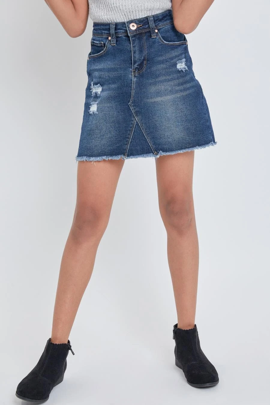Our Girl’s Denim Skirt With Front Seam Detail and Destruction is a must-have for your warm weather wardrobe. Made of soft stretchy denim, this skirt features classic five-pocket construction, front zip and summary closure, destruction detailing throughout, front seam detail, frayed hem, and belt loops. Pair with tops and sneakers for a cute casual look and layer it with a jacket and boots on colder days. This skirt runs big so size down for a more snug fit.