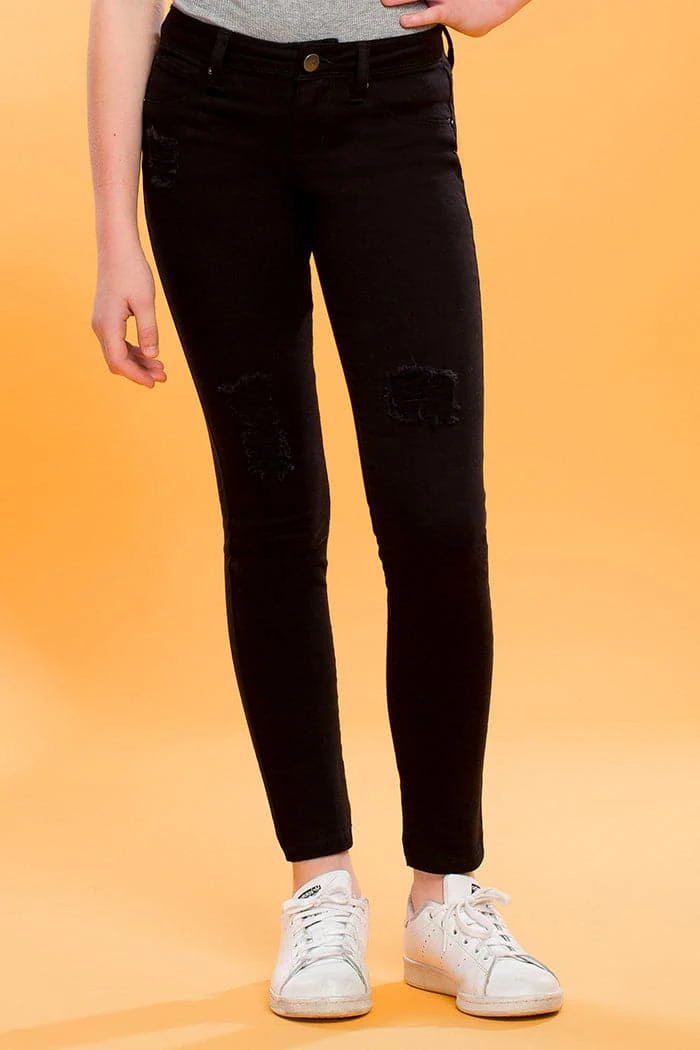 Our Kid’s Distressed Skinny Twill Pant. Featuring faux front pockets, distressed detailing, super soft fabric, single-summary closure with front zip, and belt loops.