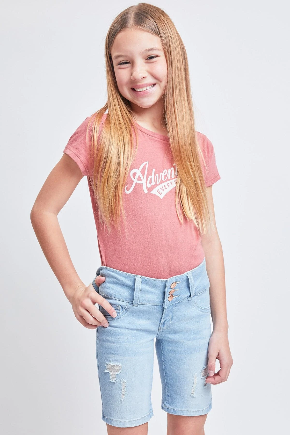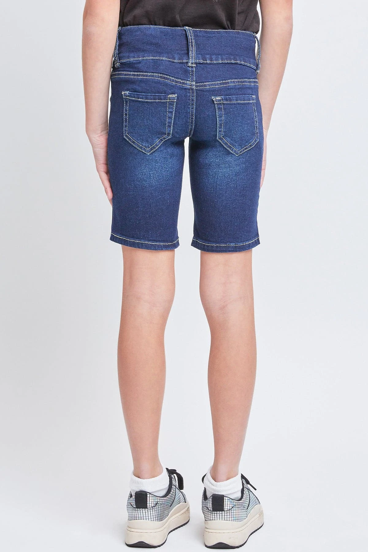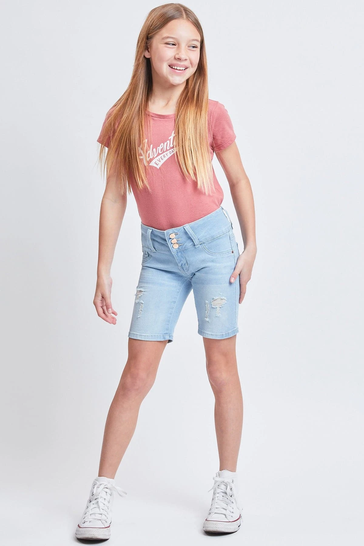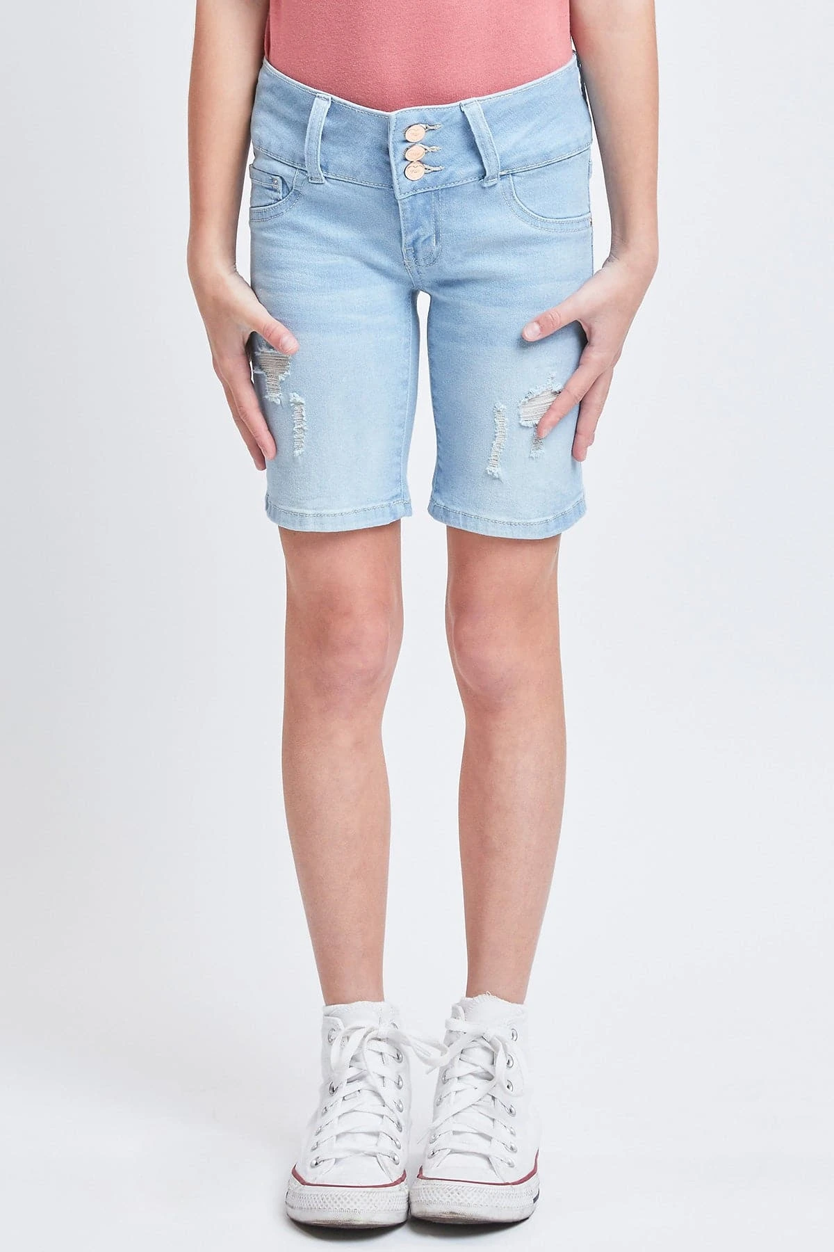 Ready for adventure ahead! Our Girls’ Essential Mid-Rise 3-Button Bermuda is everything she is looking for in a pair of shorts! Made in a mid-rise with a trendy 3-summary closure with zipper. Featuring faux front pockets, 2 functional back pockets, and belt loops. These bermudas are fitted throughout and hit above the knees. We’ve designed these with whiskering, fading, and light distressing for a lived-in feel. Also made with stretchy denim that moves with you for a comfortable, all-day fit. Pair these with a cute graphic tee and sneakers for cool look.