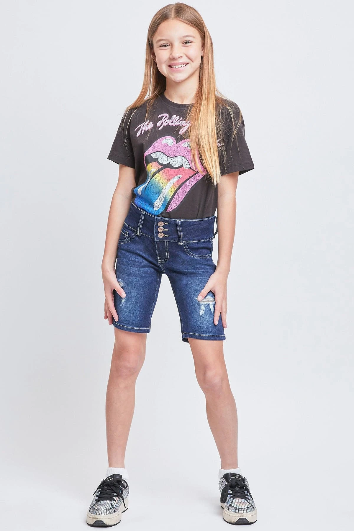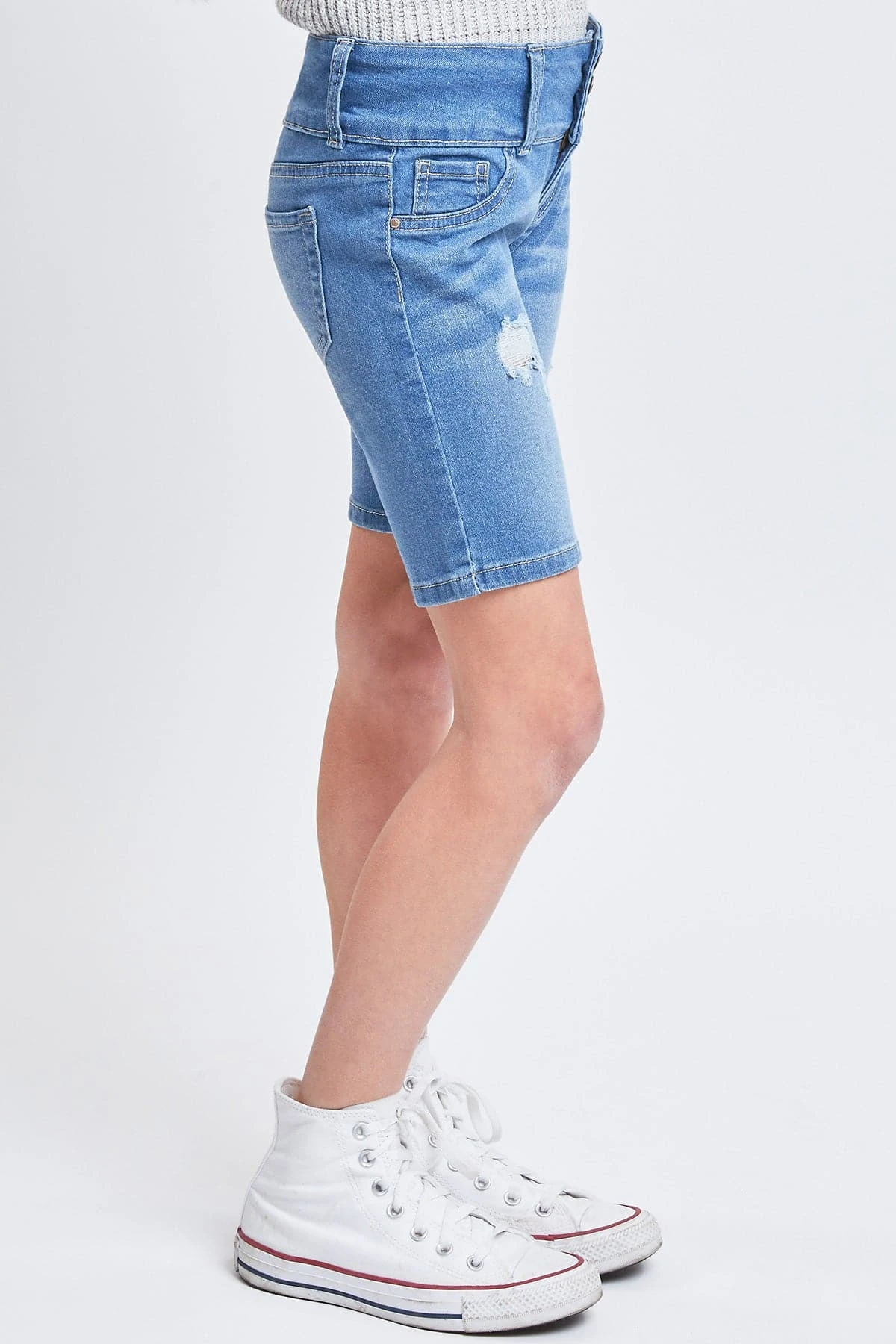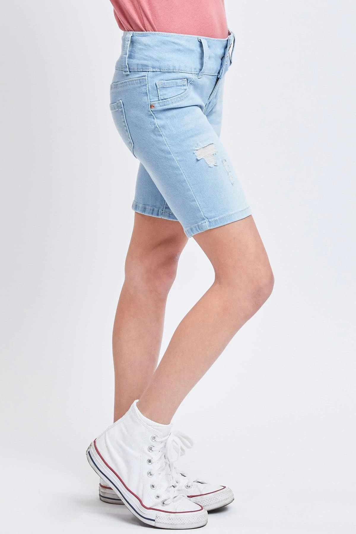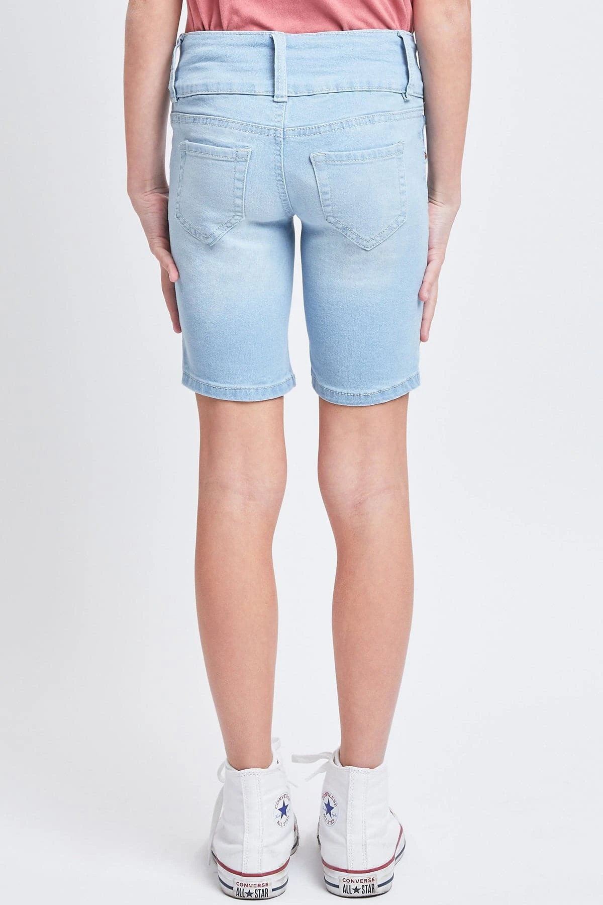Ready for adventure ahead! Our Girls’ Essential Mid-Rise 3-Button Bermuda is everything she is looking for in a pair of shorts! Made in a mid-rise with a trendy 3-summary closure with zipper. Featuring faux front pockets, 2 functional back pockets, and belt loops. These bermudas are fitted throughout and hit above the knees. We’ve designed these with whiskering, fading, and light distressing for a lived-in feel. Also made with stretchy denim that moves with you for a comfortable, all-day fit. Pair these with a cute graphic tee and sneakers for cool look.