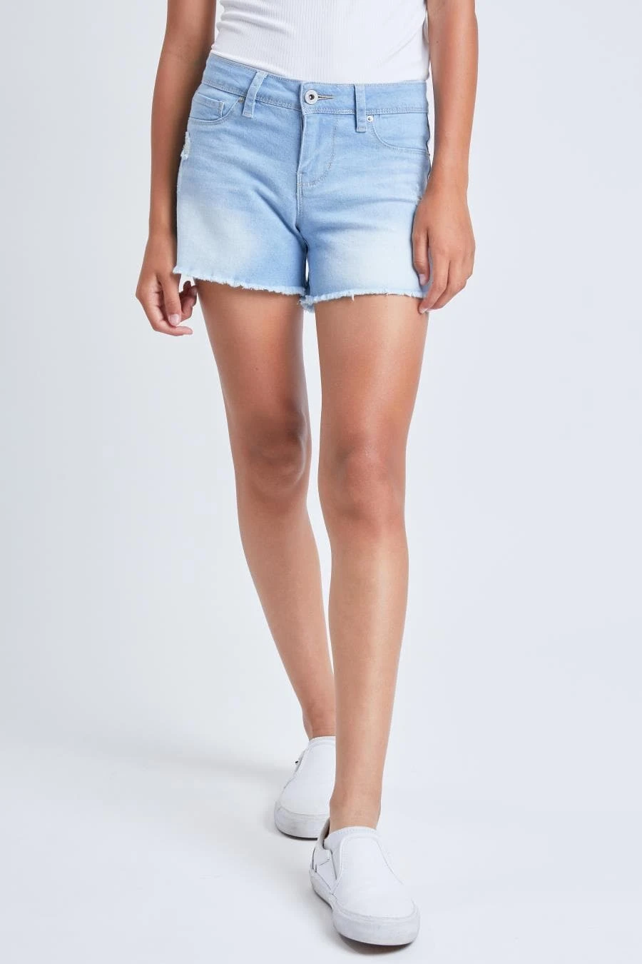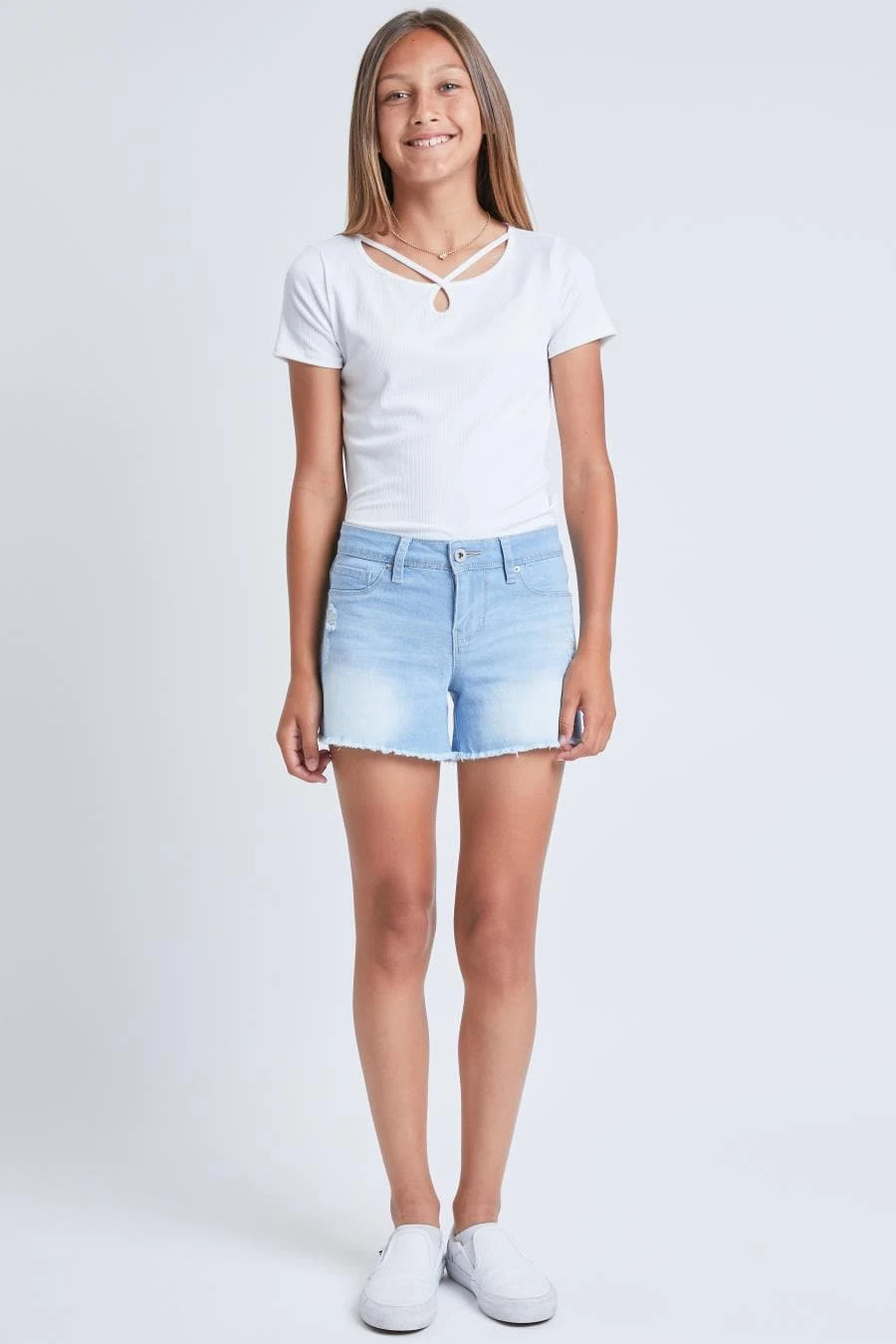 Have some fun under the sun in our Girls Basic Fray Hem Shorts! These feature faux-front pockets, light distress detailing, single-summary closure, functional back pockets, and belt loops.