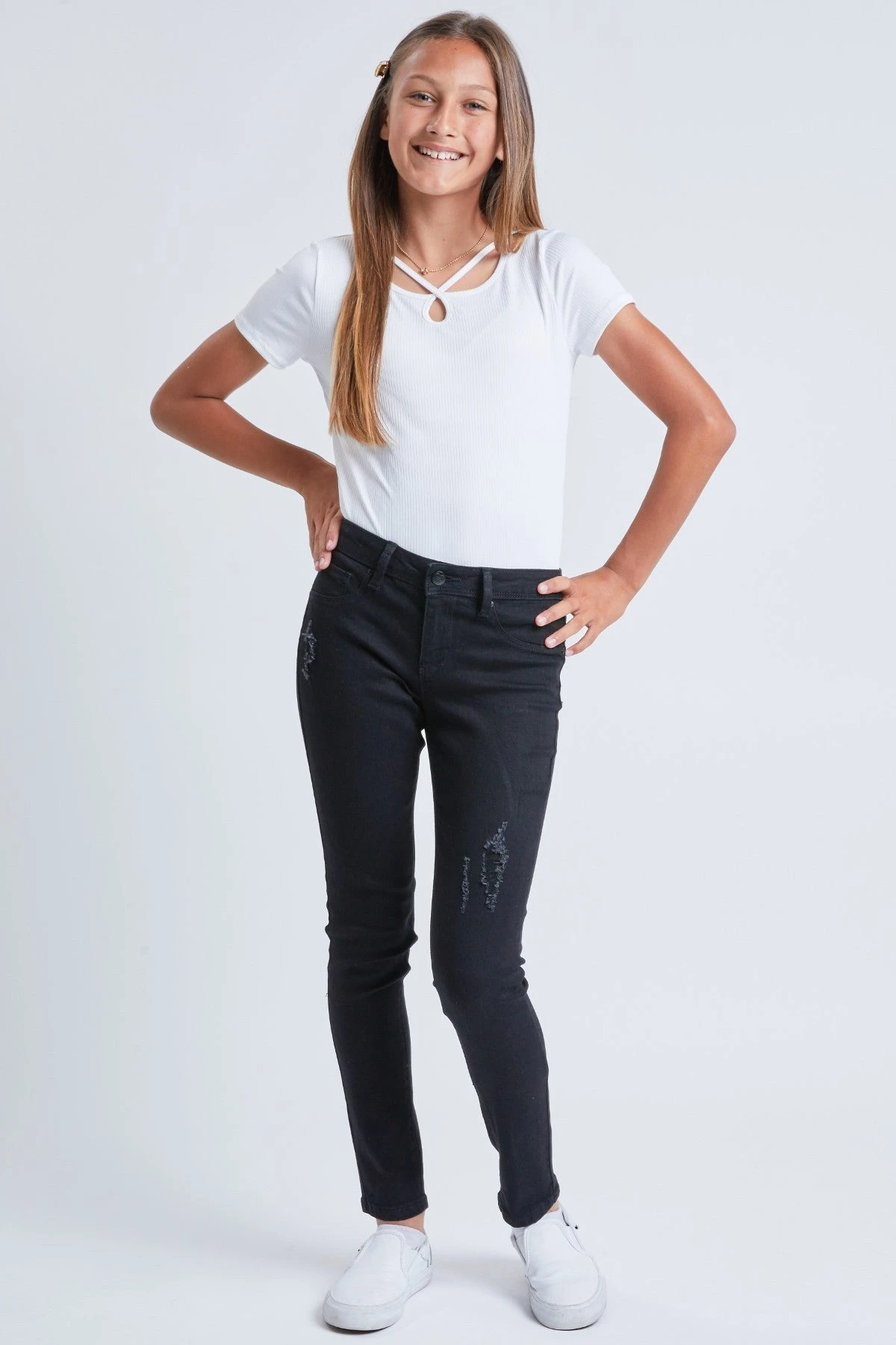 A closet staple that’s perfect for any occasion. Our Basic Skinny Jean With Faux Front Pockets features a mid-rise and is slim-fitting throughout. Available in a variety of washes to pair with any outfit you have in mind. Some washes feature light distressing on the front for a slightly edgy look. Pair these with your favorite top and sneakers for an easy look, or wear them with a sweater and booties for a comfy-chic look!Â