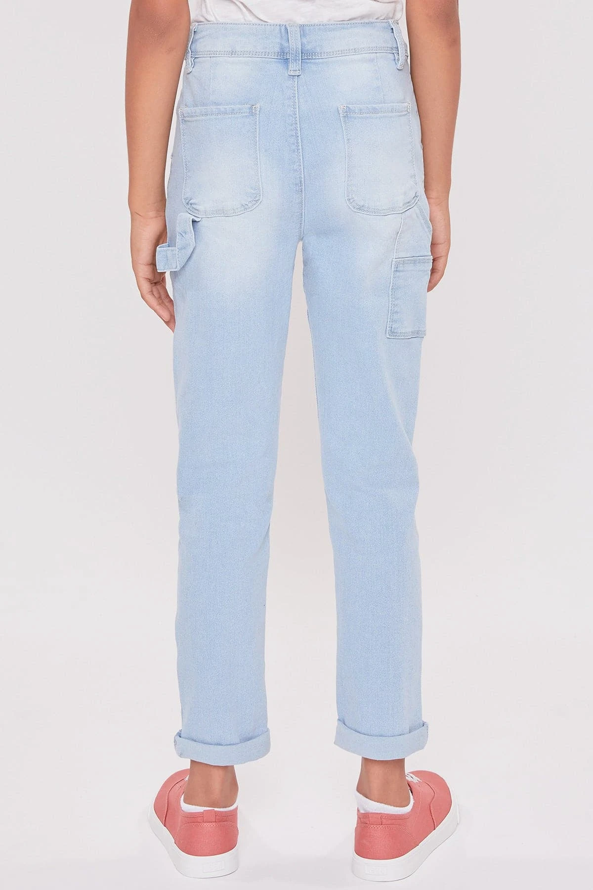 The perfect combination of sporty and trendy! Our Girls’ Roll Cuff Carpenter Jeans With Hammer Loop is utility-inspired with front slant pockets, back patch pockets, a side cargo pocket, and a hammer loop. Also featuring a cuffed hem for a sporty and effortless look. You’ll love the comfort and stretch of these jeans, making them perfect for all-day wear! Pair these with your favorite hoodie and sneakers for a laid-back vibe! Add a beanie or baseball cap to complete the look.Â