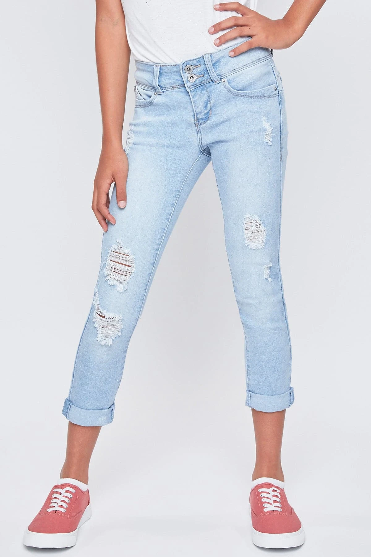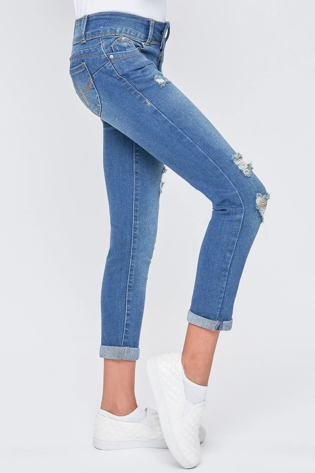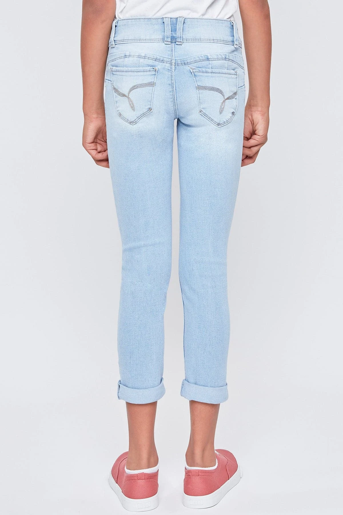 Too cool for school! Rock the coolest look in our Girls WannaBettaFit 2-Button Double Cuffed Skinny Jeans Made with Recycled Fibers! Made with our signature WBF heart-shaped stitching and uniquely crafted pockets for the best fit ever! Also designed with super stretchy denim for movement and all-day wear. These jeans are made with recycled fibers so you can be sustainable and stylish! Featuring a 2-summary closure, front distressing, and cuffed hems for an edgy look. Pair these with your favorite tee and sneakers. Add cool jacket to complete the look!