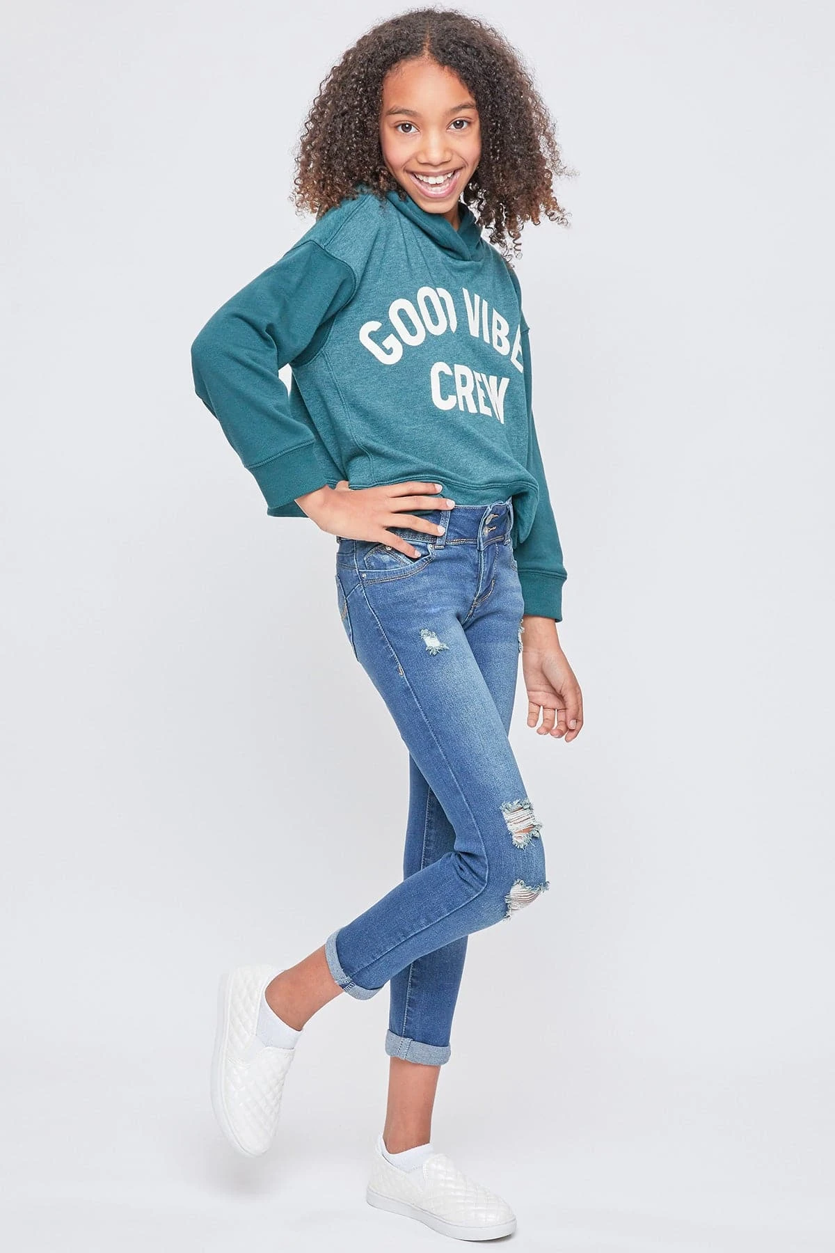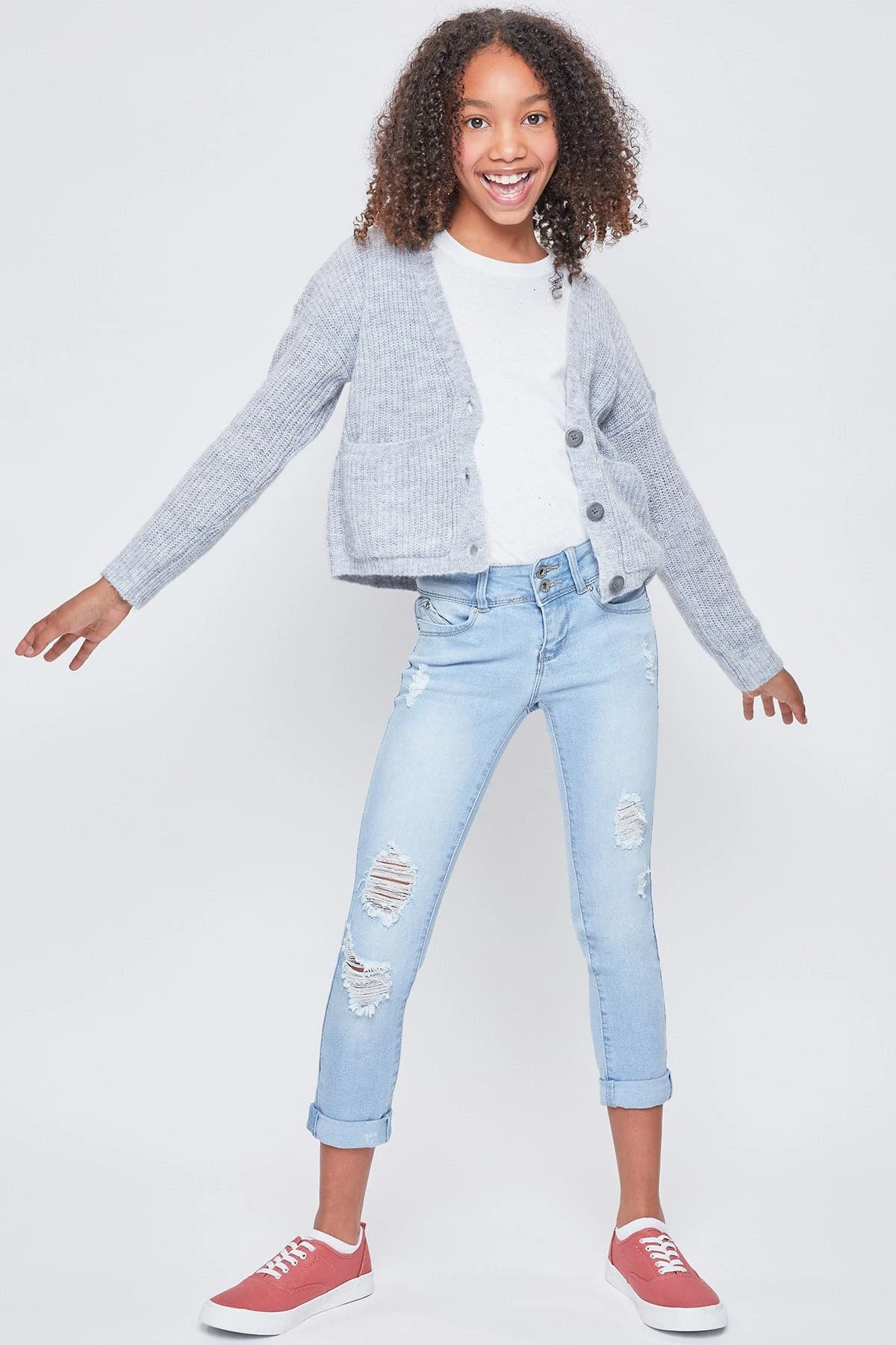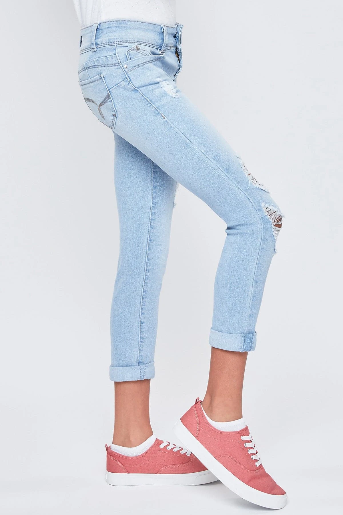 Too cool for school! Rock the coolest look in our Girls WannaBettaFit 2-Button Double Cuffed Skinny Jeans Made with Recycled Fibers! Made with our signature WBF heart-shaped stitching and uniquely crafted pockets for the best fit ever! Also designed with super stretchy denim for movement and all-day wear. These jeans are made with recycled fibers so you can be sustainable and stylish! Featuring a 2-summary closure, front distressing, and cuffed hems for an edgy look. Pair these with your favorite tee and sneakers. Add cool jacket to complete the look!