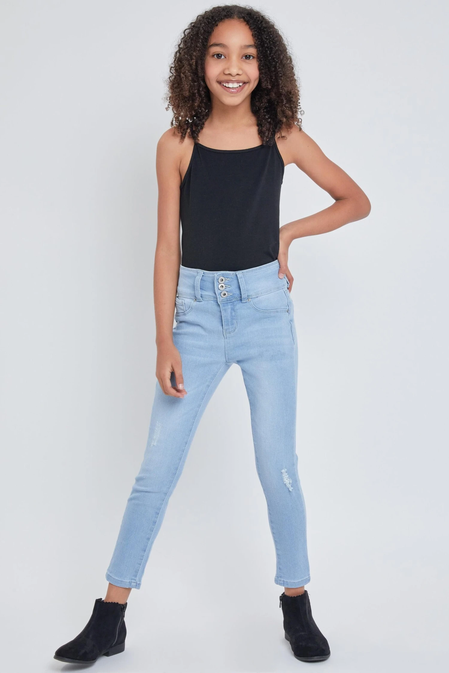 Our Girl’s WannaBettaFit 3-Button Skinny Cuffed Pant Made With Recycled Fibers features classic 5 pocket construction with triple summary and front zip closure, and belt loops. This pant was made from recycled plastic bottles so it’s eco-friendly and created less landfill waste than your traditional jean.