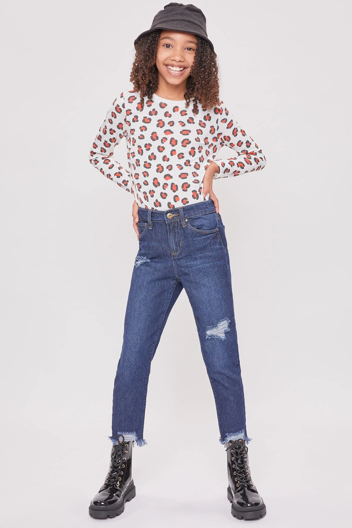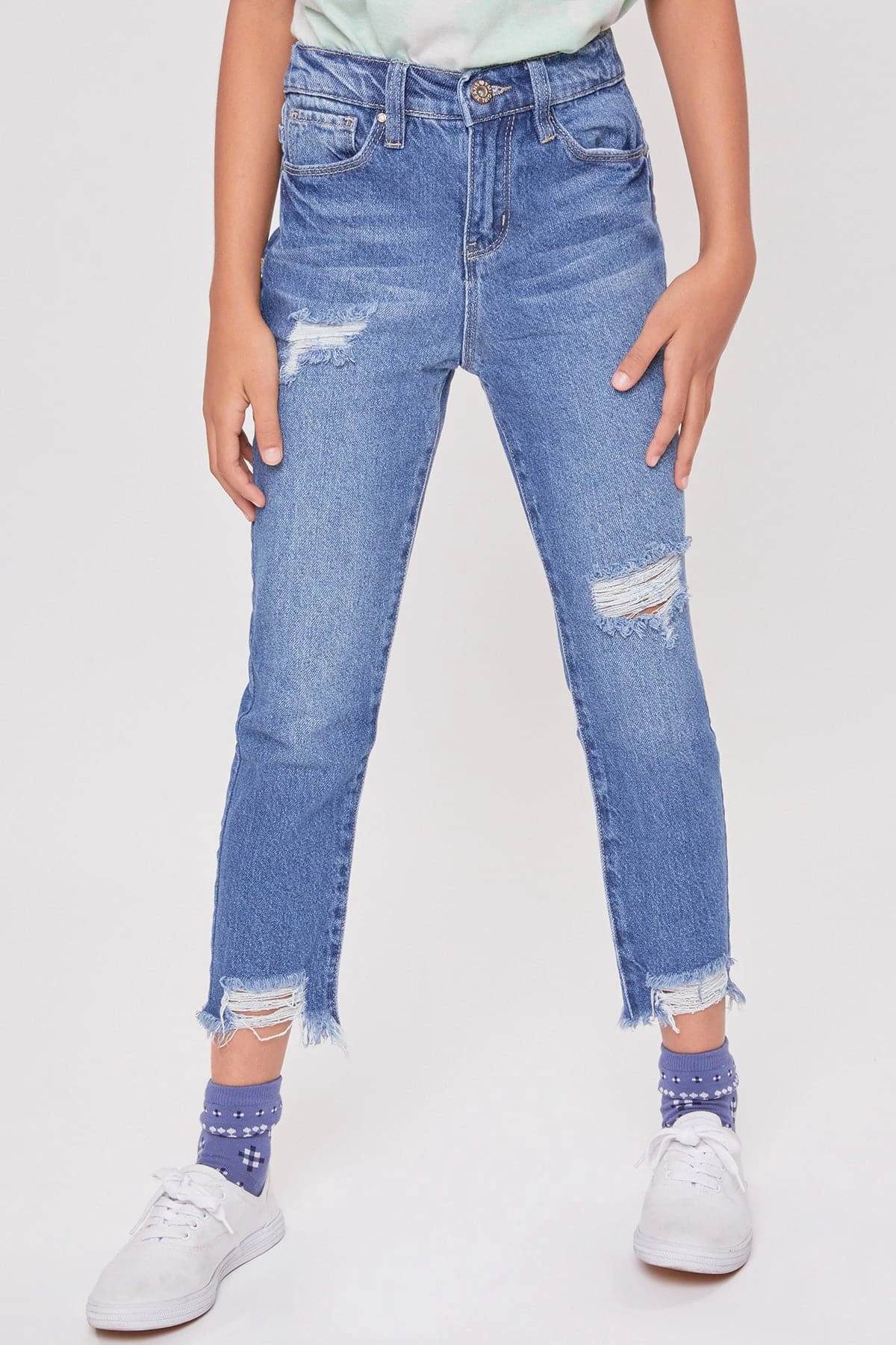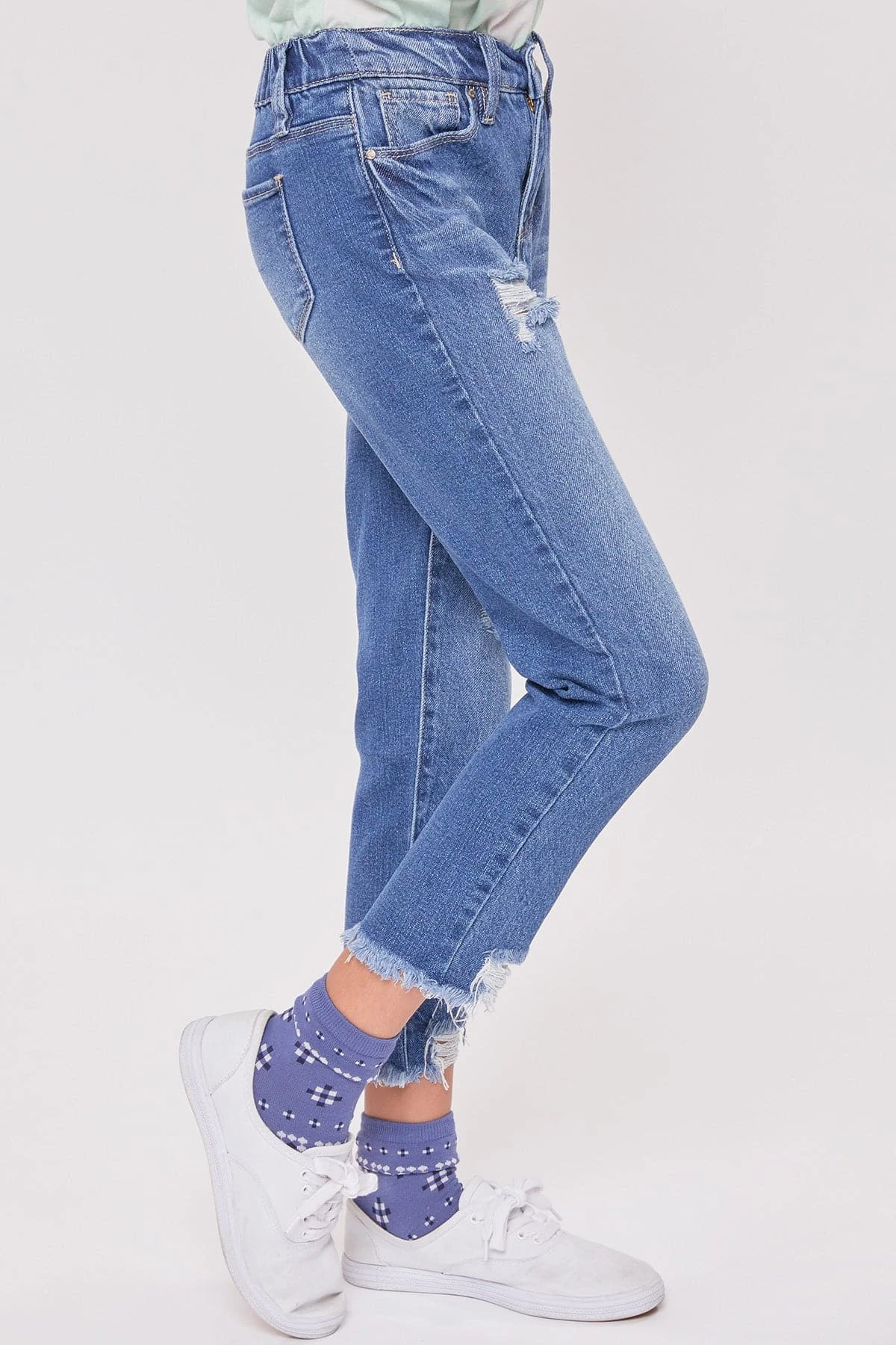Get ready to be the coolest girl in school in our Girls Taylor Dream High Rise Relaxed Fit Ankle Jeans. Designed with our hybrid denim made with 100% cotton in the front to give the look of vintage jeans, and stretch denim in the back to provide ultimate comfort for all-day wear. Featuring light front distressing and raw cut hems for an edgy look! Pair these with your favorite graphic tee and sneakers for a casual look, or throw on a leather jacket and combat boots for a total cool-girl vibe!