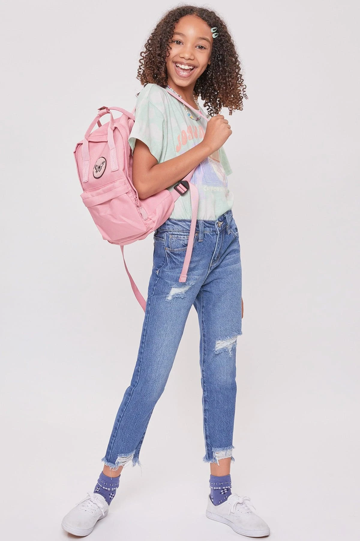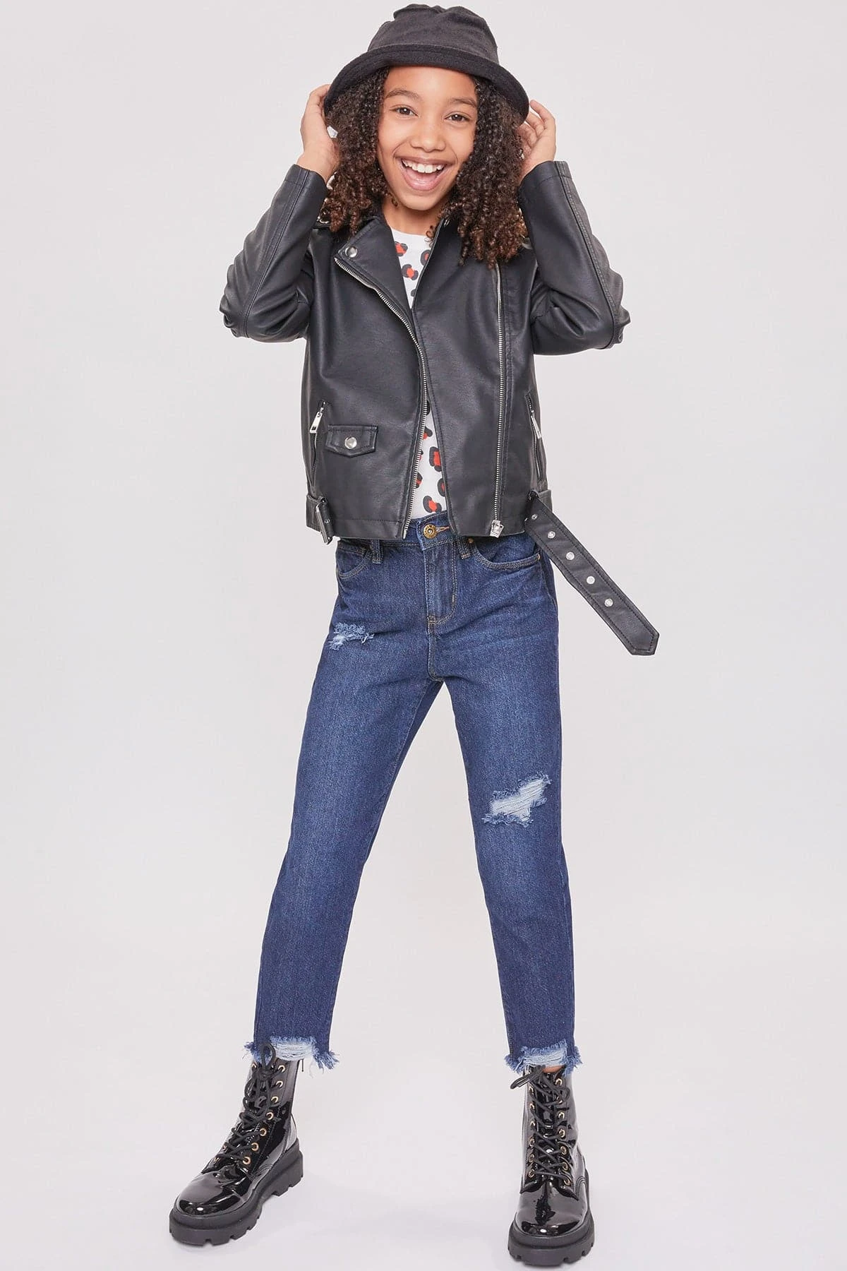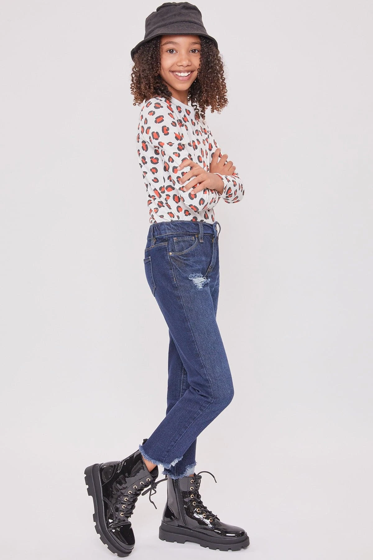 Get ready to be the coolest girl in school in our Girls Taylor Dream High Rise Relaxed Fit Ankle Jeans. Designed with our hybrid denim made with 100% cotton in the front to give the look of vintage jeans, and stretch denim in the back to provide ultimate comfort for all-day wear. Featuring light front distressing and raw cut hems for an edgy look! Pair these with your favorite graphic tee and sneakers for a casual look, or throw on a leather jacket and combat boots for a total cool-girl vibe!