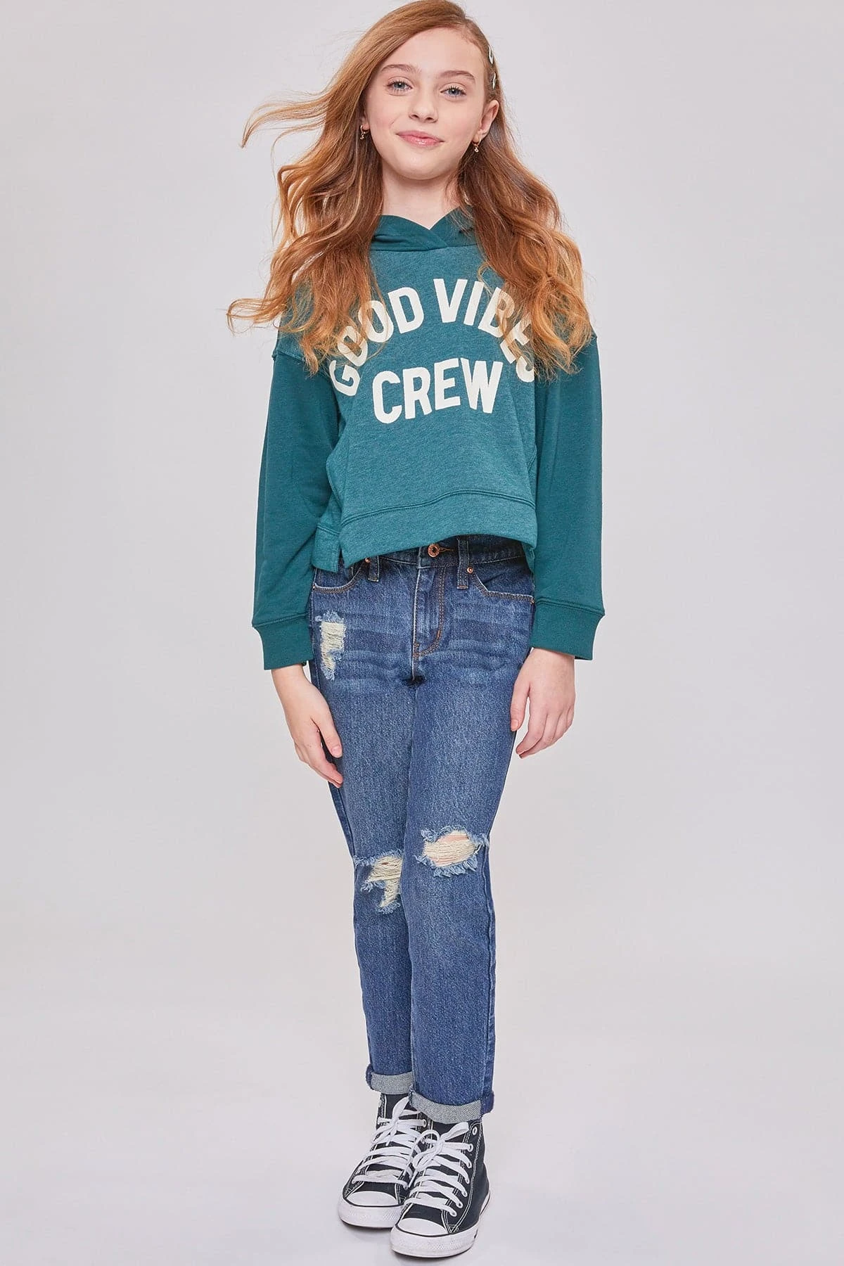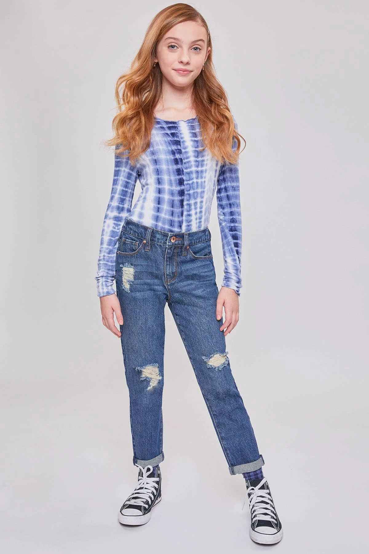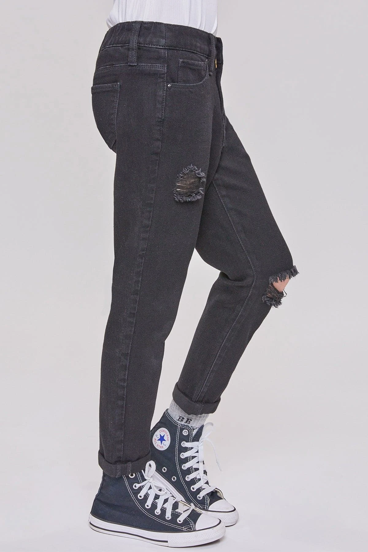 She’s trendy! She’ll get tons of compliments in our Girls Taylor High-Rise Relaxed Fit Cuffed Jeans. This jean is part of our hybrid denim collection- made with 100% cotton in the front to give the look of vintage jeans, and stretch denim in the back to provide ultimate comfort and all-day wear! Featuring light front distressing and cuffed hems for a cool and edgy look! Pair these with your favorite graphic tee and sneakers for a casual look, or throw on a leather jacket and combat boots for a total cool-girl vibe!Â