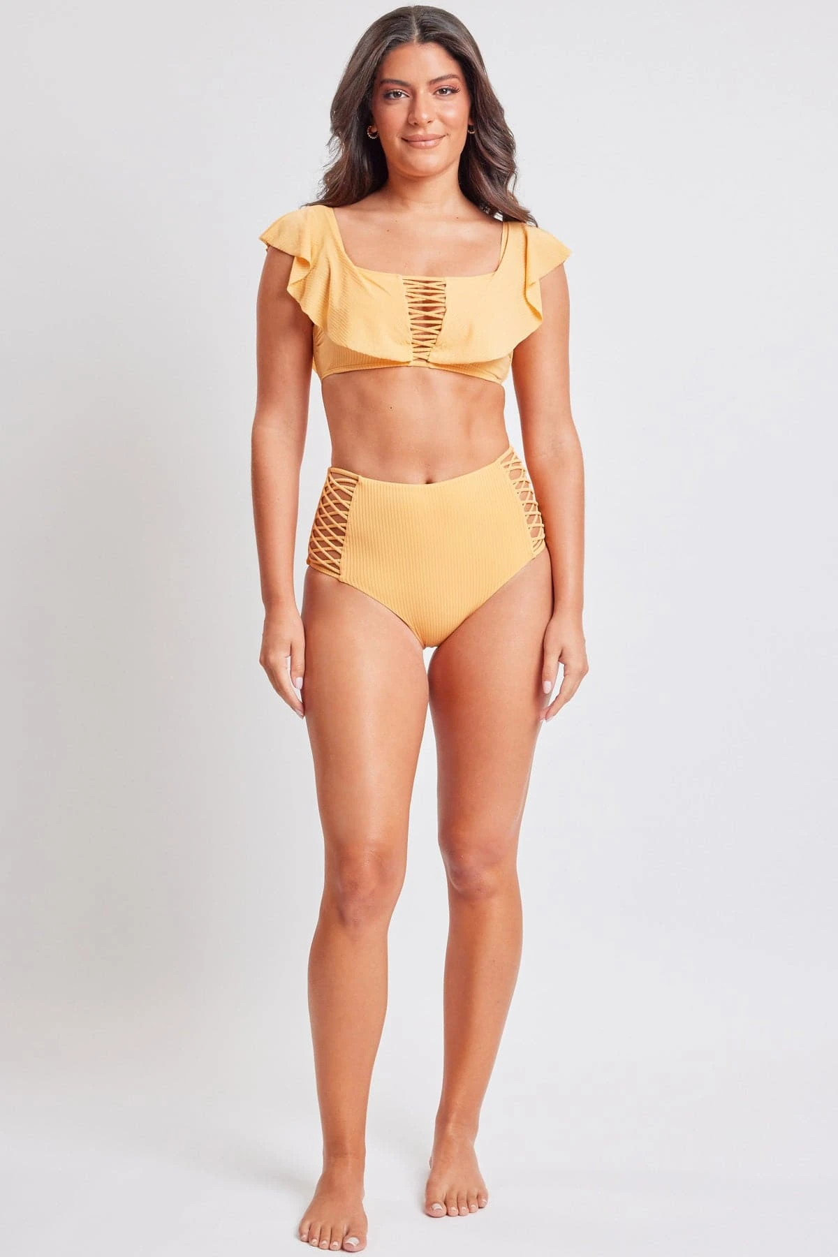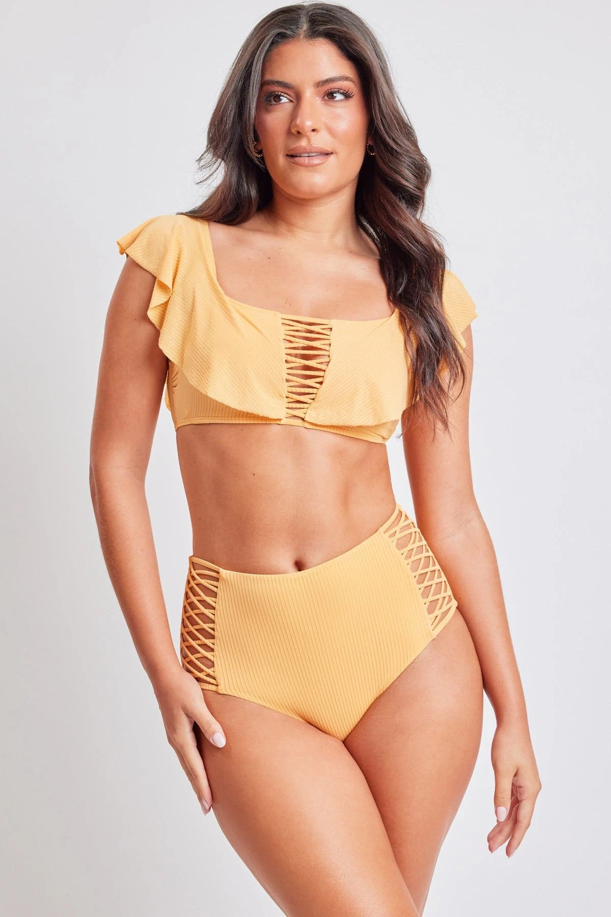 Ruffle some feathers in our women’s Heart & Sol Off Shoulder Flounce Bikini swimsuit. This two-piece bathing suit features vertical ribbing throughout and lace up detail at the front and sides. The flounced top gives a flirty, feminine touch, and the high-rise bottom sits up on the waist for a tummy-cinching look and hourglass shape. Style with your favorite cover up and sandals for a summer-chic ‘fit!