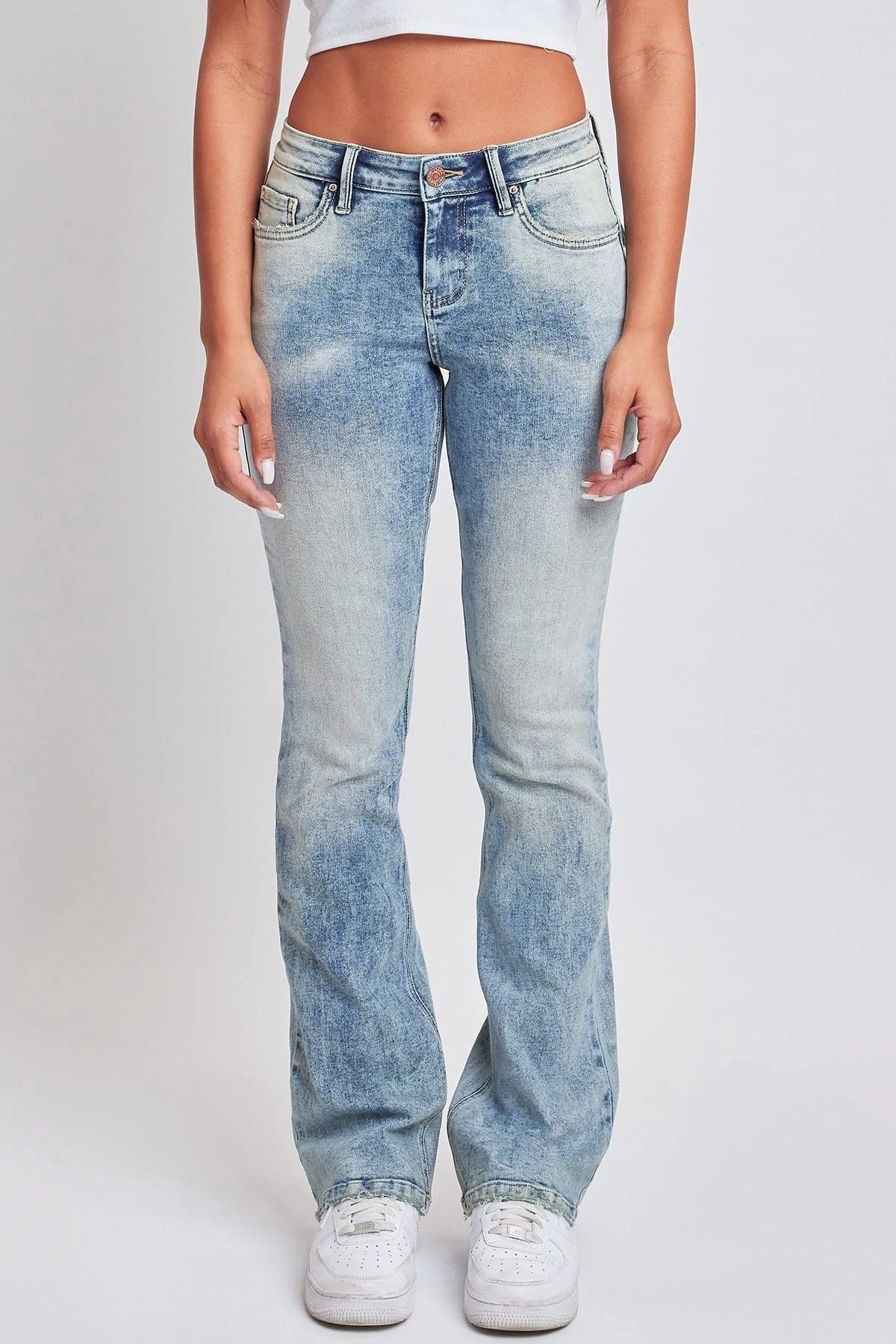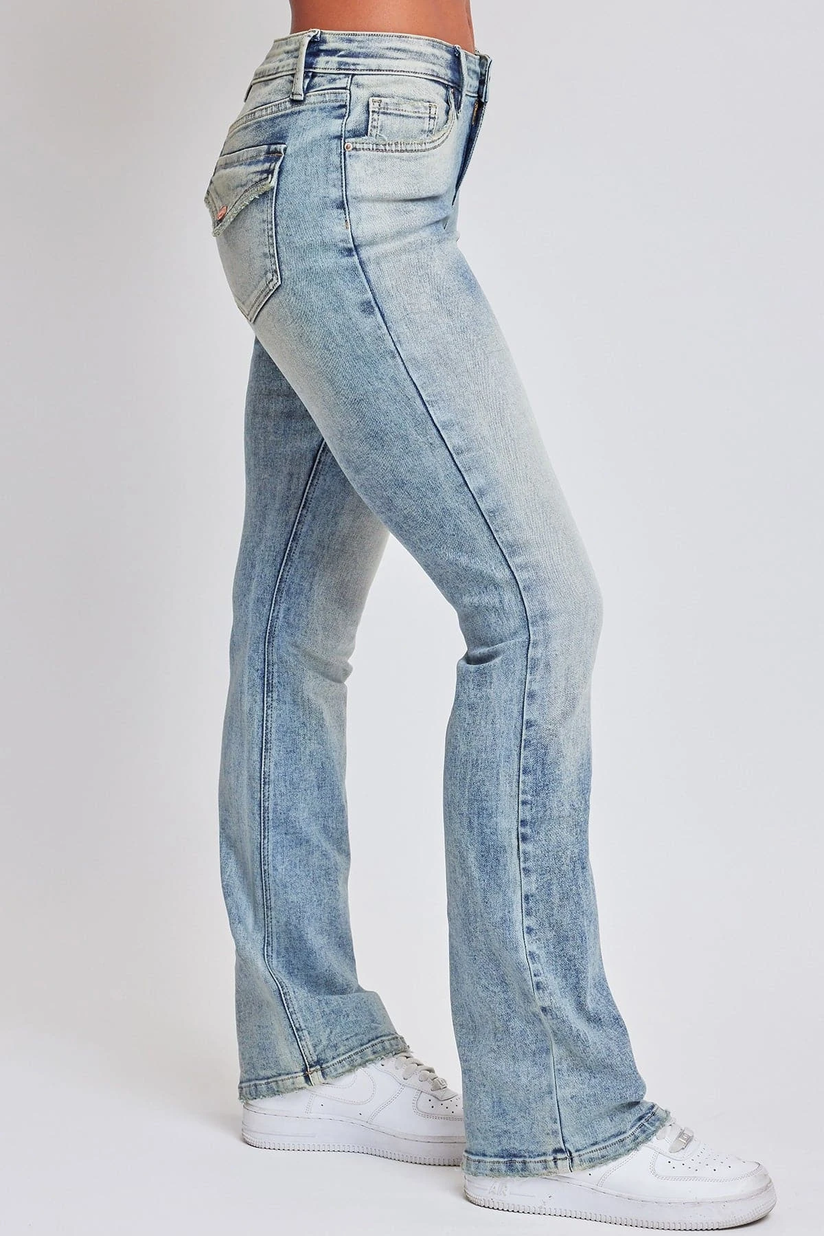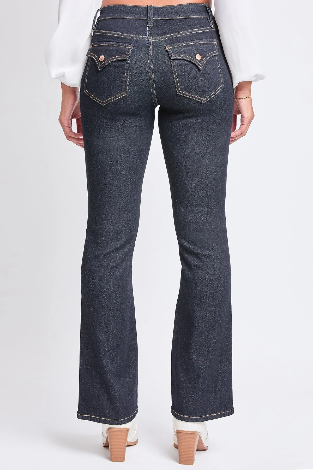 Strut your stuff in our Women’s Mid-Rise Bootcut Jeans with Back Flap Pockets! Featuring a mid-waisted design, these jeans sit comfortably at the hips, are fitted hip to knee, and have a subtle flare at the hem for an ultra-flattering silhouette. Detailed with contrast stitching and flap back pockets with snap summary closures. Style with a bodysuit and heeled boots for a sexy date night look!