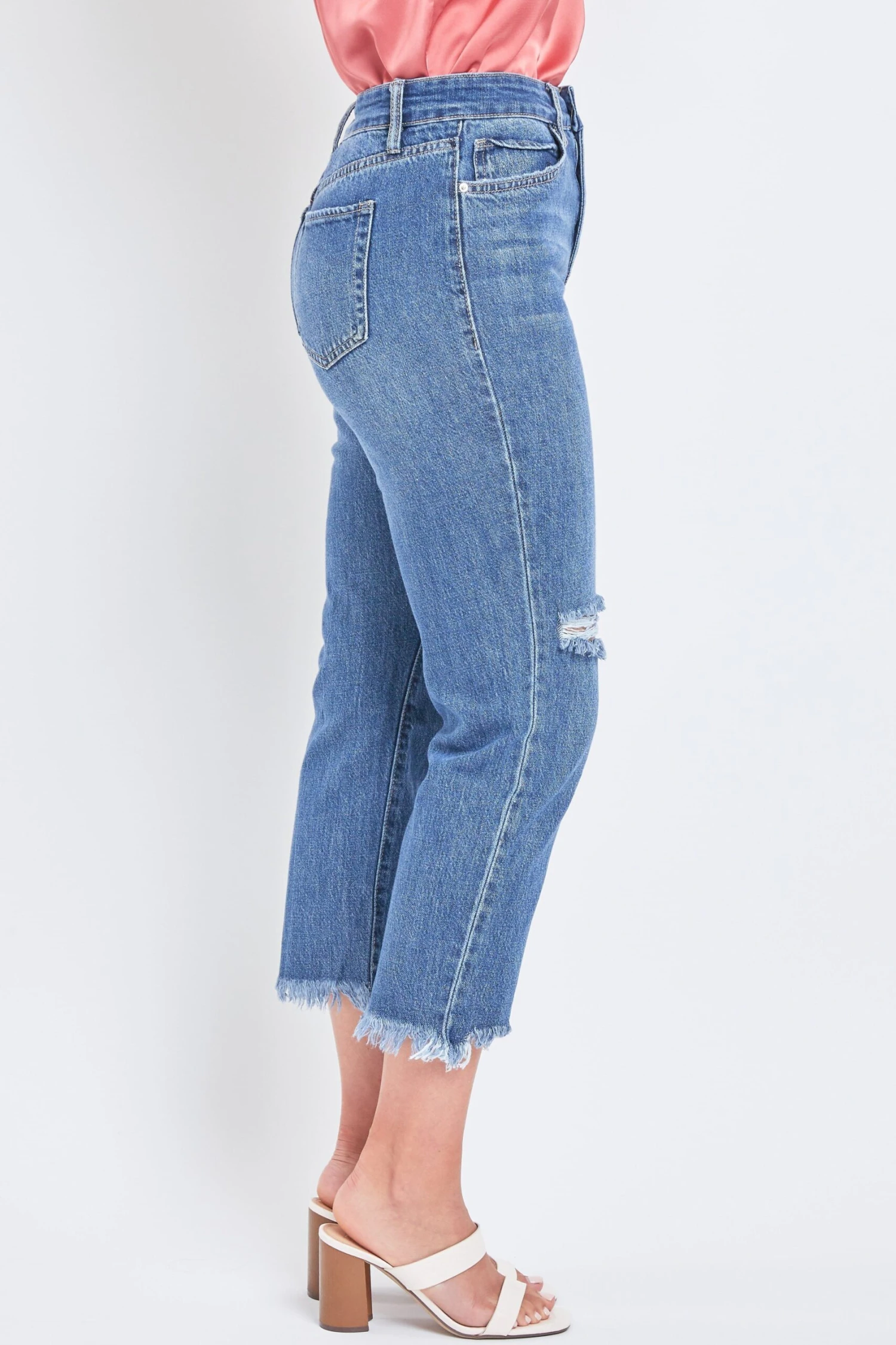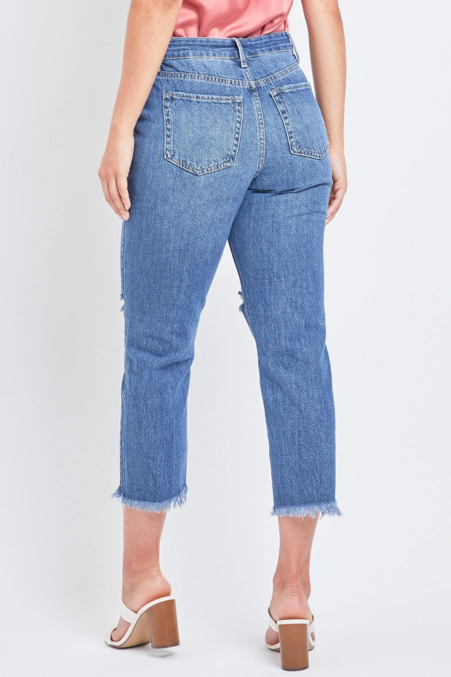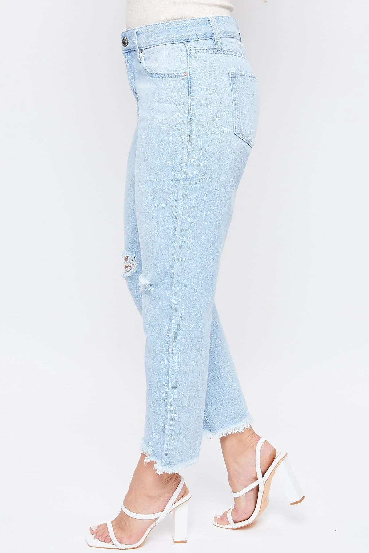 Stay on trend in our Women’s Comfort Waist High Rise Straight Mom Fit Jeans with Destructed Hem. You’ll look effortlessly cool the moment you put them on! Featuring a straight leg with knee blowout details and a distressed hem to give a worn-in look. Designed with 100% cotton for an authentic vintage style and a stretchy waistband for comfort. Wear these casually with a tank or tee and sneakers, or dress them up with a cami, blazer, and heeled sandals!