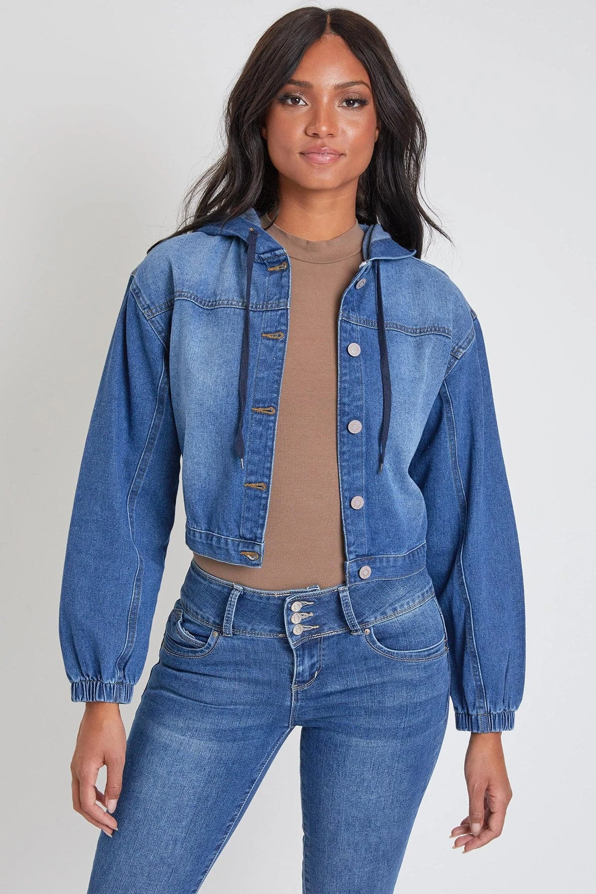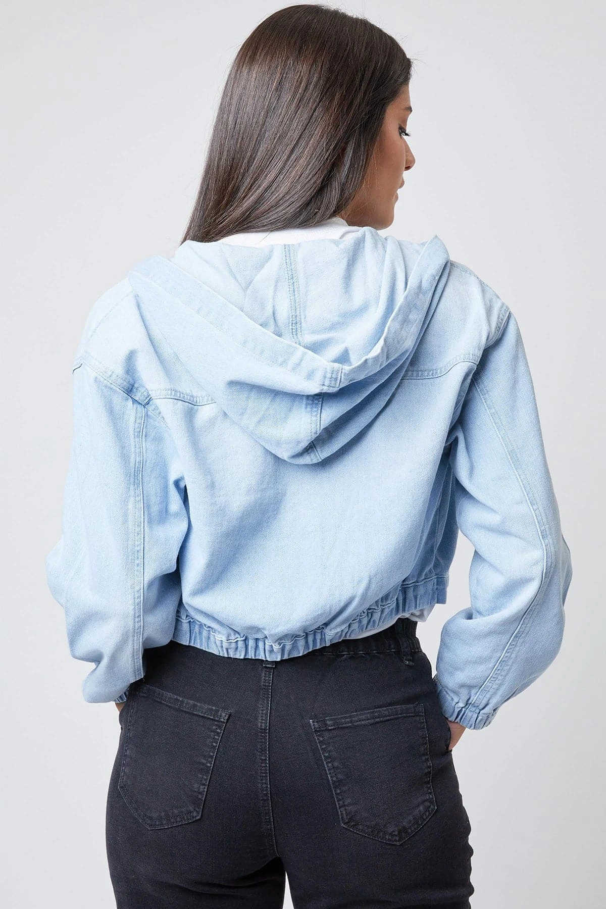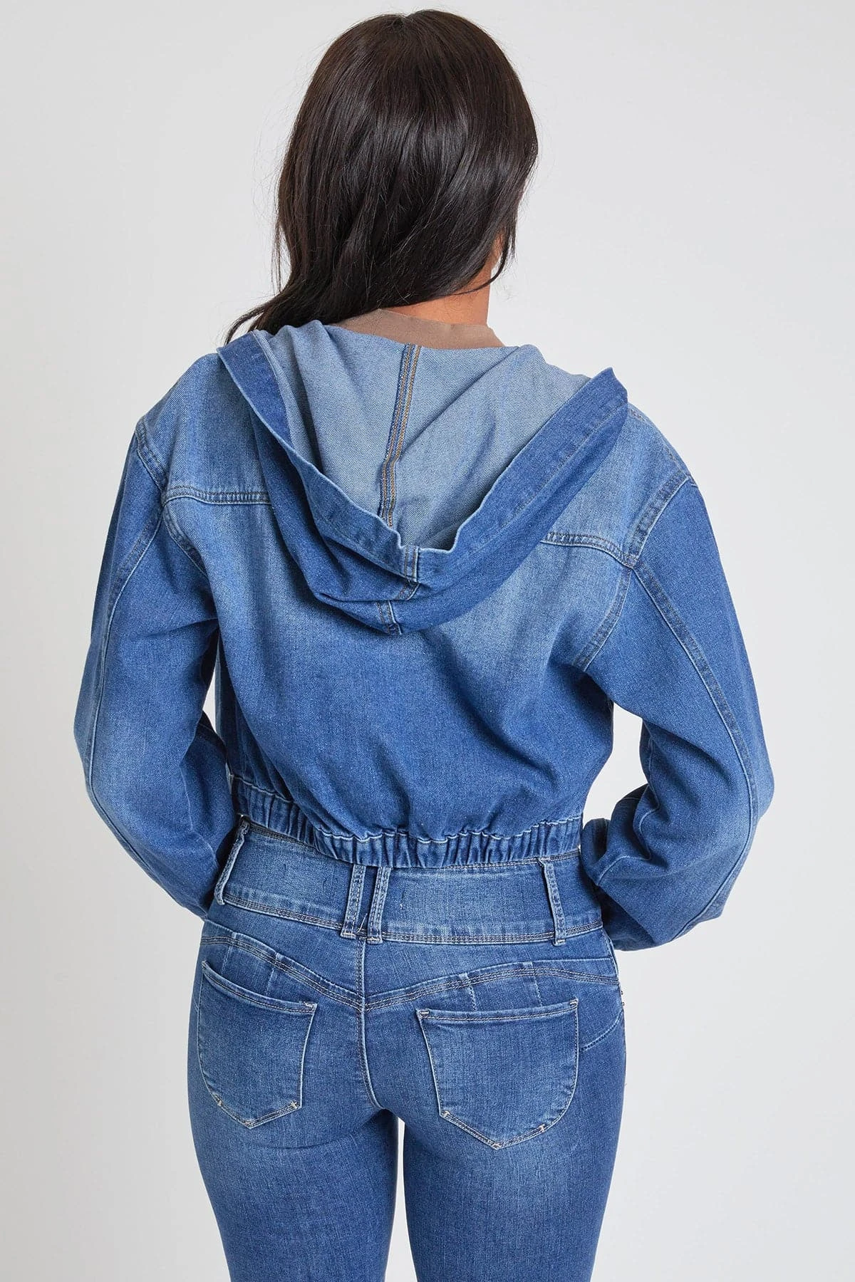 Our Women’s Crop Hooded Denim Jacket features relaxed fit with front summary closure, elastic hem long sleeves, hoodie, and cropped length.