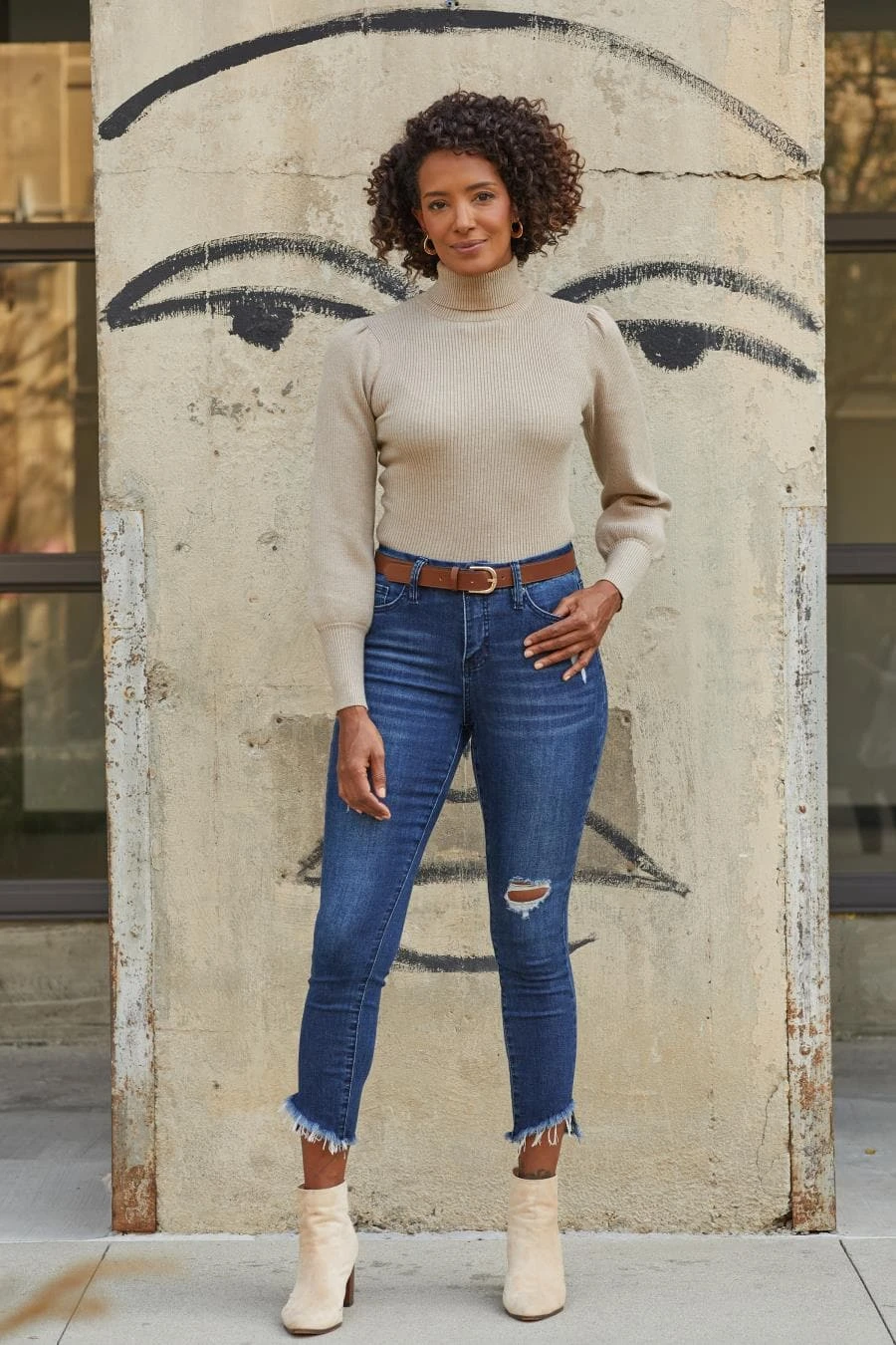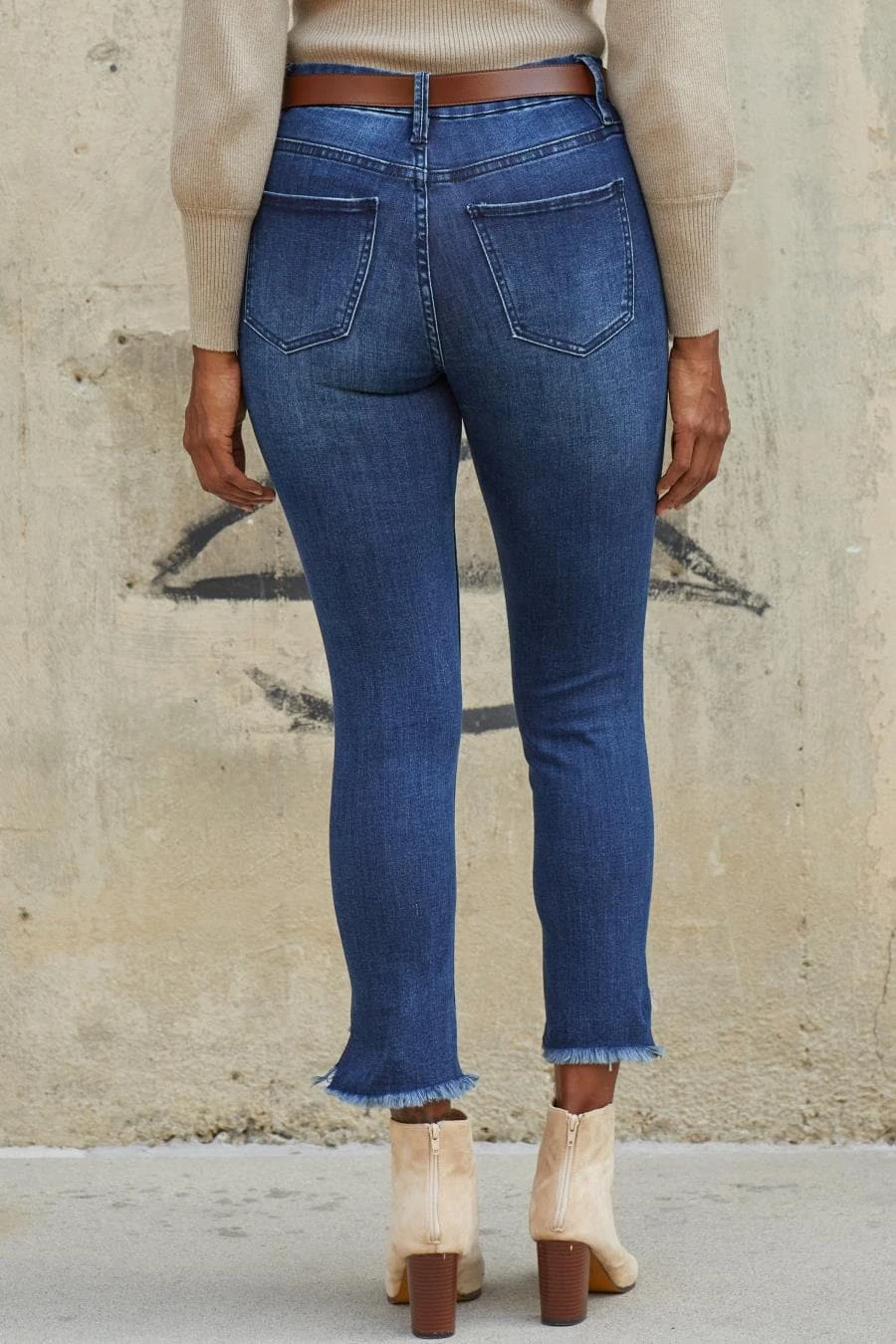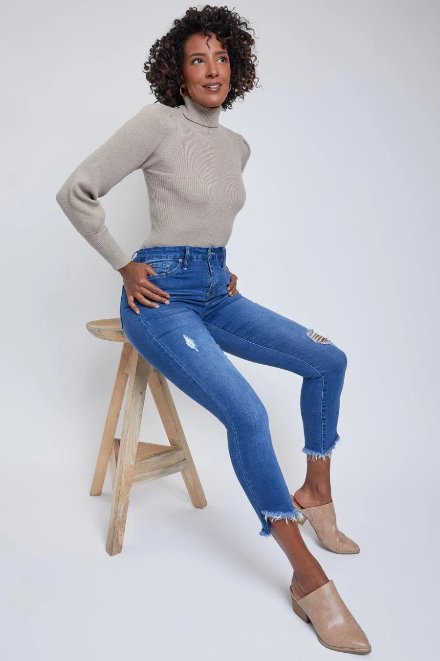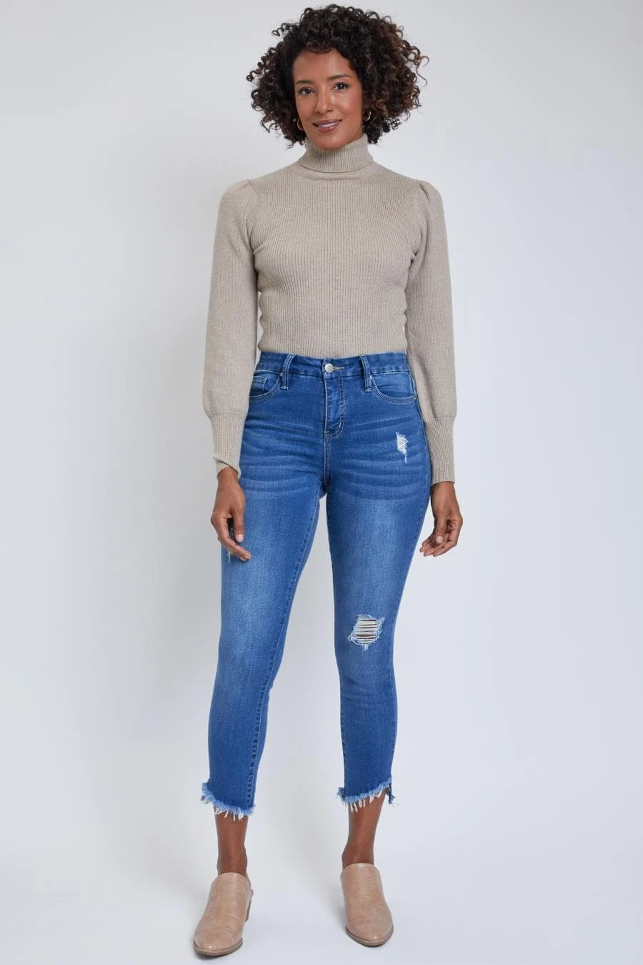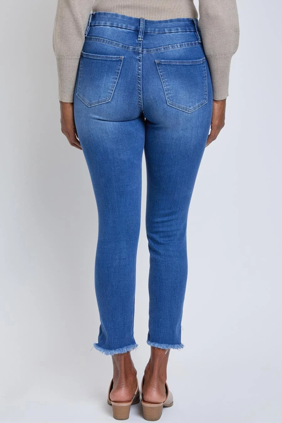 These Women’s Curvy Fit High-Rise Frayed Slanted Ankle Jeans are designed with fading throughout and light destruction for a comfortable and casual look. Featuring a classic five-pocket construction, frayed hem, single-summary closure with front zip, and belt loops.