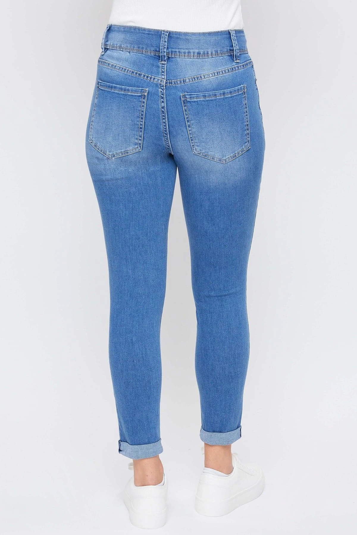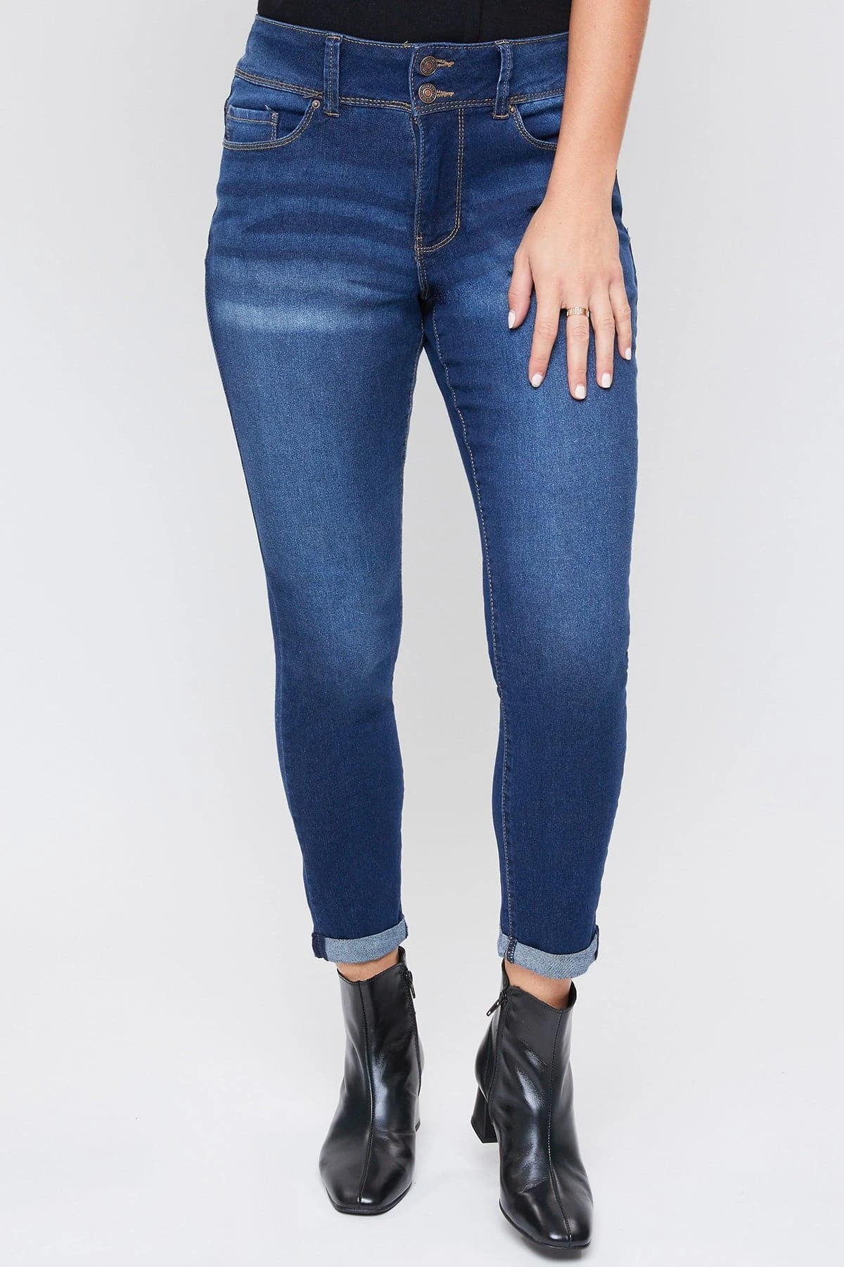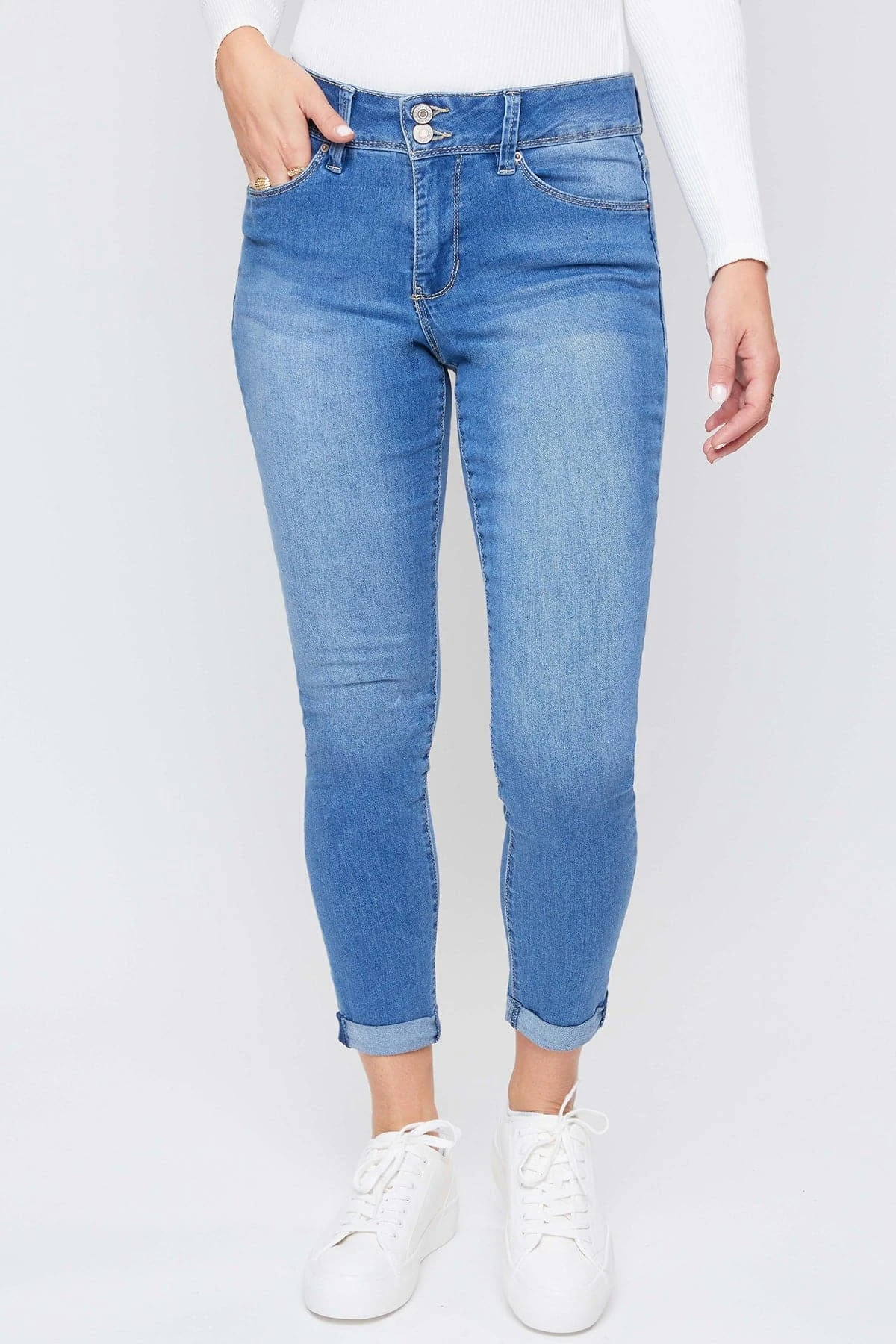 Casual meets cool with our 5 Pocket 2-Button Roll Cuff Ankle Jean With Functional Front Pockets. Designed in a high-rise and with super stretchy denim for the most flattering, comfortable fit. Featuring an exposed 2-summaryfly with zipper for a trendy appeal. We’ve also added some light whiskering, subtle fading, and cuffed hems for a lived-in and effortlessly cool feel. You can wear these casual with a cute tee or tank and flat sandals or sneakers. Or you can dress them up with a blouse and heeled sandals!