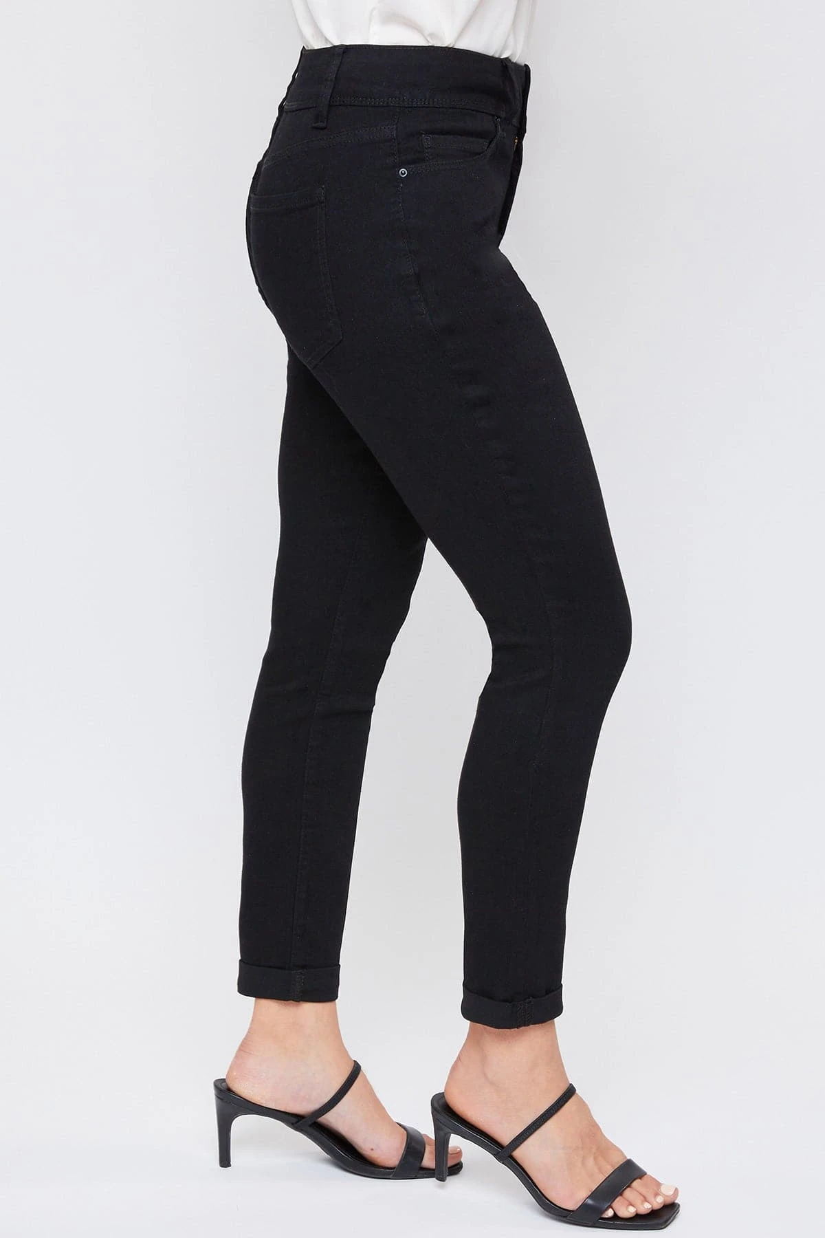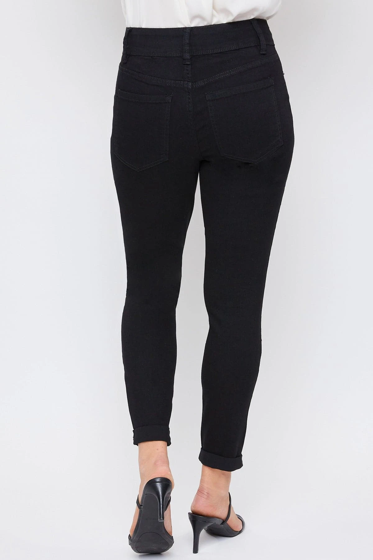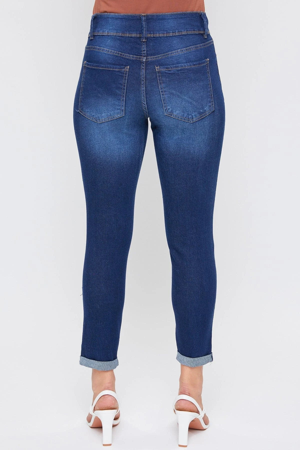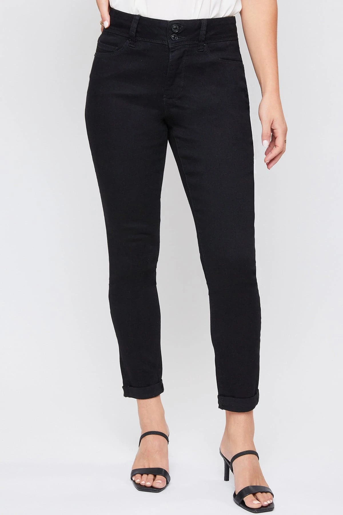 Casual meets cool with our 5 Pocket 2-Button Roll Cuff Ankle Jean With Functional Front Pockets. Designed in a high-rise and with super stretchy denim for the most flattering, comfortable fit. Featuring an exposed 2-summaryfly with zipper for a trendy appeal. We’ve also added some light whiskering, subtle fading, and cuffed hems for a lived-in and effortlessly cool feel. You can wear these casual with a cute tee or tank and flat sandals or sneakers. Or you can dress them up with a blouse and heeled sandals!