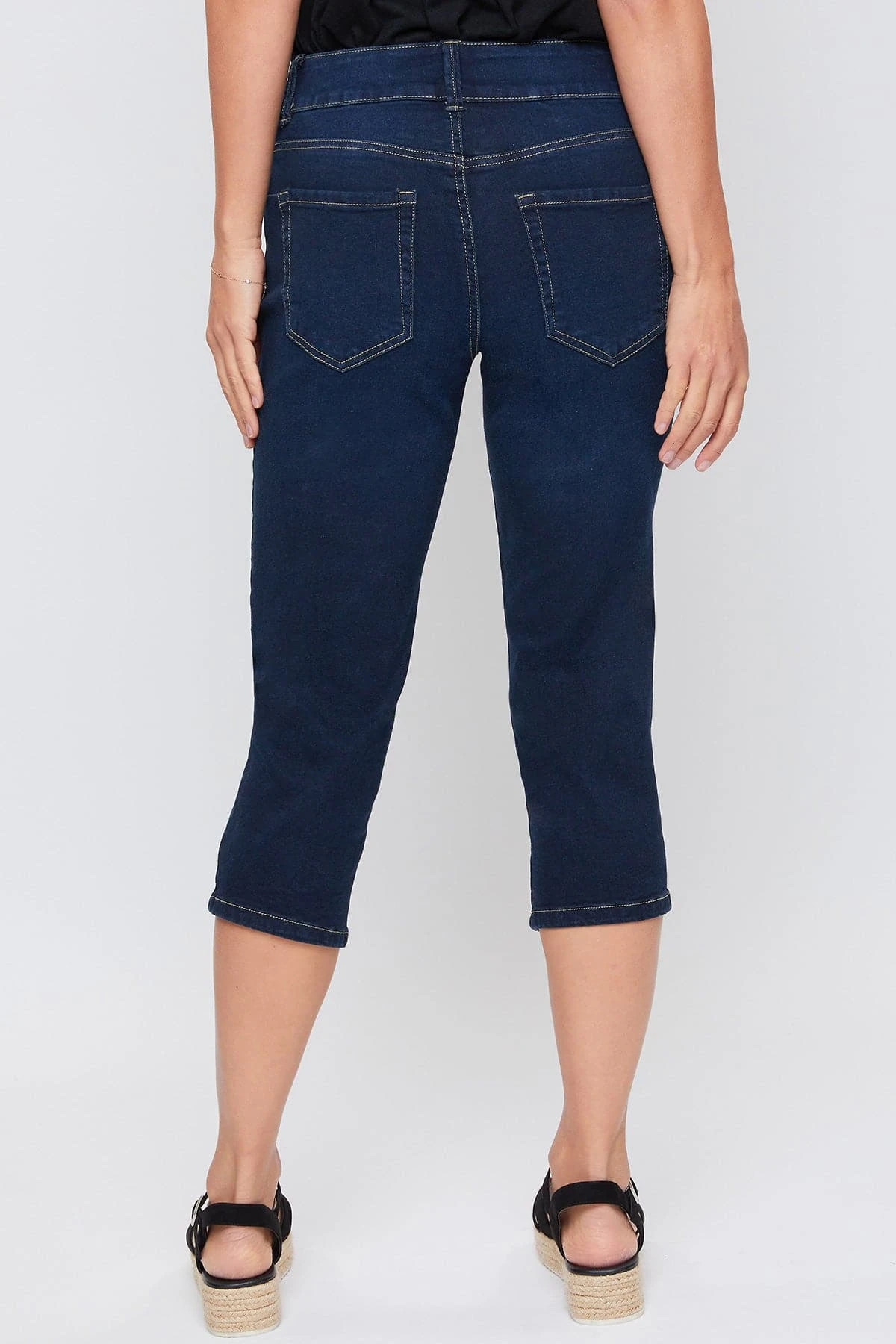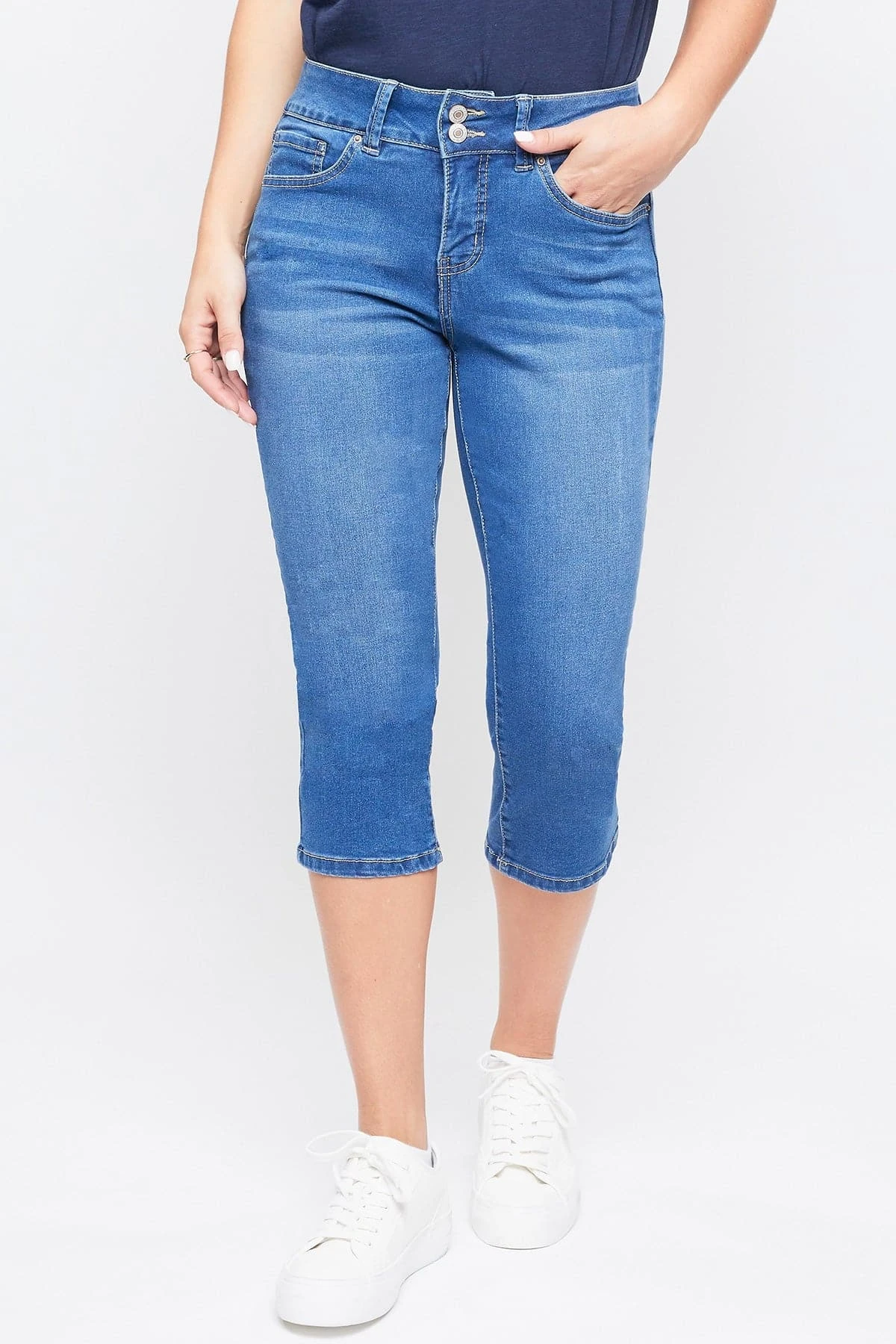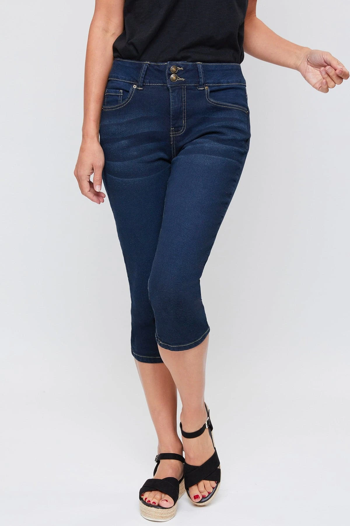 Perfect for any day, our Women’s Essential High-Rise 2-Button Slim Stretch Capri is cute and comfortable! Featuring a high-rise for a comfortable and flattering fit. Designed with a 2-summary closure with zipper to add trendy element. These are made with super soft and stretchy denim so they move with you. These are a capri length so they fall just below the knee. Pair them with a cami or blouse and some sandals for an effortless look!
