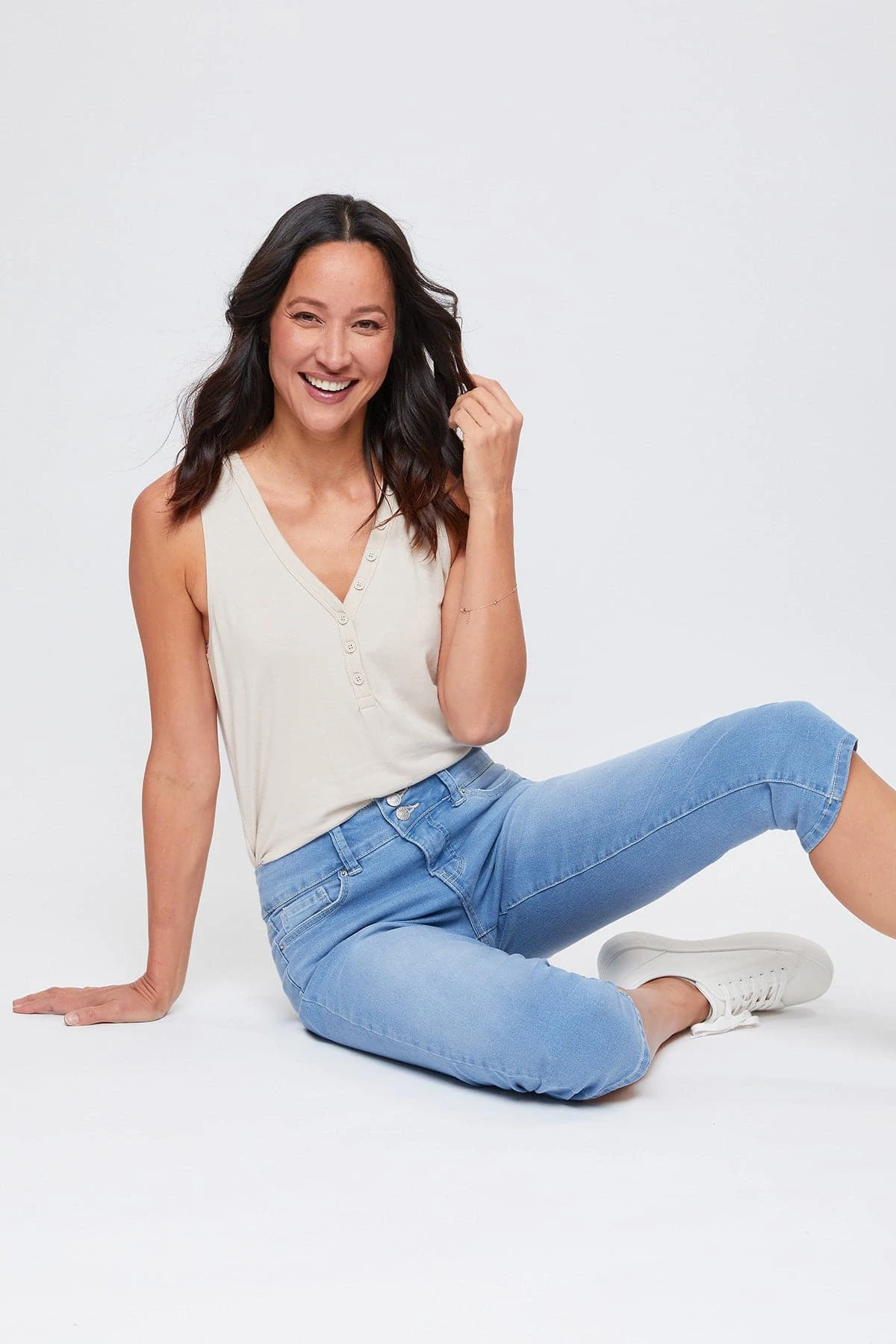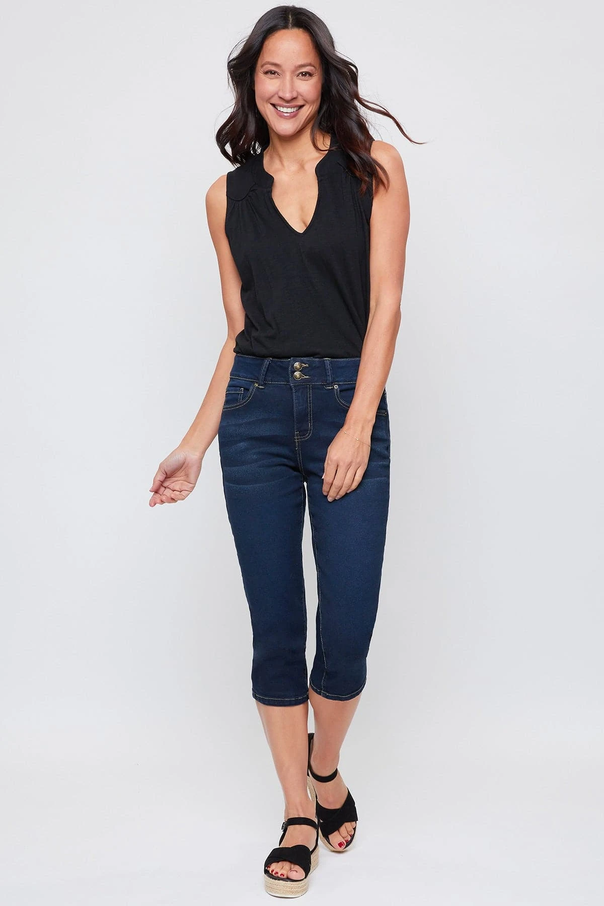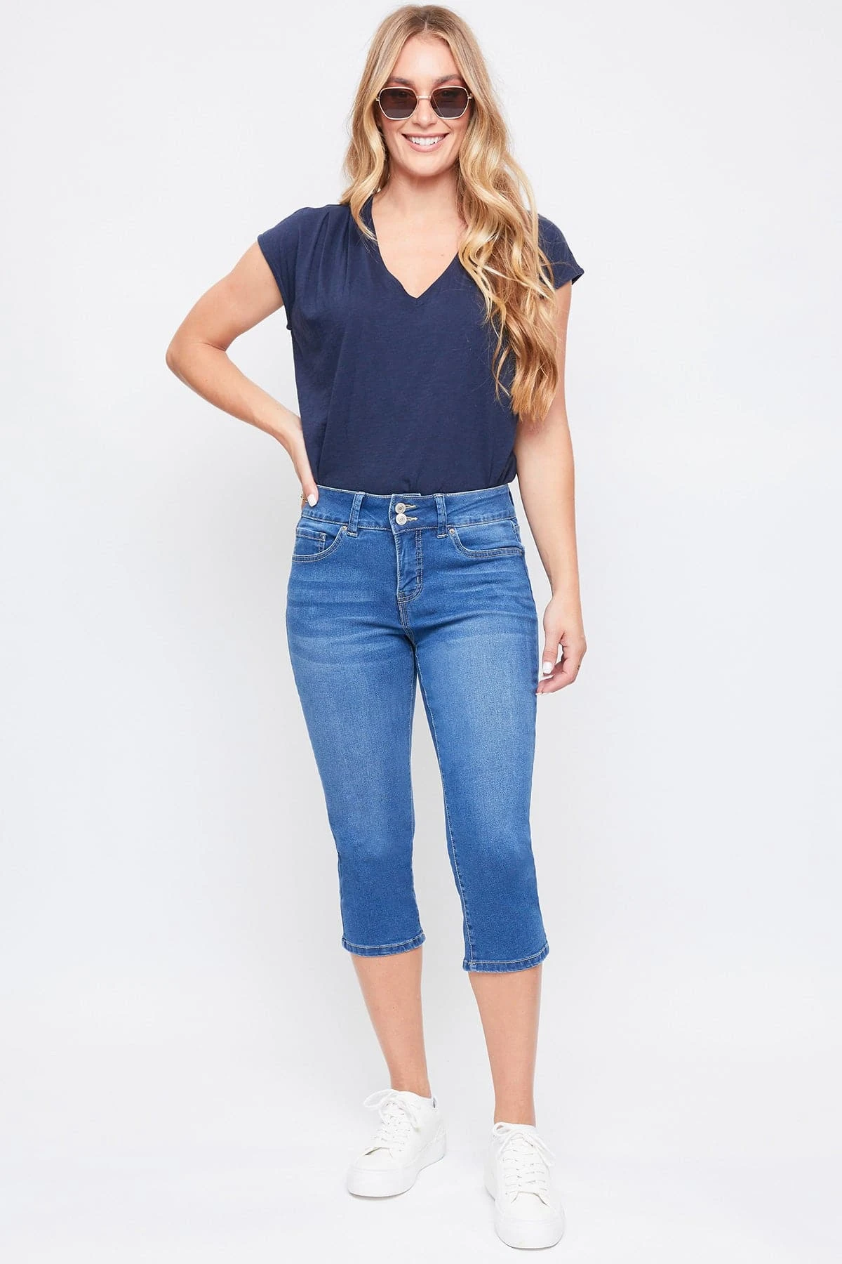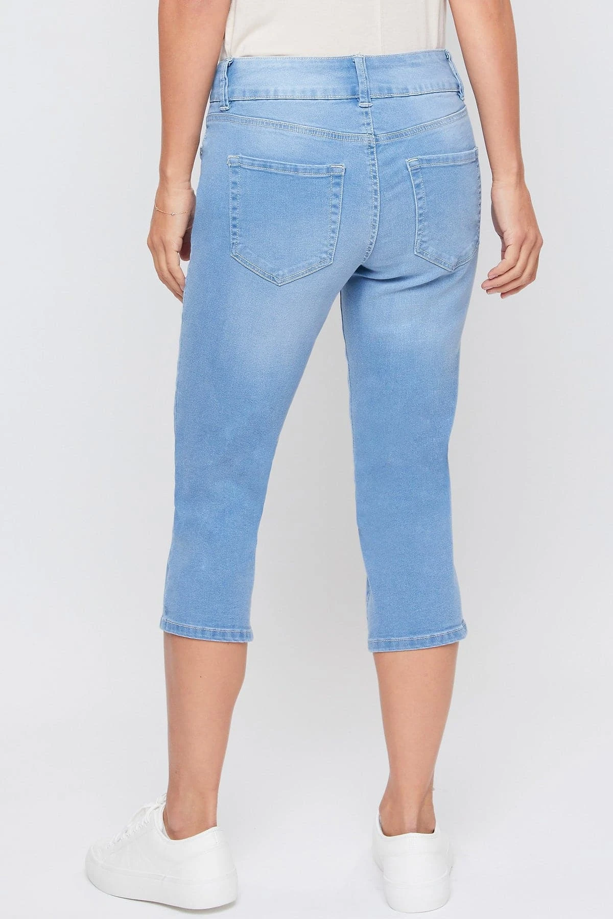 Perfect for any day, our Women’s Essential High-Rise 2-Button Slim Stretch Capri is cute and comfortable! Featuring a high-rise for a comfortable and flattering fit. Designed with a 2-summary closure with zipper to add trendy element. These are made with super soft and stretchy denim so they move with you. These are a capri length so they fall just below the knee. Pair them with a cami or blouse and some sandals for an effortless look!