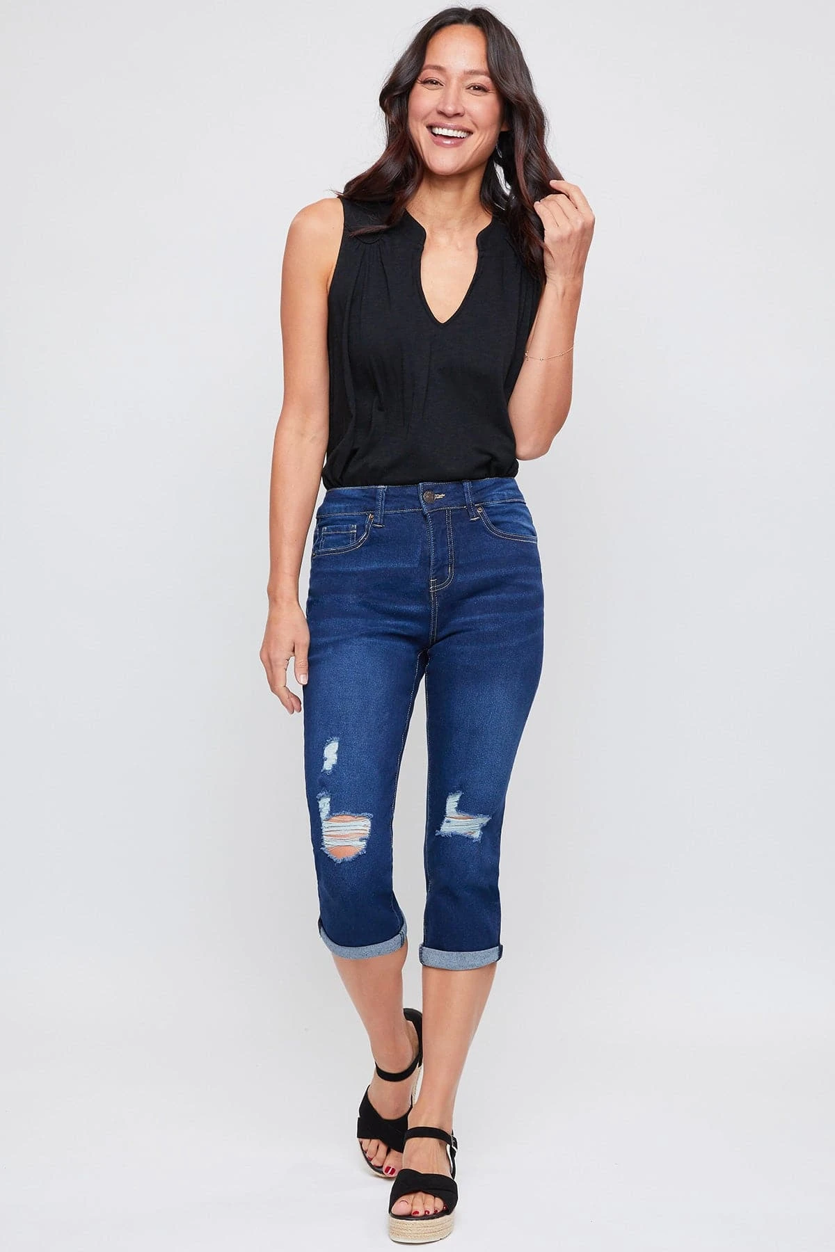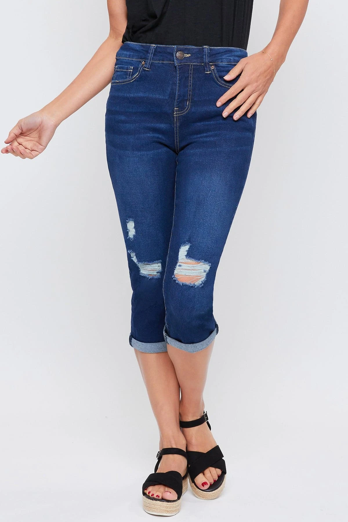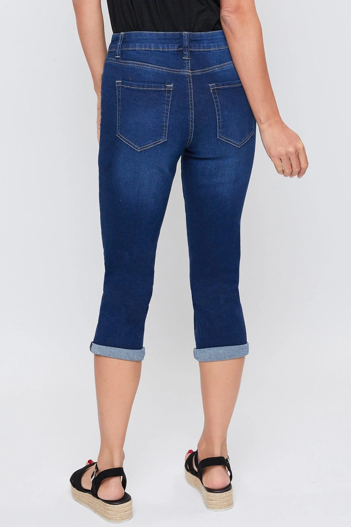 Channel your effortless style in our Women’s Essential High Rise Cuffed Capri Jeans. These denim pants feature a flattering high waist and are cropped right below the knee with an untacked, double rolled cuff. Style with your favorite tank and heeled sandals for a look worthy of springtime.