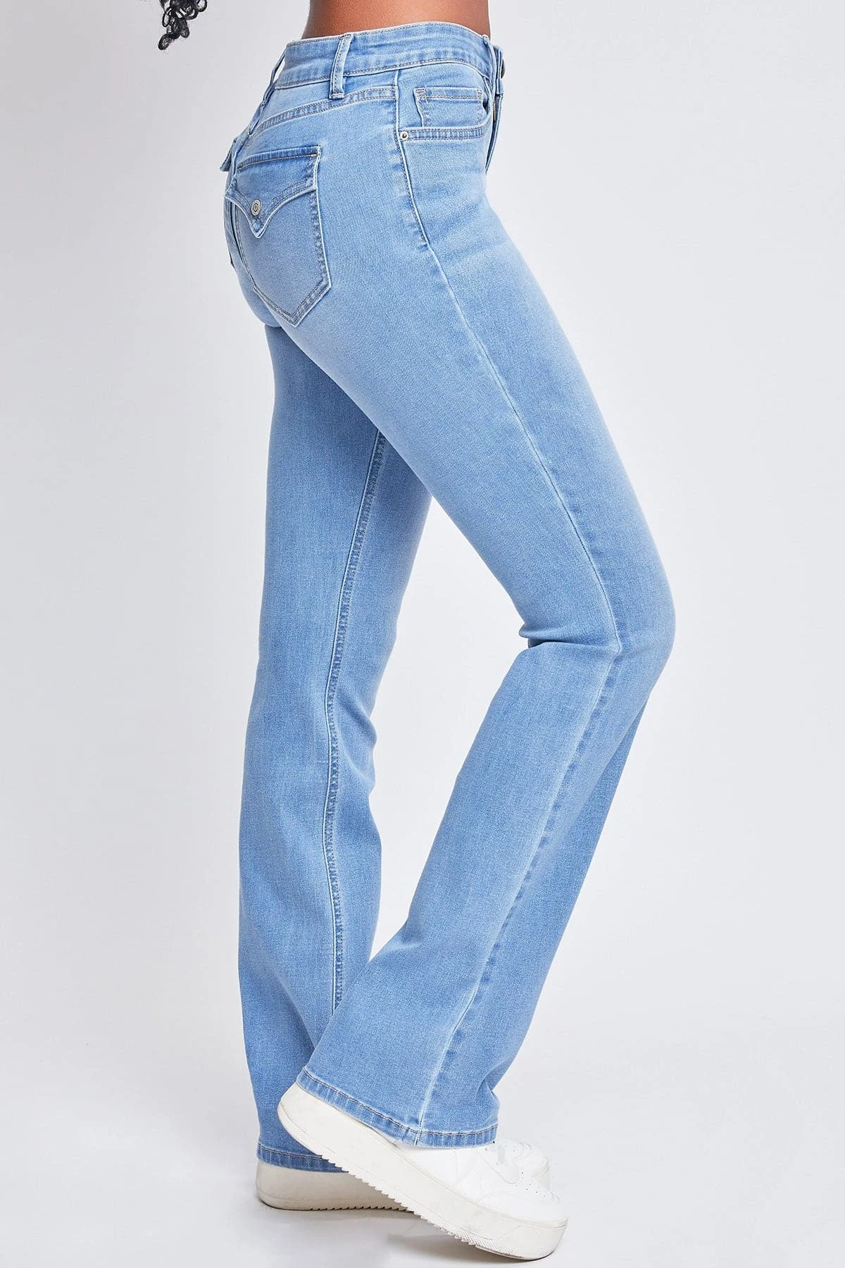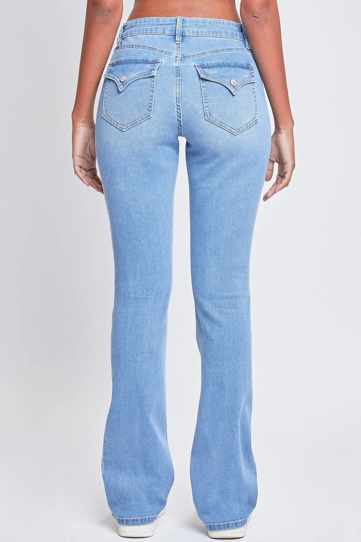Give your old jeans the boot and scoot into our Women’s Mid-Rise Bootcut Jeans. Constructed with midweight stretchy denim, this stylish mid-waisted jean is fitted from the hip through the thigh and flares out slightly from knee to hem for a dreamy bootcut silhouette. Detailed with a classic five-pocket construction, a zip fly with summary closure, and the cutest flap back pockets with snap summarys. Style with your favorite fitted top and sassiest boots for a look that’ll make a statement.