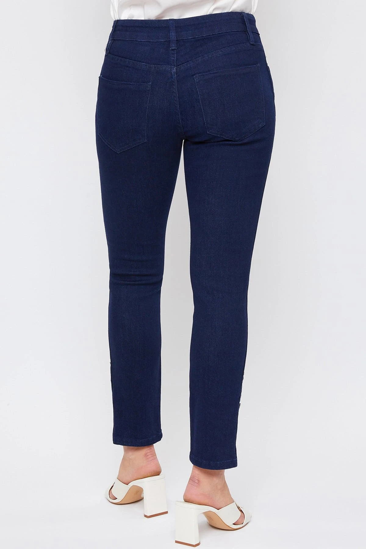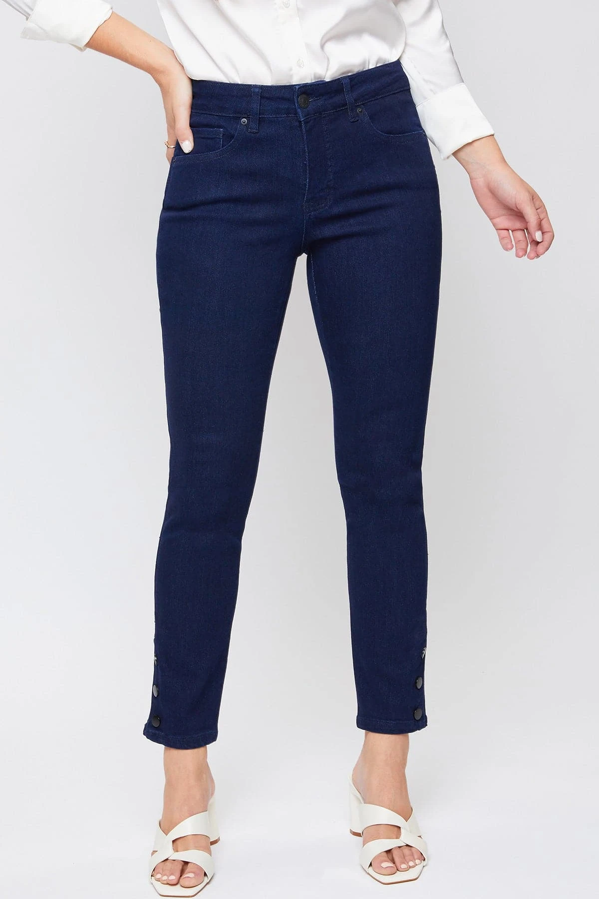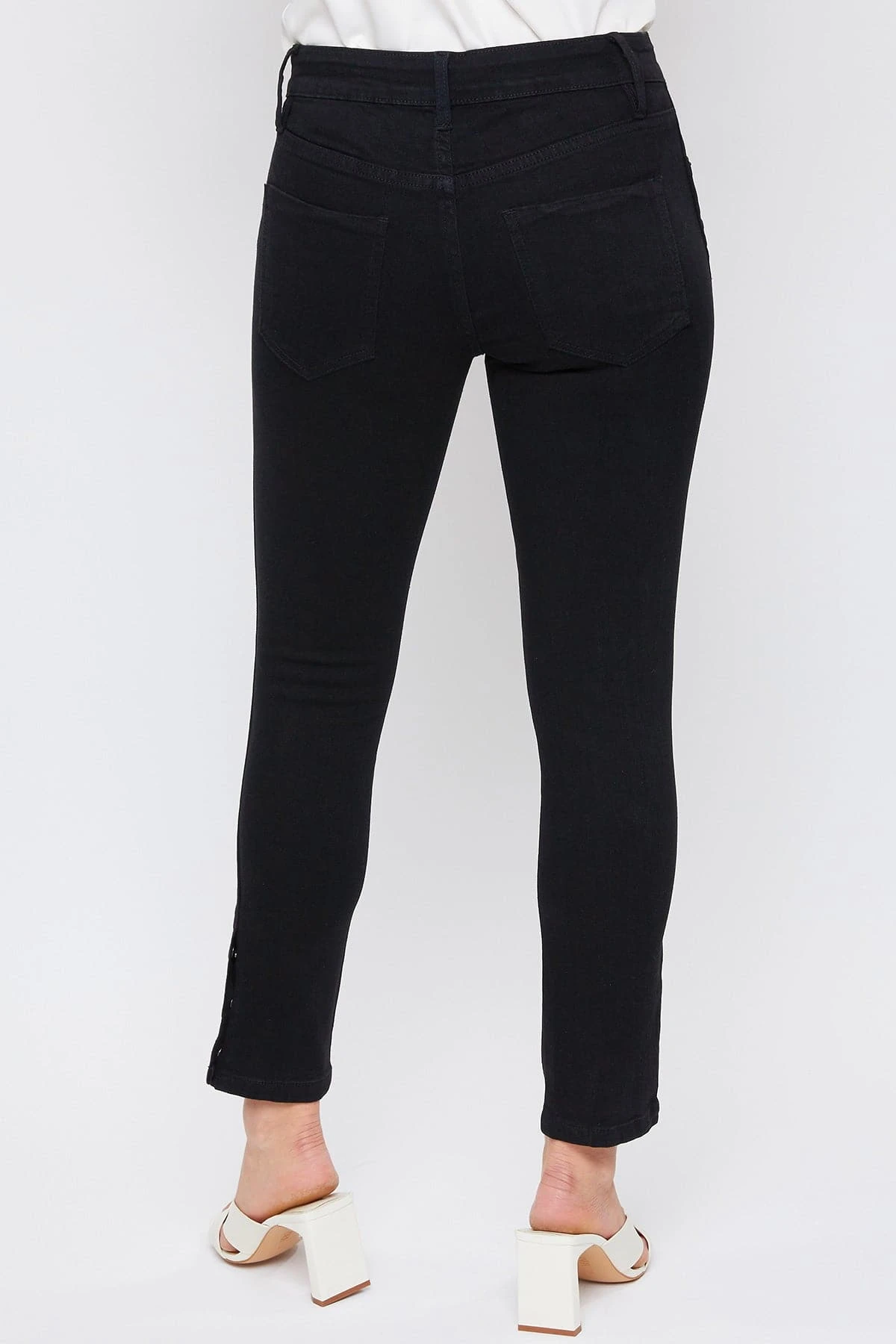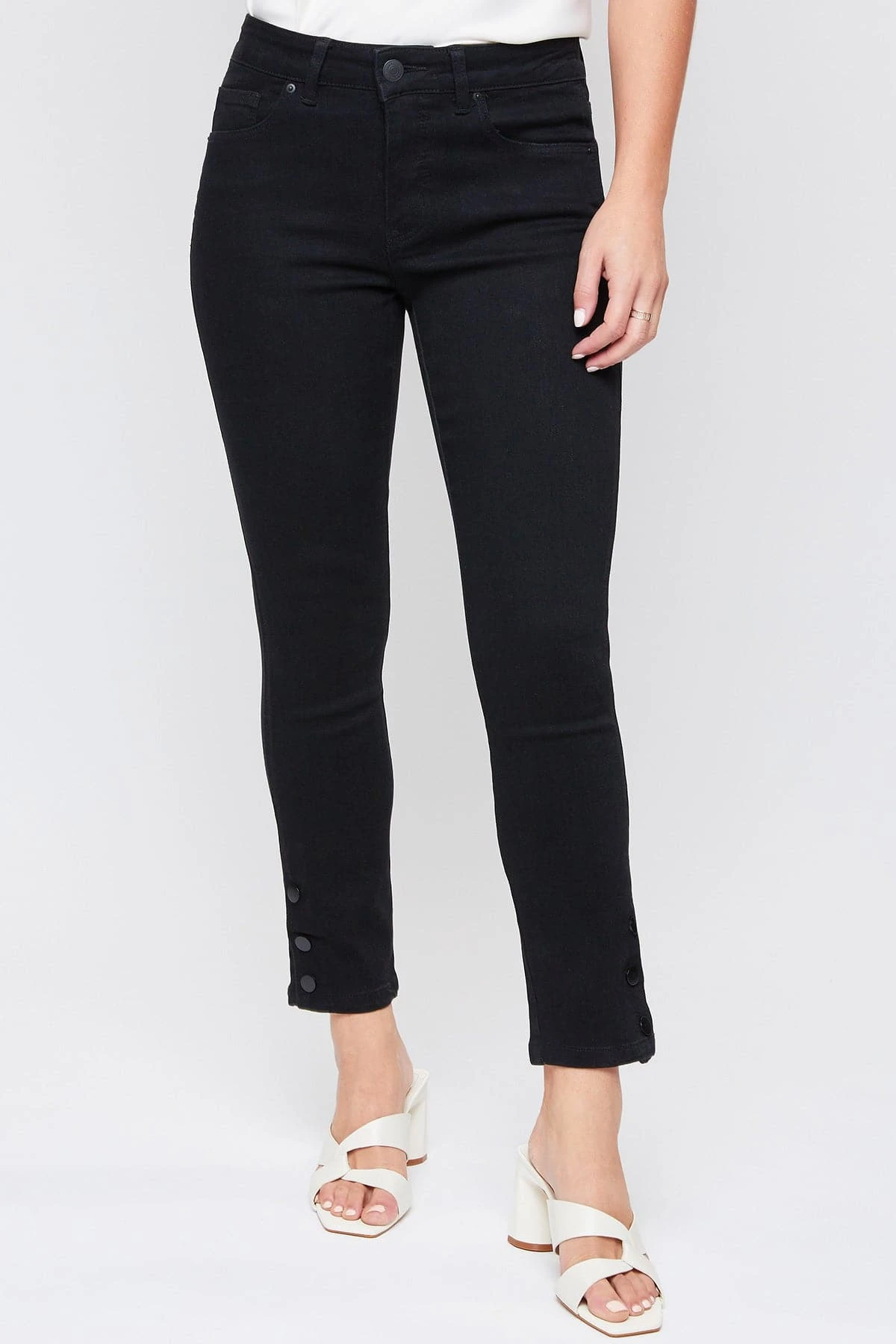 A trendy update on your basic black skinnies! Our Fashion First Mid-Rise Ankle Skinny Jean with Side Snaps adds a little bit of edge to your look! Featuring a mid-rise that sits comfortably between your hips and your belly summary. Designed with 3 side snaps at each ankle that you can keep closed to maintain the skinny leg, or you can unsummary them for a side-slit. Style these with a blouse, simple jewelry, and your favorite heels for an effortlessly chic look!
