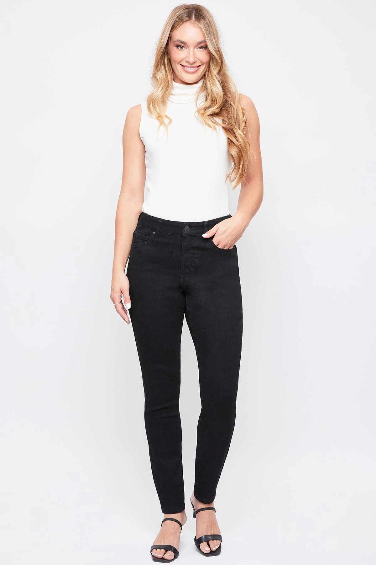 You shouldn’t have to sacrifice comfort for style – and with our Women’s High-Rise Skinny Jeans with Adjustable Back, you won’t have to. These high-rise skinny jeans are made with stretchy denim and are designed with an adjustable back so you can fit them to your liking. Detailed with front fading and a clean hem. Style with a front tucked blouse and heeled sandals for a sophisticated look that will take you from day to night.
