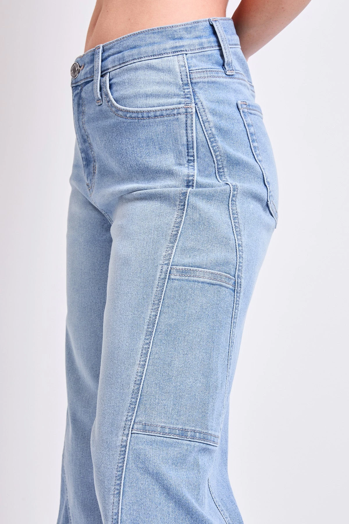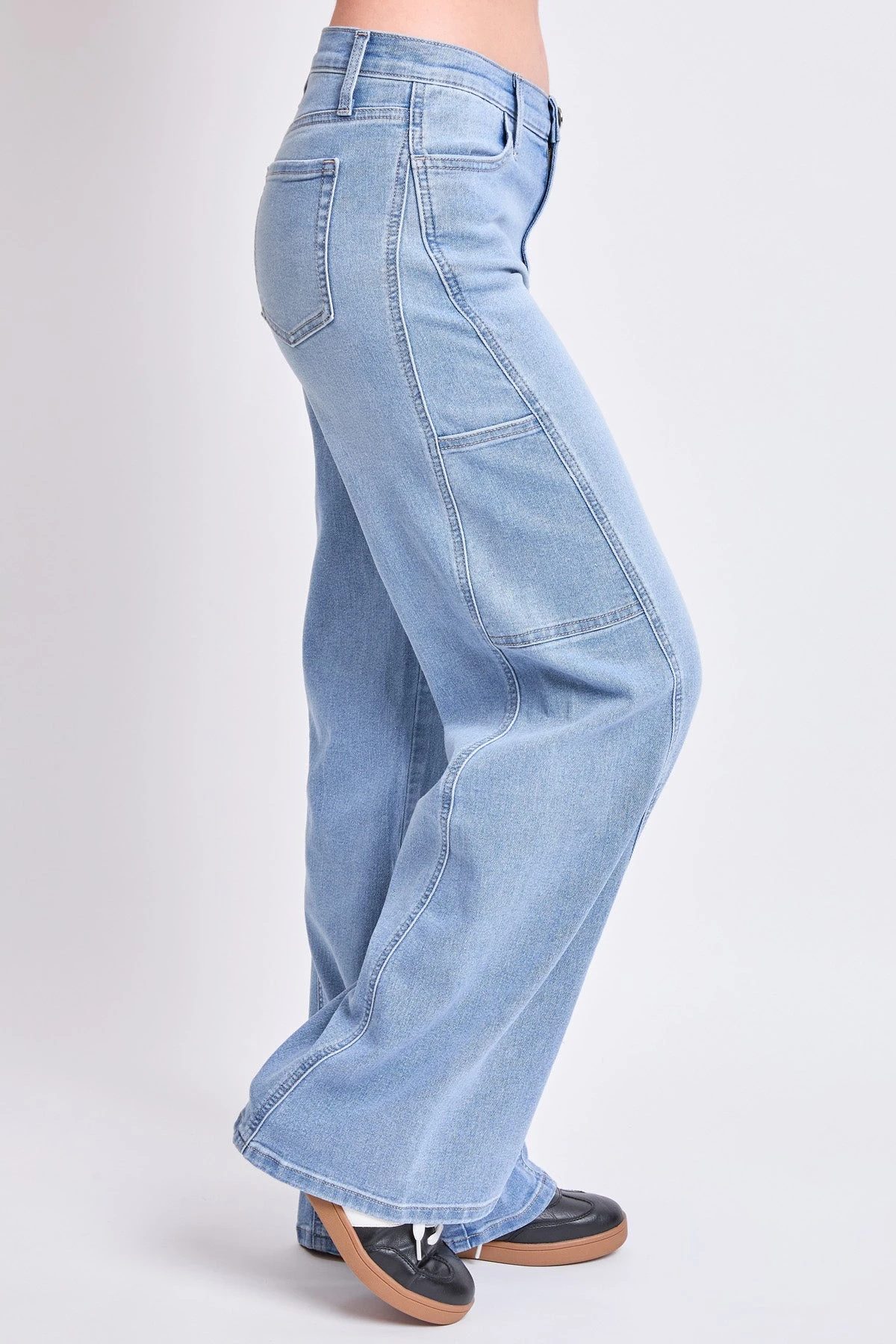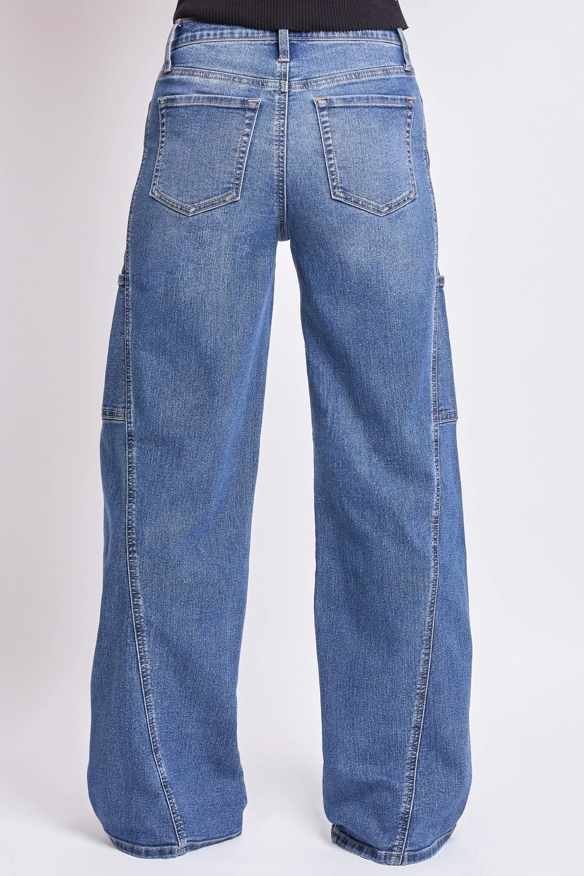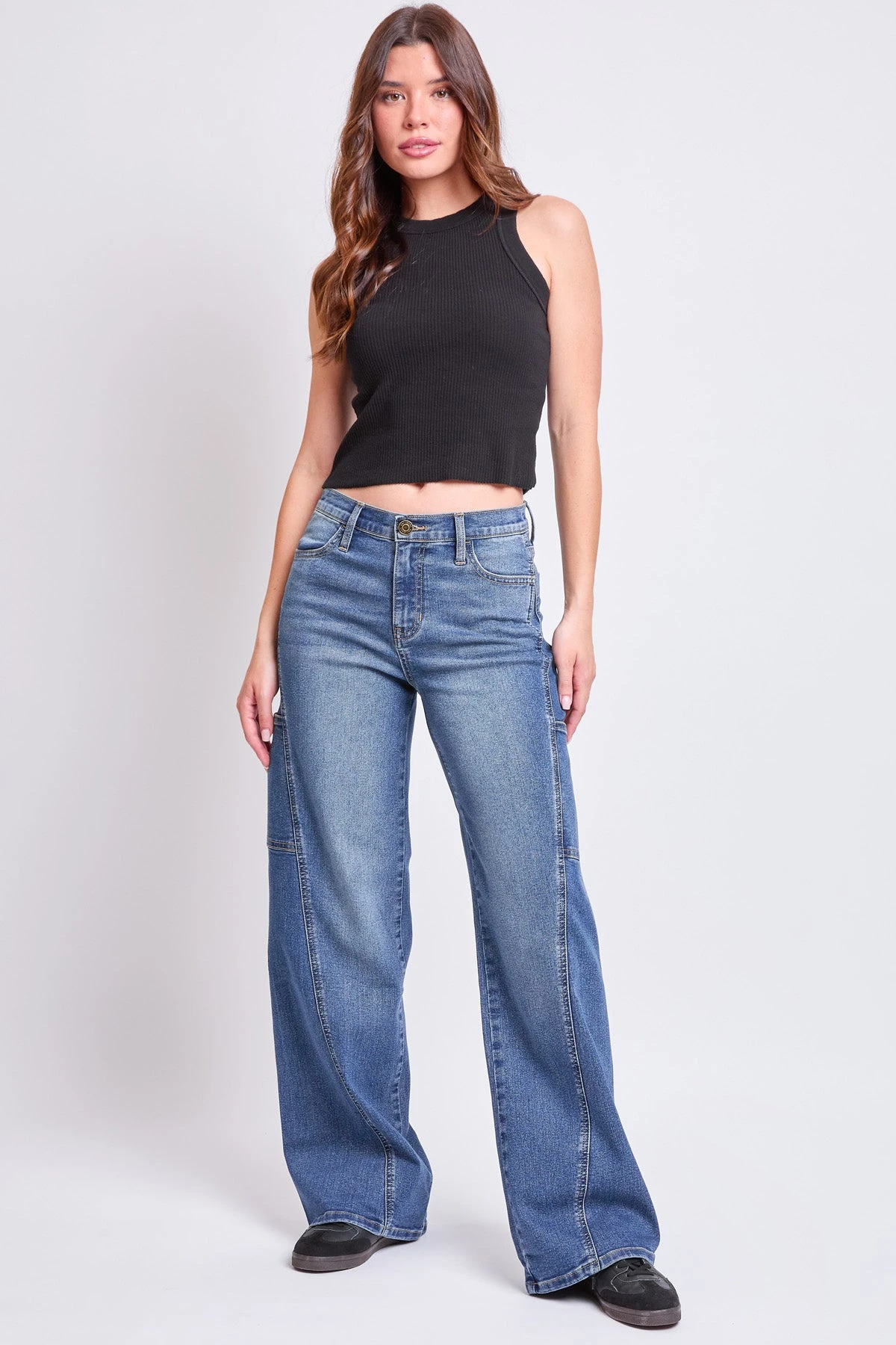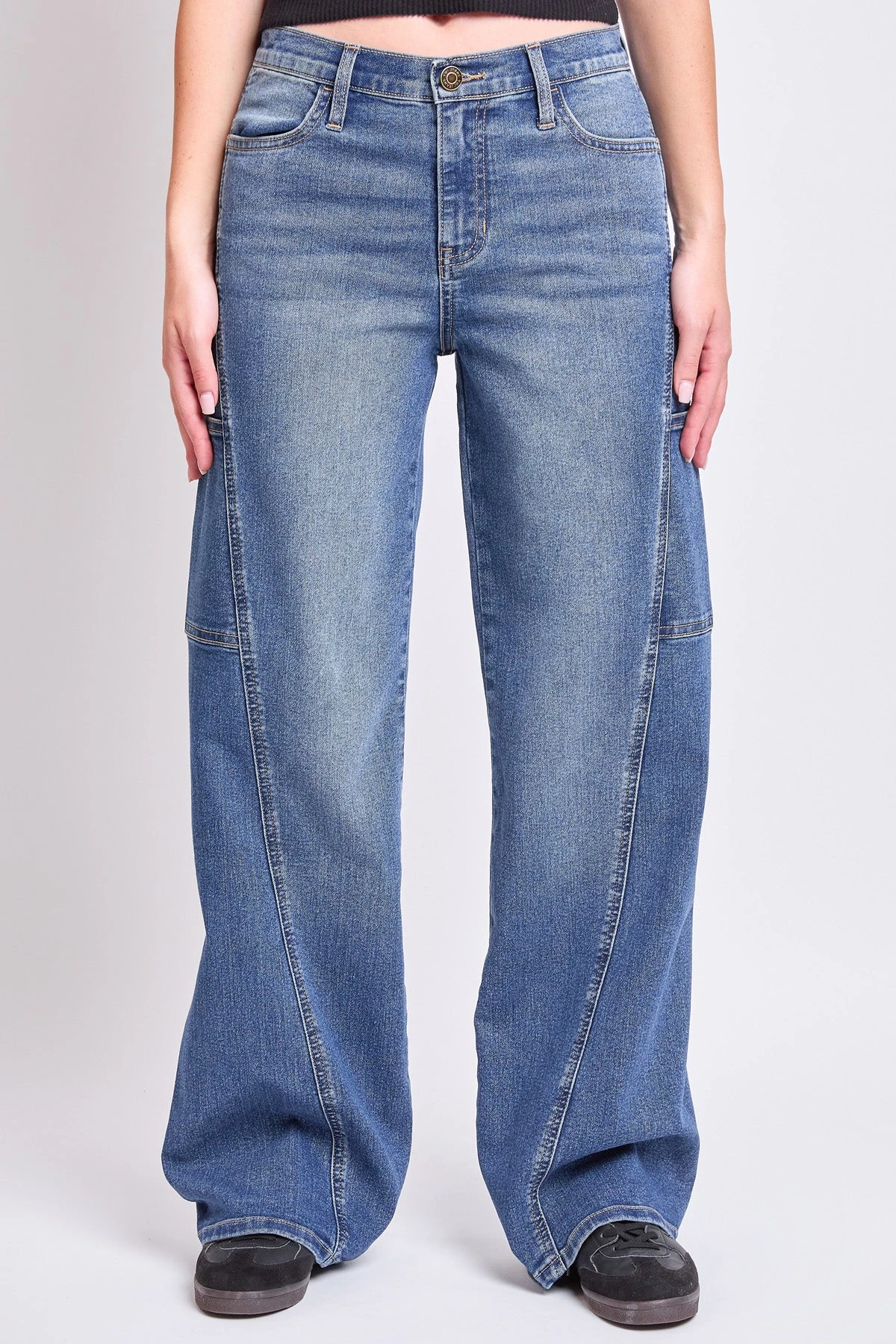 These Women’s High Rise Wide Leg Cargo Jeans combine a flattering high-rise fit with a bold, relaxed silhouette for a modern take on classic cargo style. Featuring unique angled seaming that adds a touch of structure and dimension, these jeans are designed to stand out. The side seam cargo pockets provide both function and flair, offering plenty of space for essentials while keeping the look sleek and streamlined. Perfect for pairing with anything from fitted tops to oversized jackets, these jeans are versatile enough to take you through the day with effortless style.