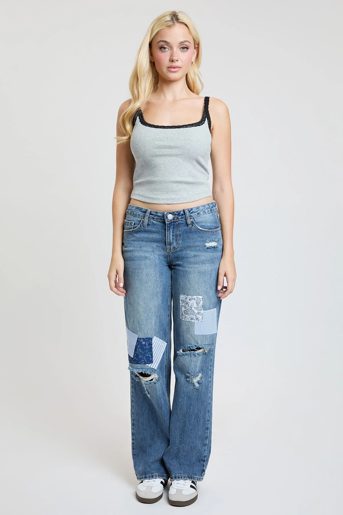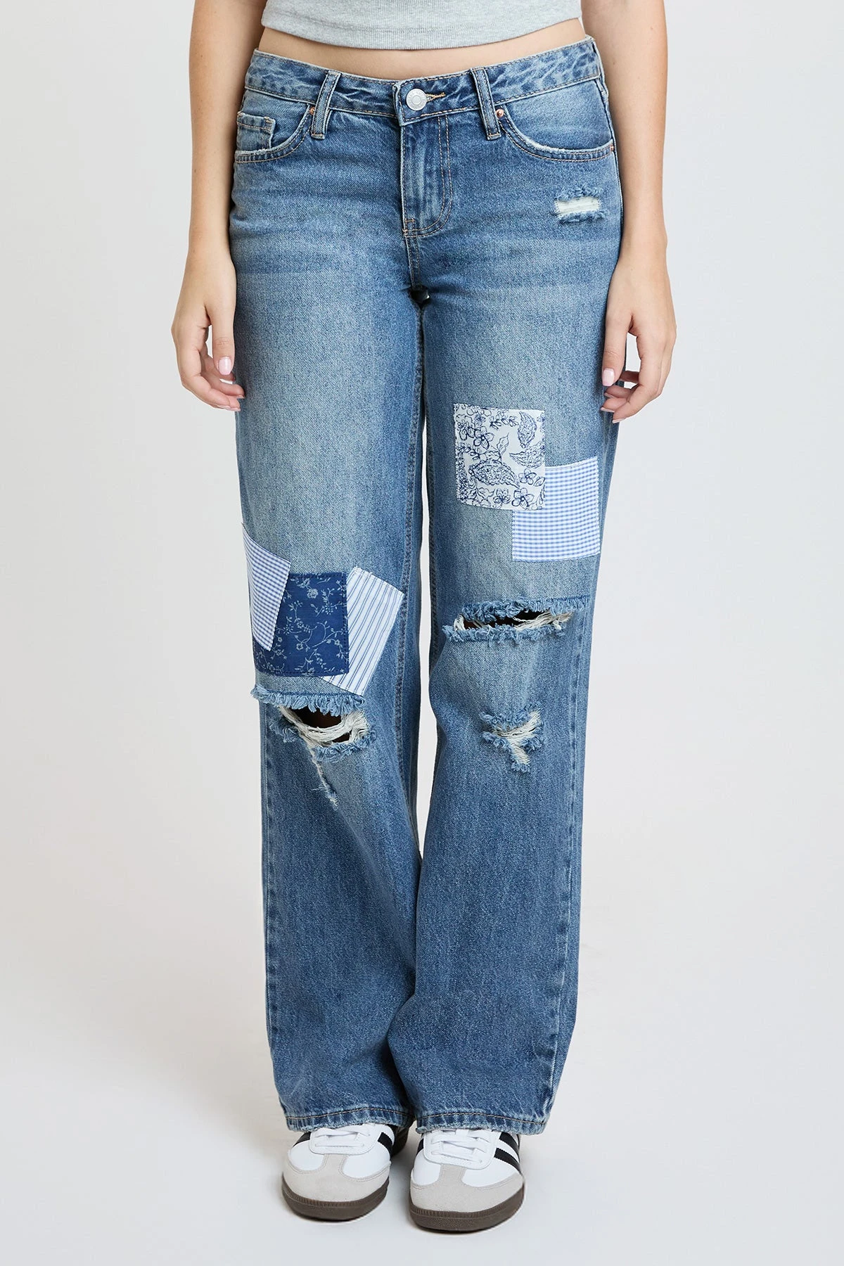Add a bold touch to your denim collection with these Women’s Low Rise Patchwork Straight Leg Jeans. Featuring unique patchwork distressing, they bring a stylish edge to a classic straight leg fit. Designed with a low rise for a modern look, these jeans include belt loops and a summary and zipper fly for easy wear.
