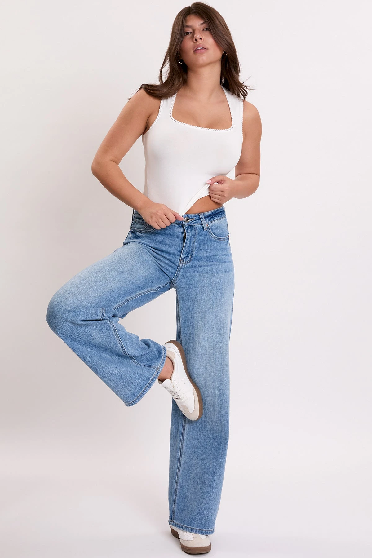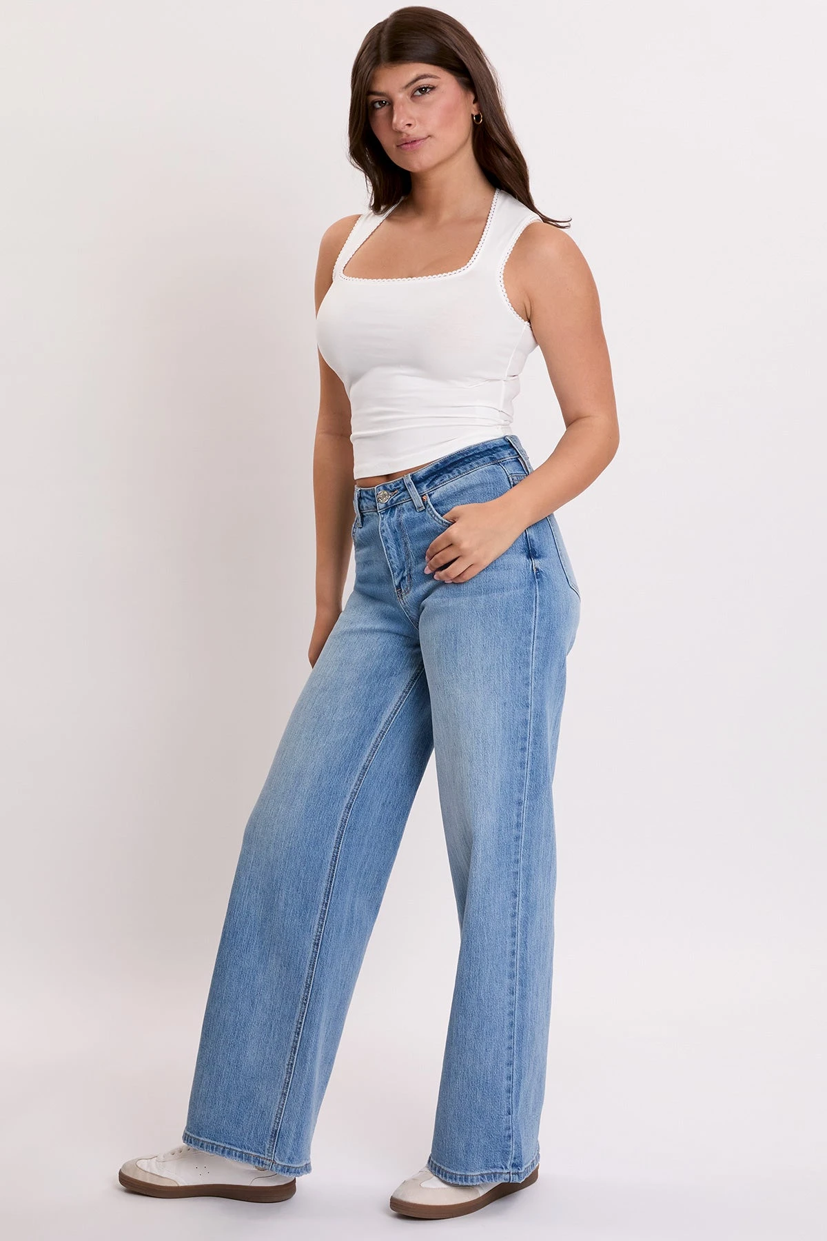 The Women’s Bella High Rise Wide Luxe Leg Jeans offer the perfect blend of flattering fit and relaxed style. Designed to be fitted through the hip and thigh, these jeans accentuate your curves while maintaining a wide, flowy silhouette from the knee down for an effortless look. The high-rise waist provides a smooth, elongated shape, while the wide-leg cut gives you the freedom to move comfortably. Whether you’re dressing up with a blouse or keeping it casual with a tucked-in tee, these jeans are a versatile addition to any wardrobe.
