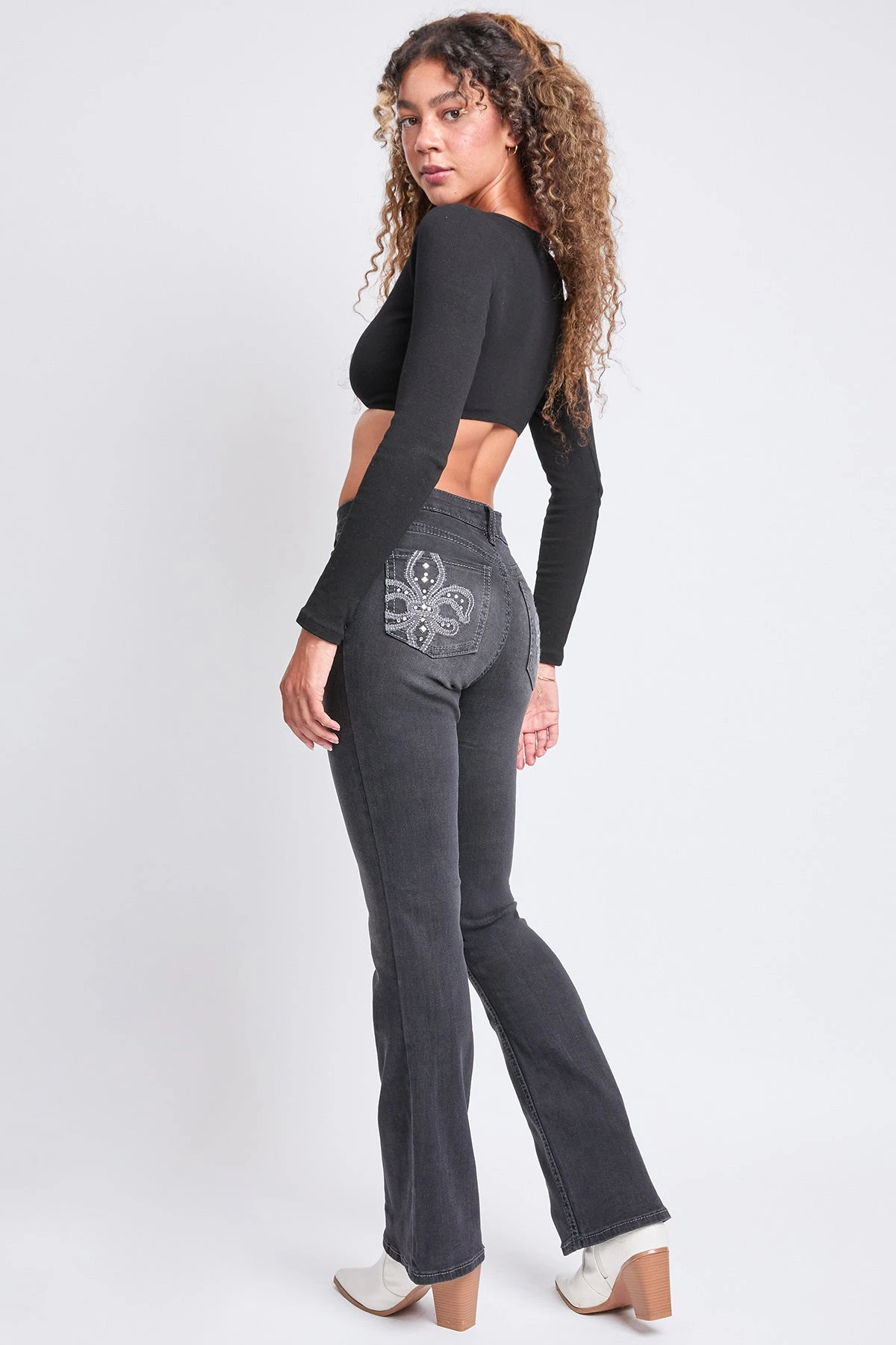 Women’s Mid Rise Studded Fleur De Lis Bootcut Jeans by YMI Jeans, where timeless elegance meets modern edge. These jeans are crafted with attention to detail, offering a sophisticated blend of classic bootcut style and eye-catching embellishments.
