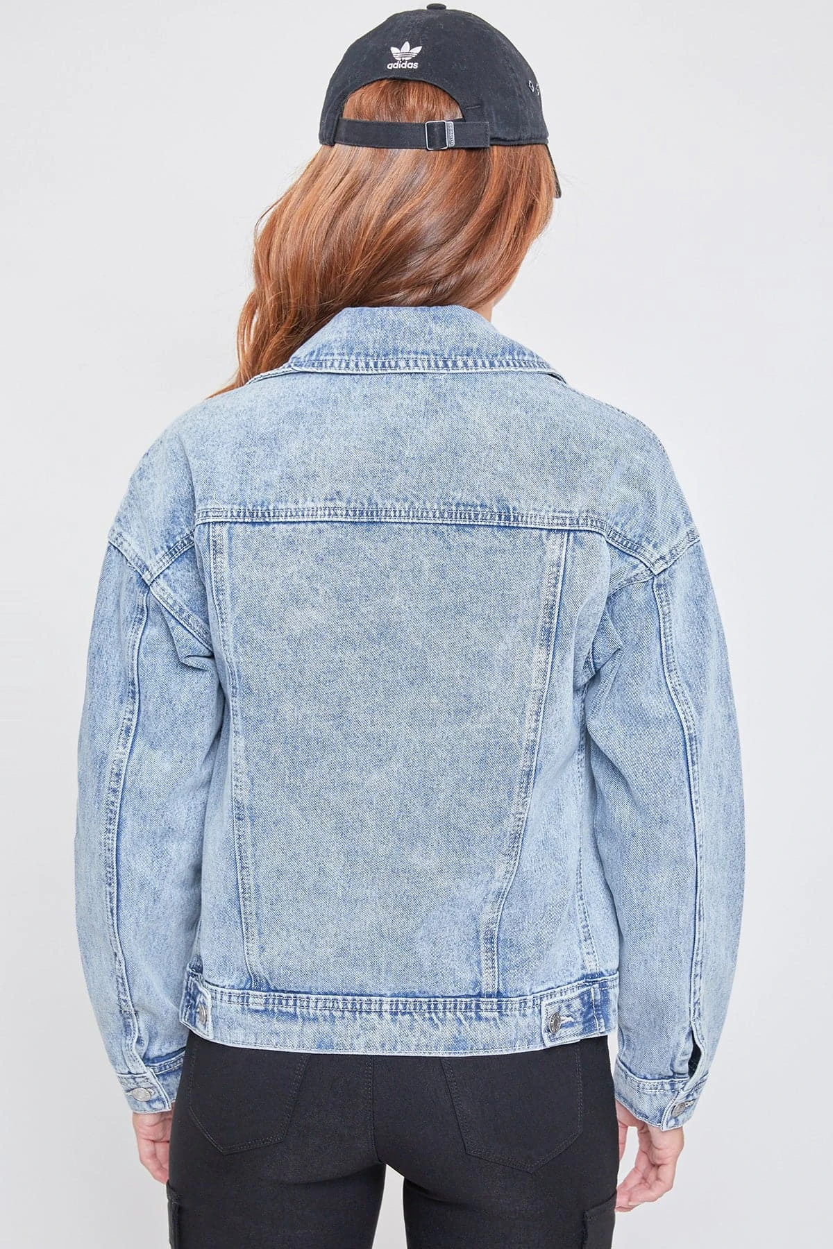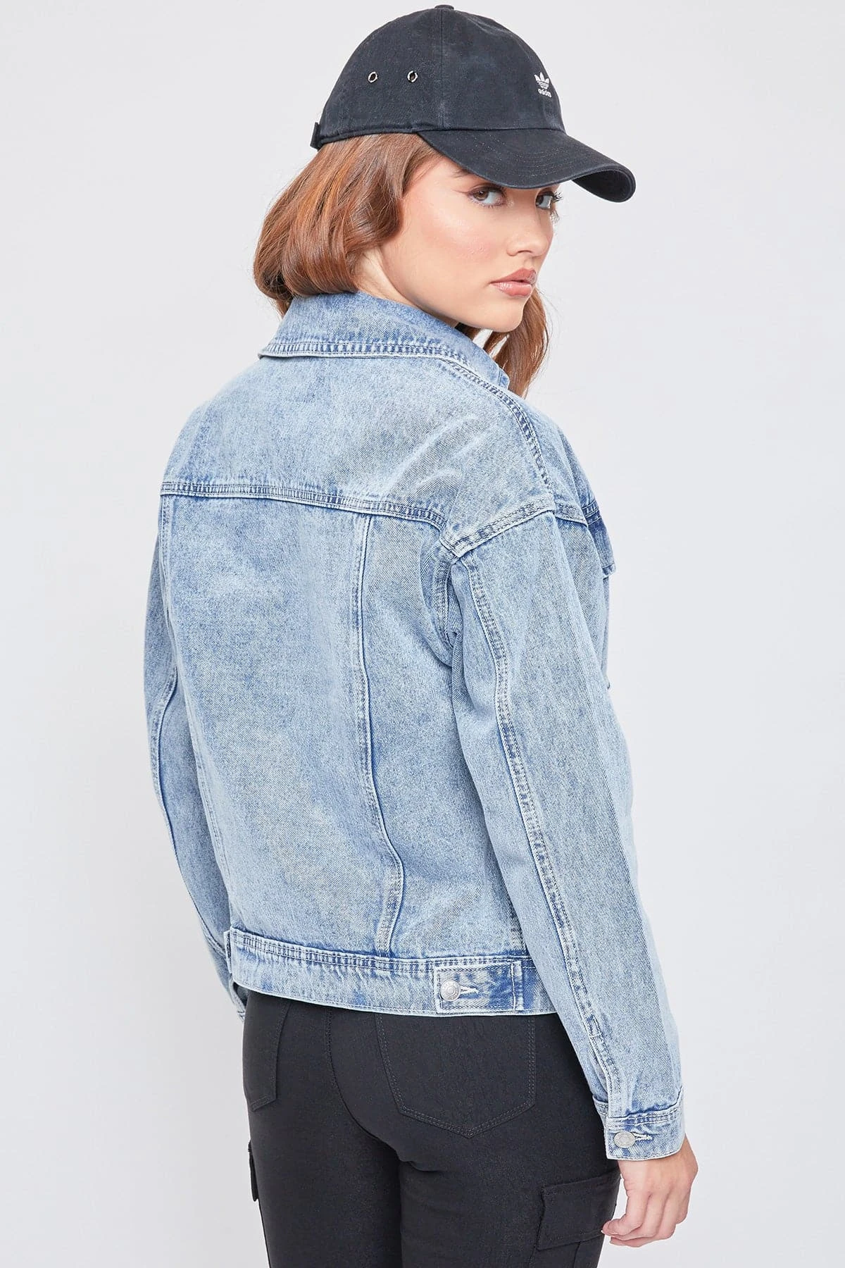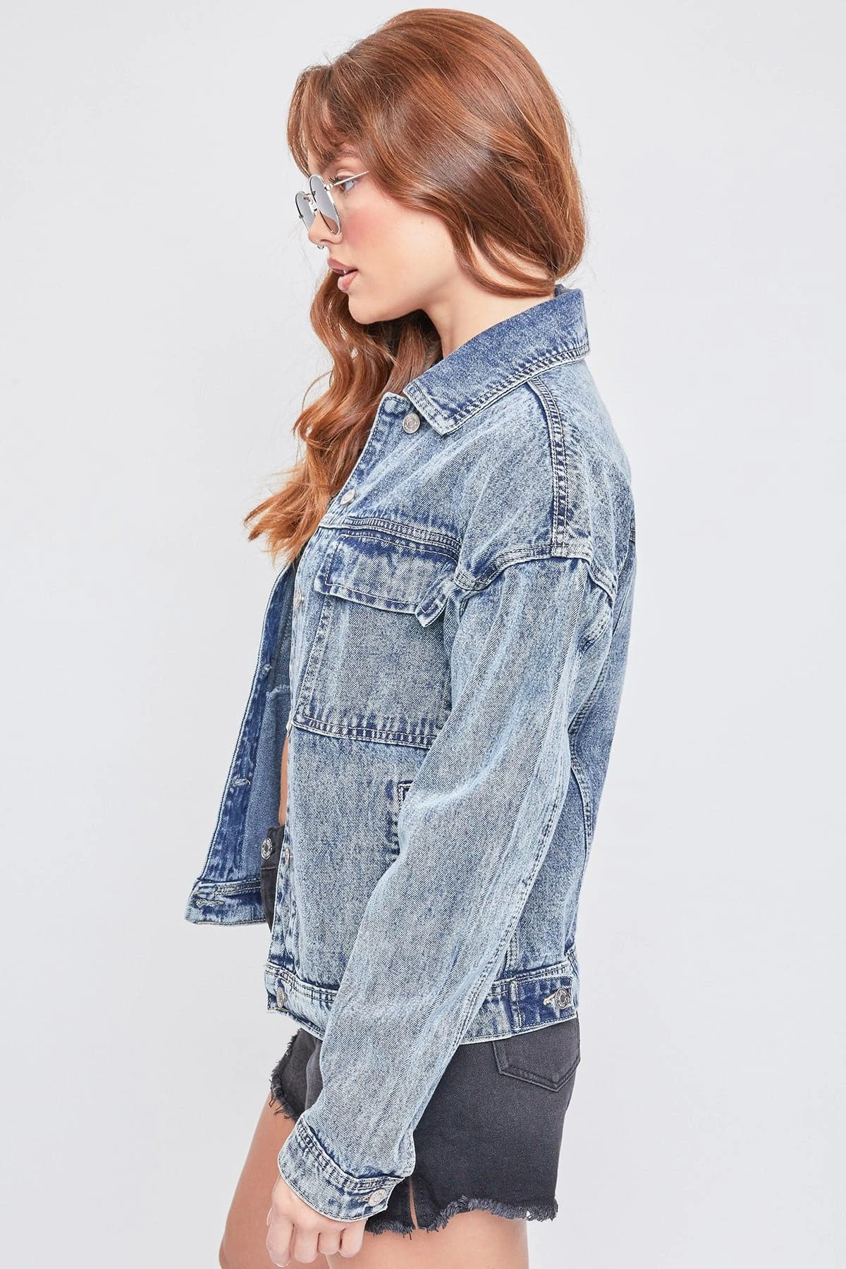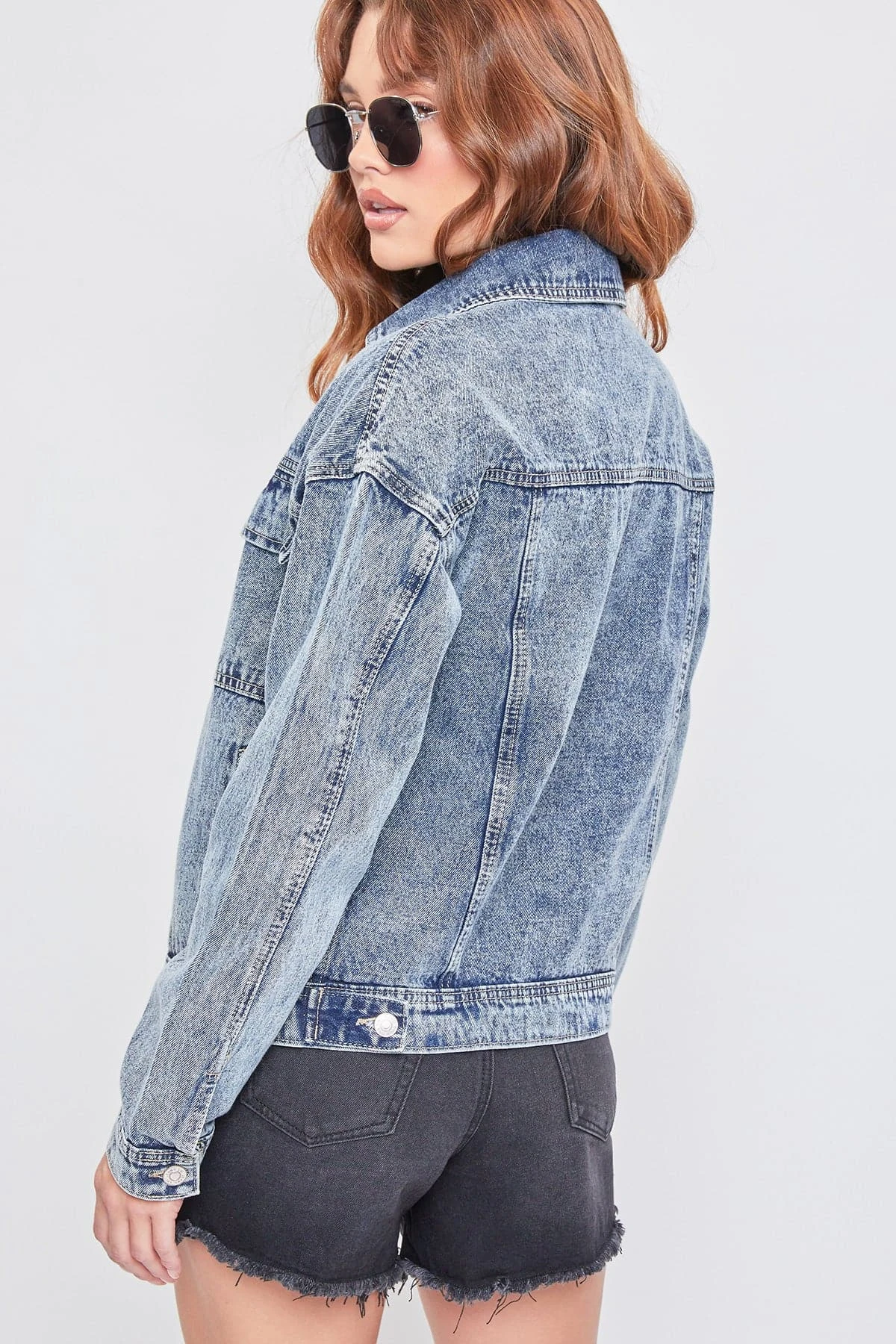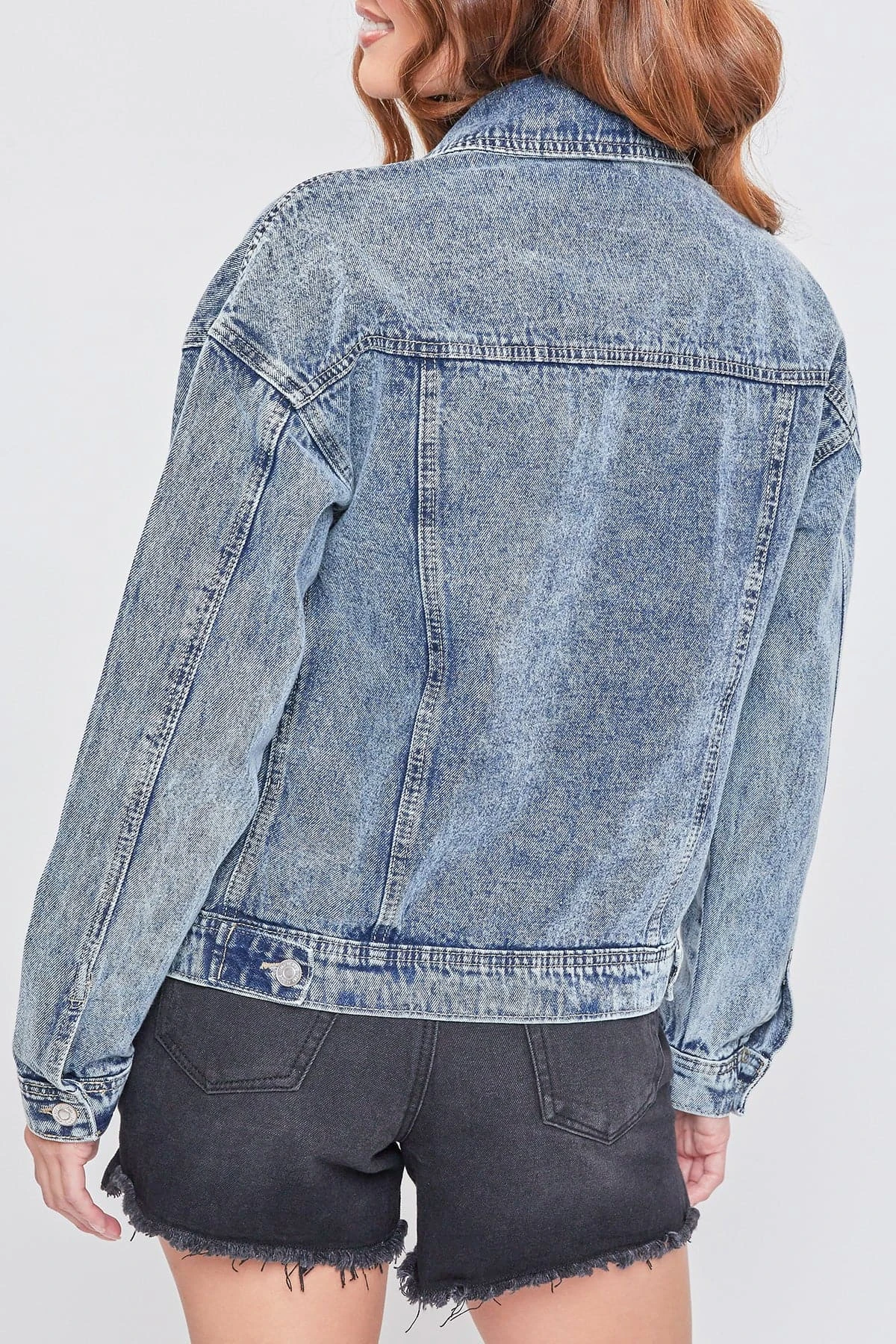 Bringing you a totally 90s vibe. Our Oversized Utility Denim Jacket is effortlessly cool with a slightly oversized shape and unique acid wash. Featuring a large two-flap pocket design for some extra edge. Just like your favorite vintage piece, this jacket gets better over time with natural wear. We love the classic denim on denim look by pairing this with your favorite YMI jeans. Add a trendy sweater underneath, a bucket hat, and some sneakers for a totally retro vibe.