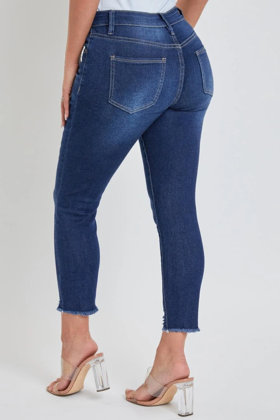 Featuring a four-summary closure and tummy tuck control waistband, this style will keep you feeling sleek and sexy for as long as you rock ’em. Featuring a skinny fit, tummy tuck control waistband, five functioning pockets, frayed hem, front zip, and belt loops. This pant was made from recycled plastic bottles so it’s eco-friendly; creating less landfill waste than your traditional jean.
