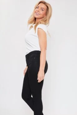 Our Women’s Petite Curvy Fit High-Rise Skinny Jean are the best closet staple to wear with every OOTD. Featuring classic five-pocket construction, a high-rise, single summary closure with front zip, traditional hem, light whiskering and destruction on front, and belt loops.