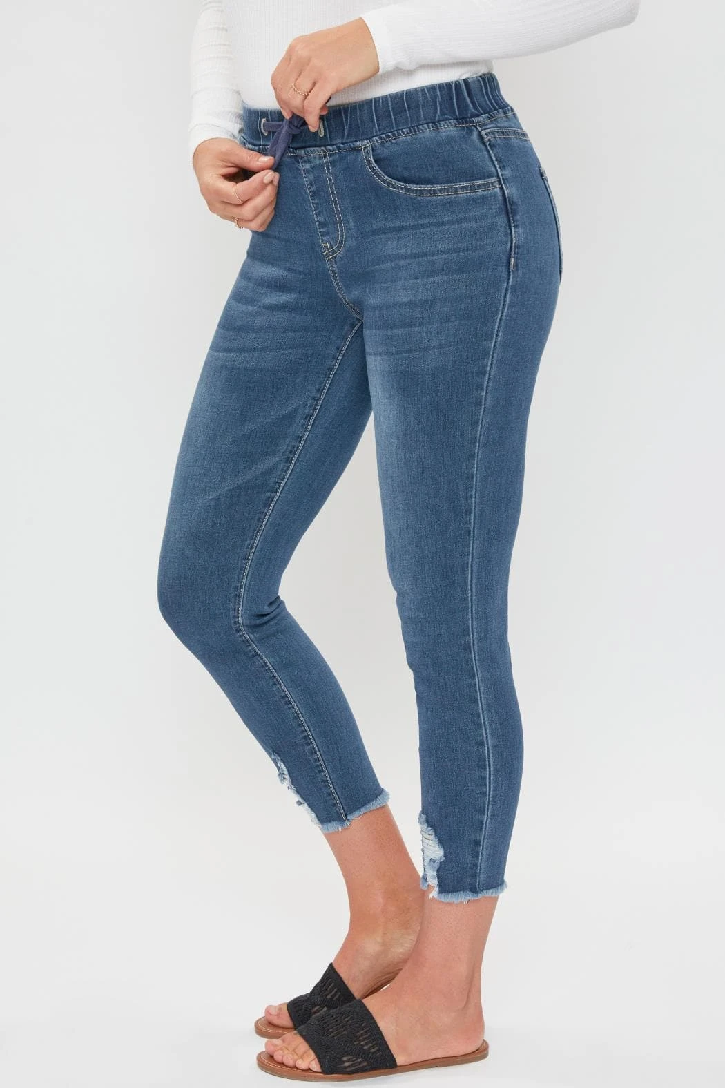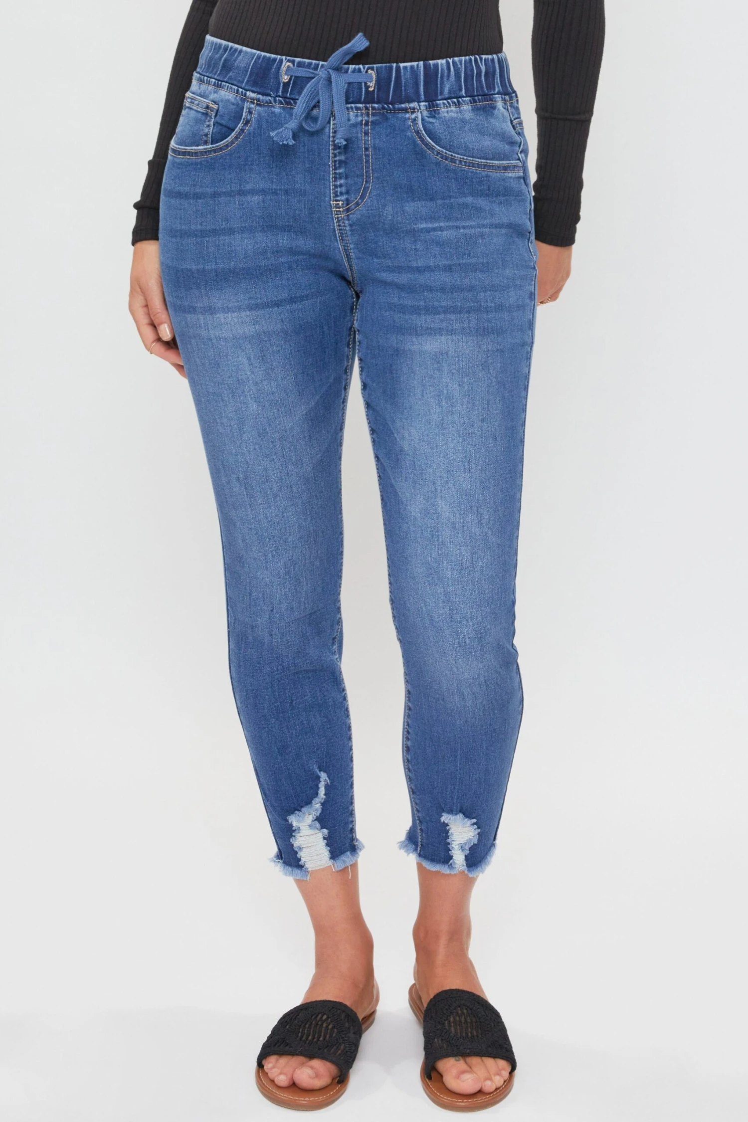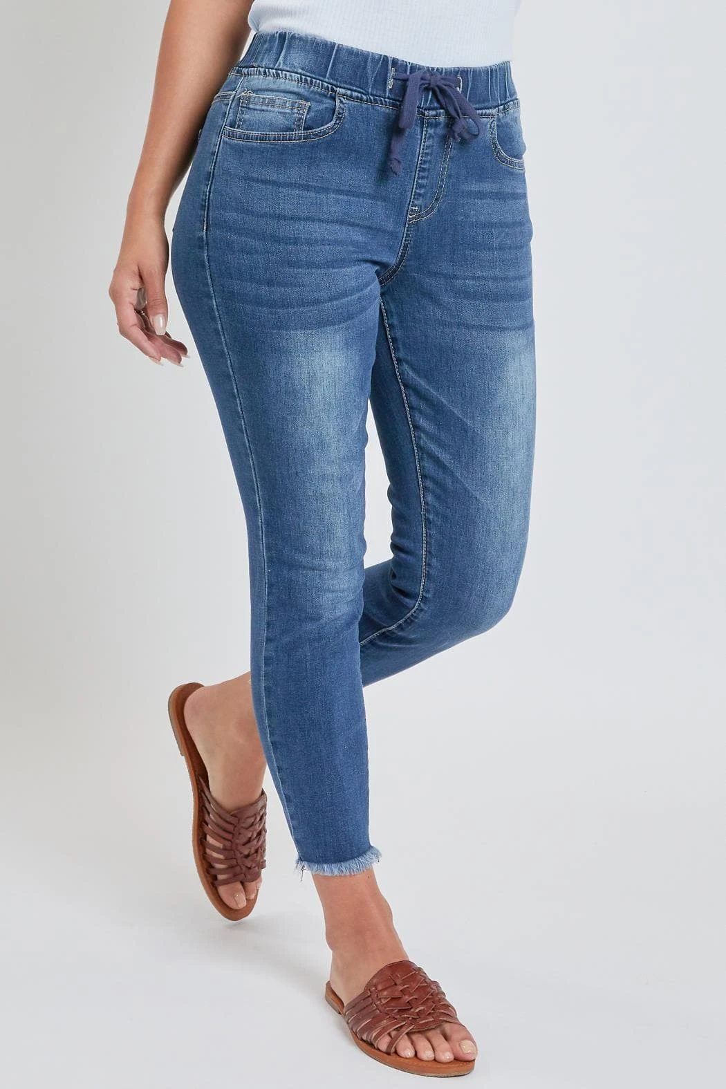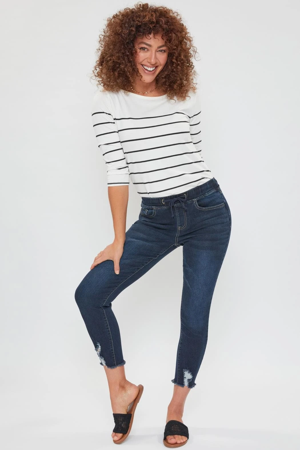 Switch up the basic denim in your wardrobe with our Women’s Petite High-Rise Denim Ankle Jogger. Feel cool and look casual with this pair’s perfect high-rise fit. Featuring five-pocket construction, an elastic waistband with drawstring front tie, distressed detailing, and frayed hem.