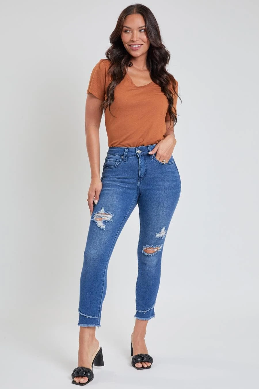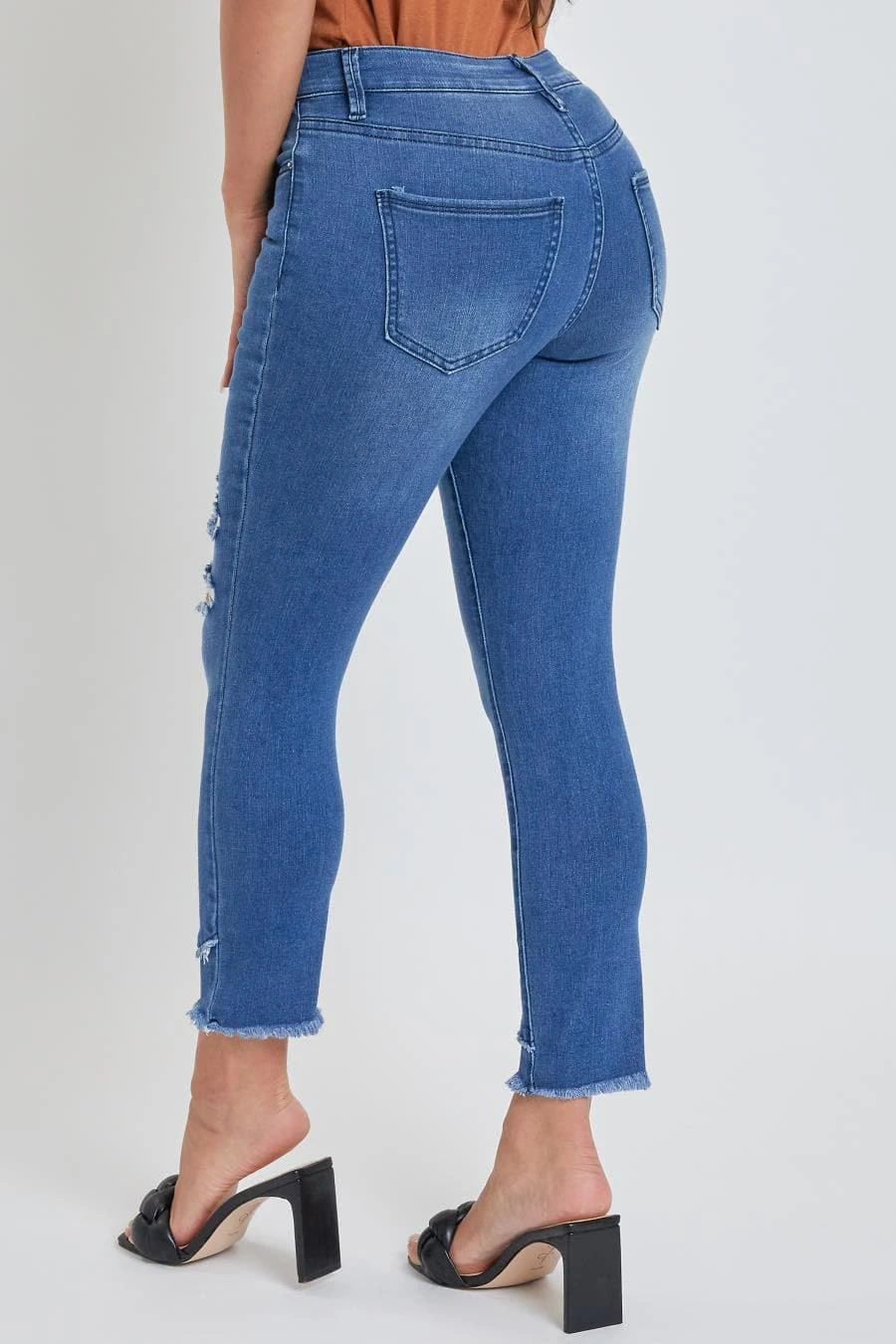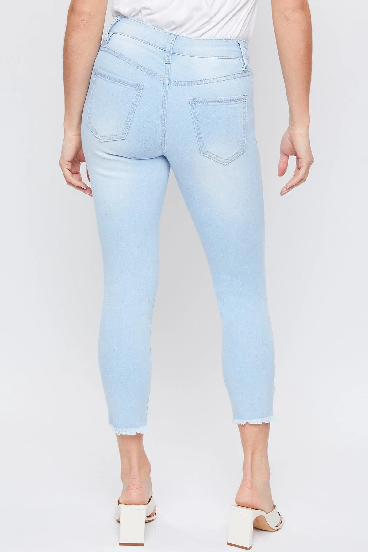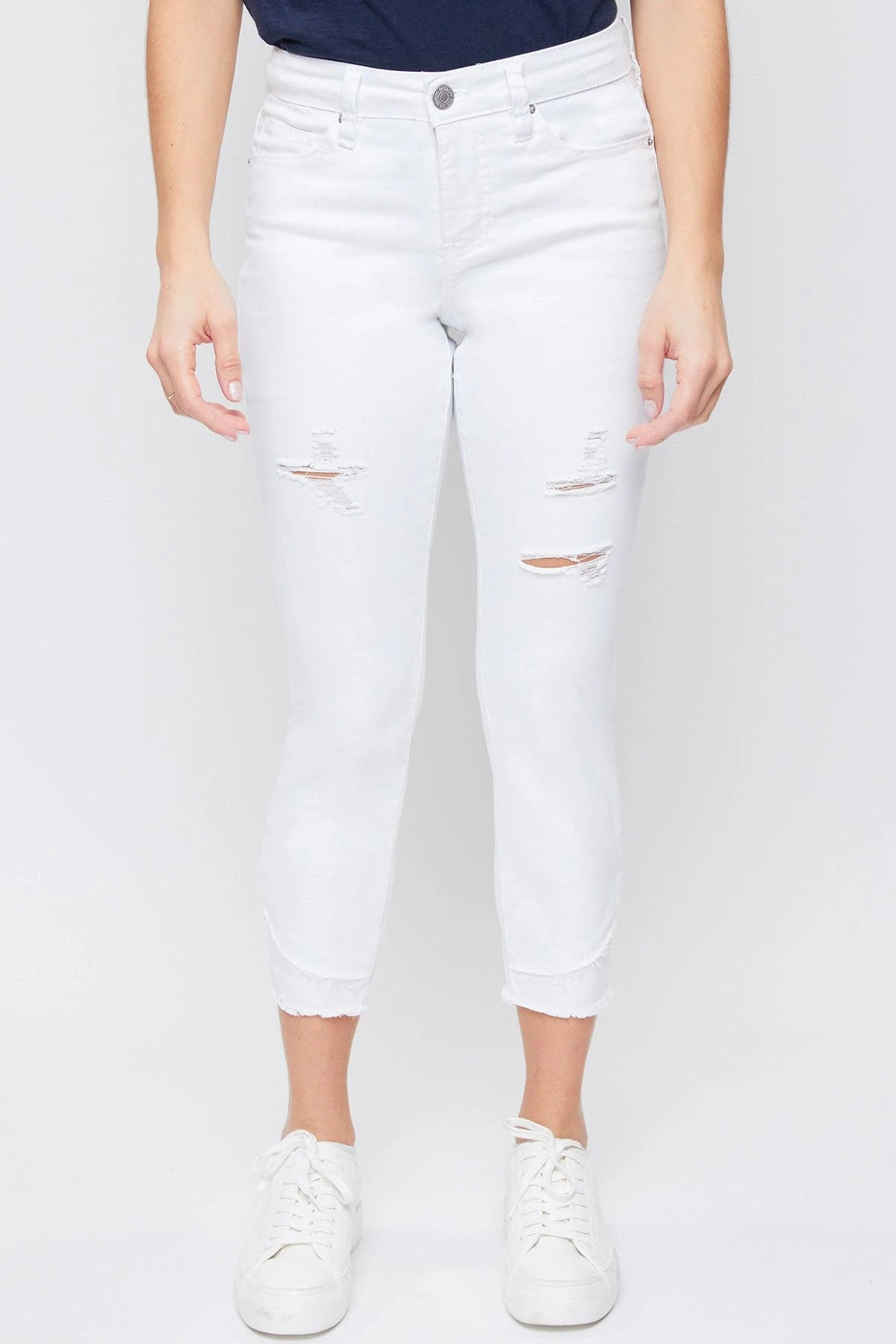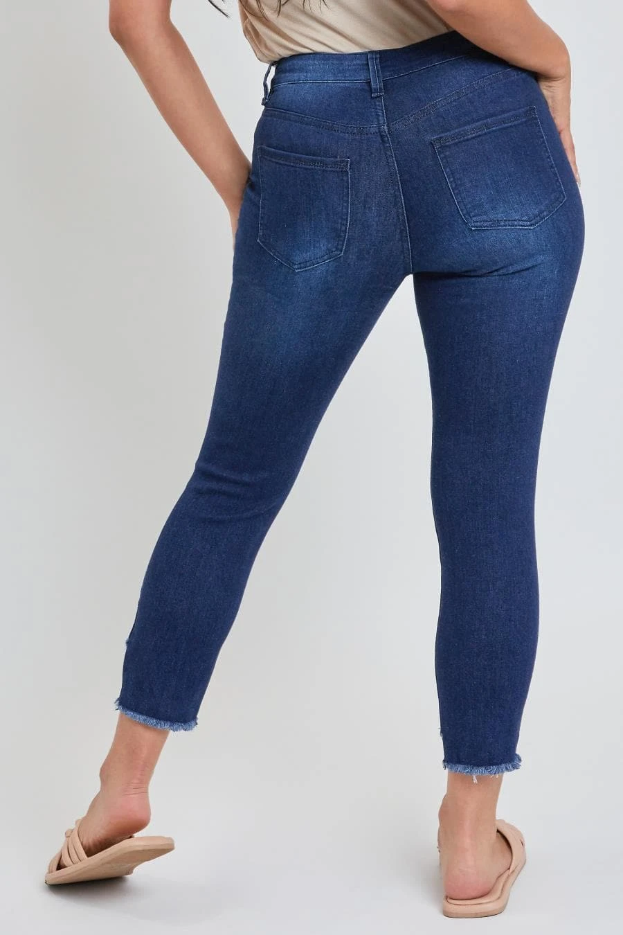 Hello weekend jeans! Crafted with built-in stretch for comfort and distressing for a worn-in vibe, our Petite Women Skinny High-Rise Ankle Jean with Slanted Double Frayed Hem is ready for the weekend! You’ll love this figure-defining style (and so will your butt and legs)! Featuring a tummy tuck control waistband that sits right at the waist – this jean can be worn with your shirt tucked in or untucked. This jean also features a slanted double frayed hem so you can show off your favorite shoes in style!