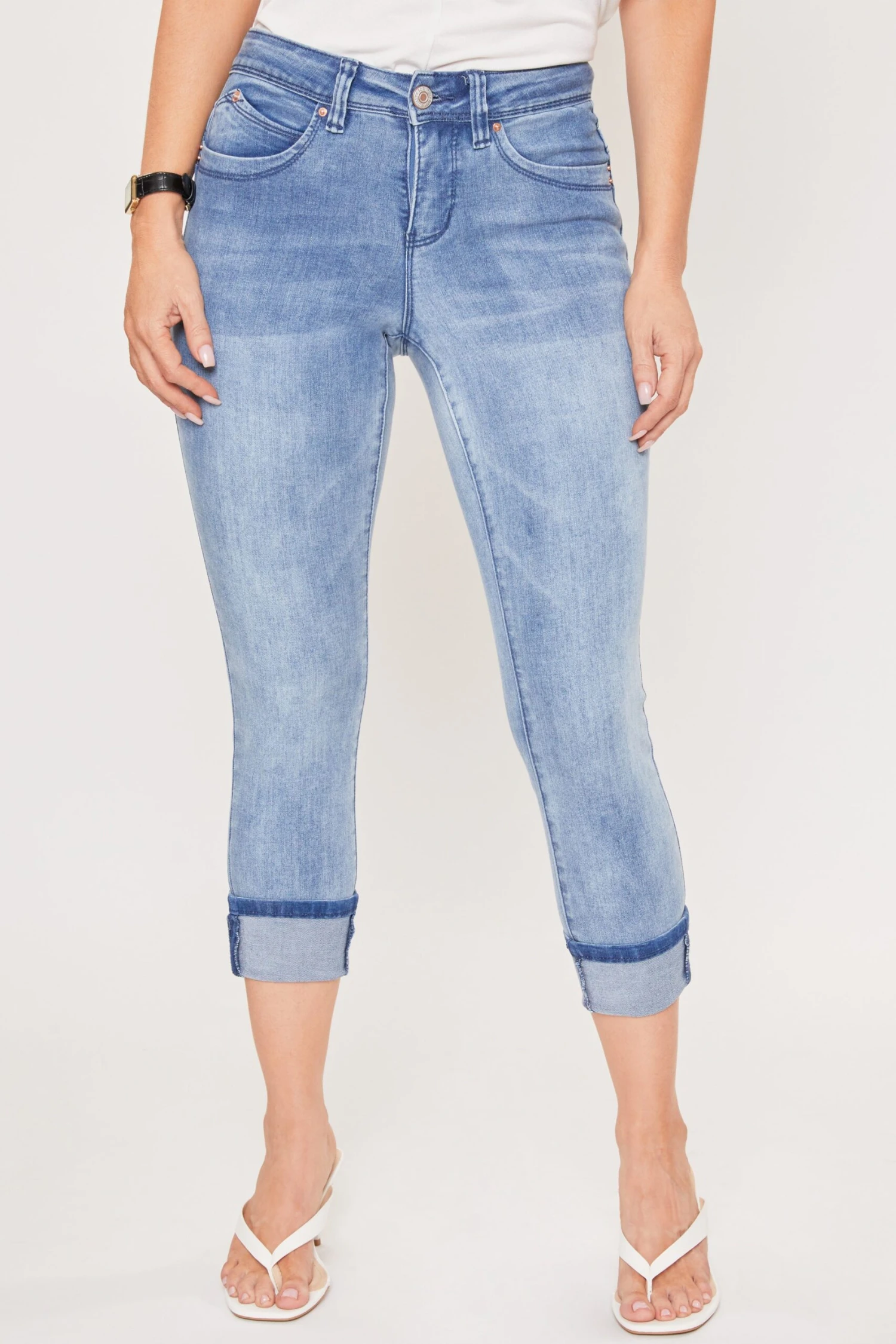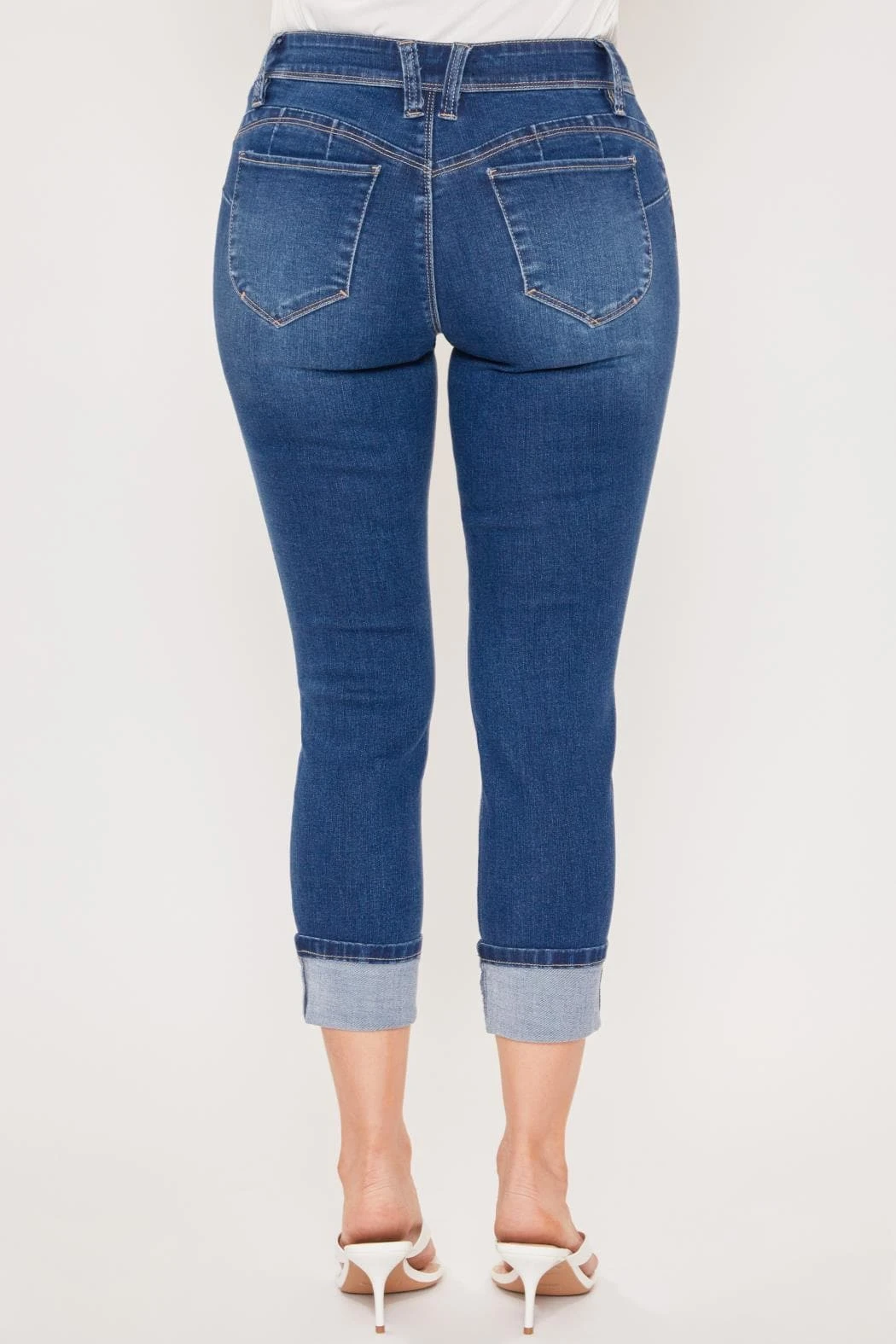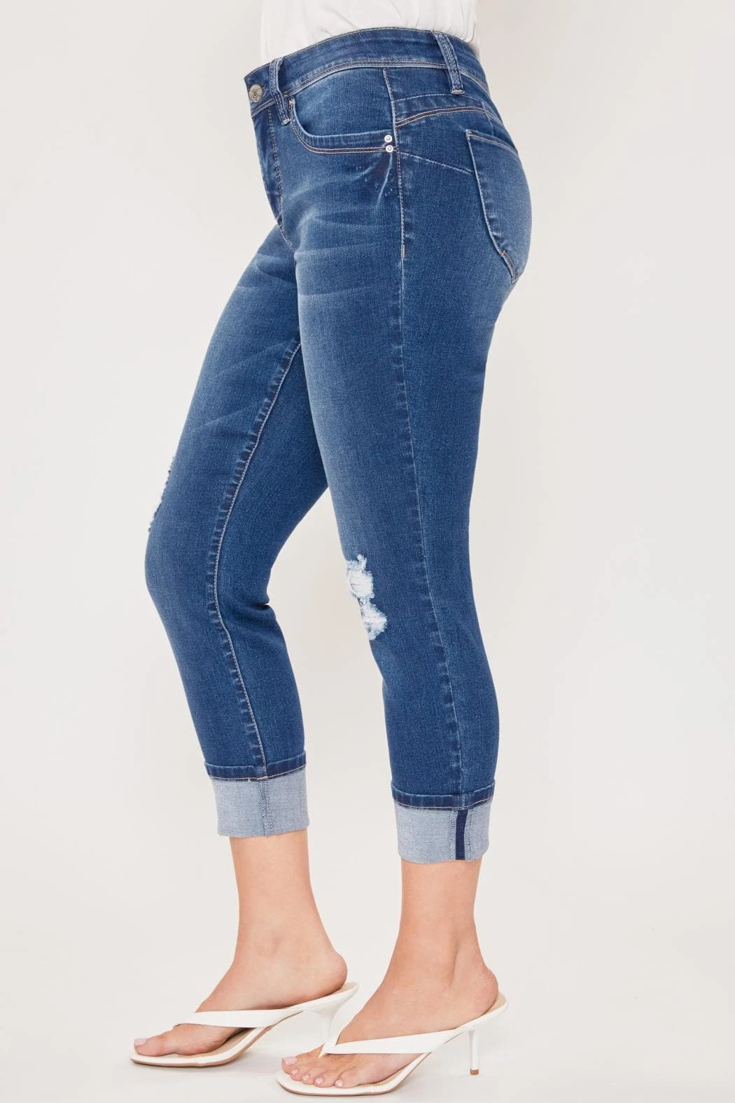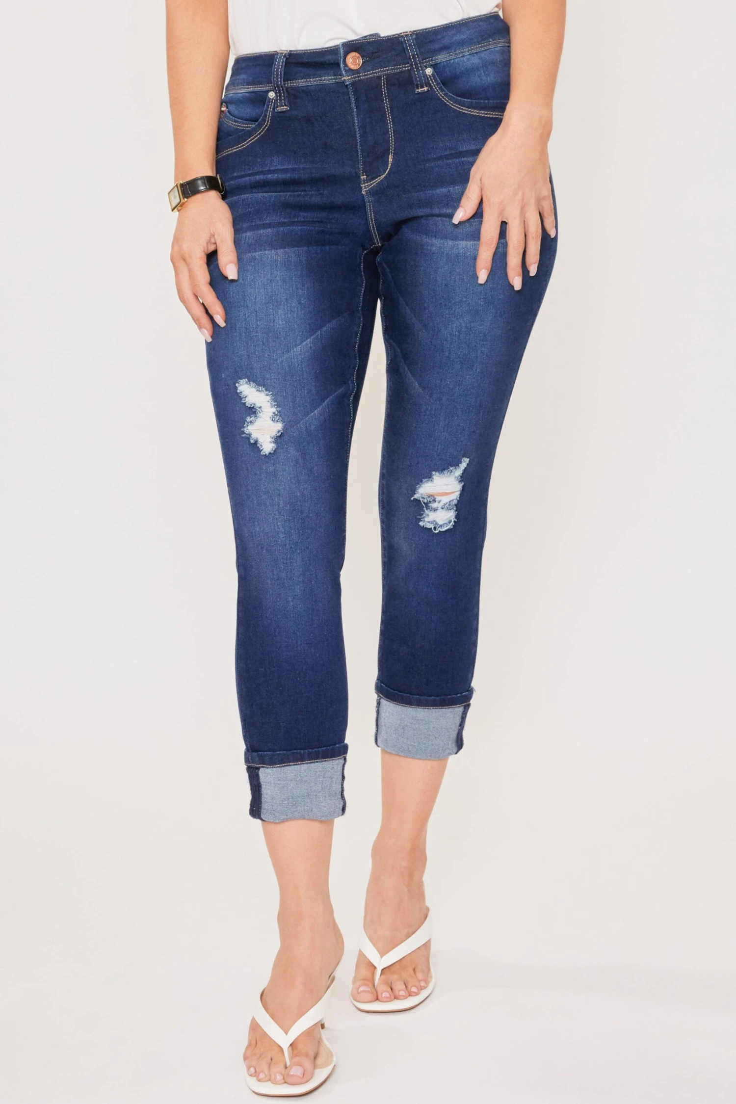 Our famous WannaBettaButt fit! No kidding! This really works. We ever so slightly “lift and shift” your bum to give you a firmer look with specially designed “contour seams” to help you achieve a flattering look. These Women’s Petite WannaBettaButt Mega Cuff Ankle Jeans Made From Recycled Fibers are designed with fading throughout for a comfortable and casual look. Featuring a classic five-pocket construction, adjustable cuffs, single-summary closure with front zip, and belt loops. Due to the nature of the novelty wash process and hand-crafted design, each garment will have a unique appearance.