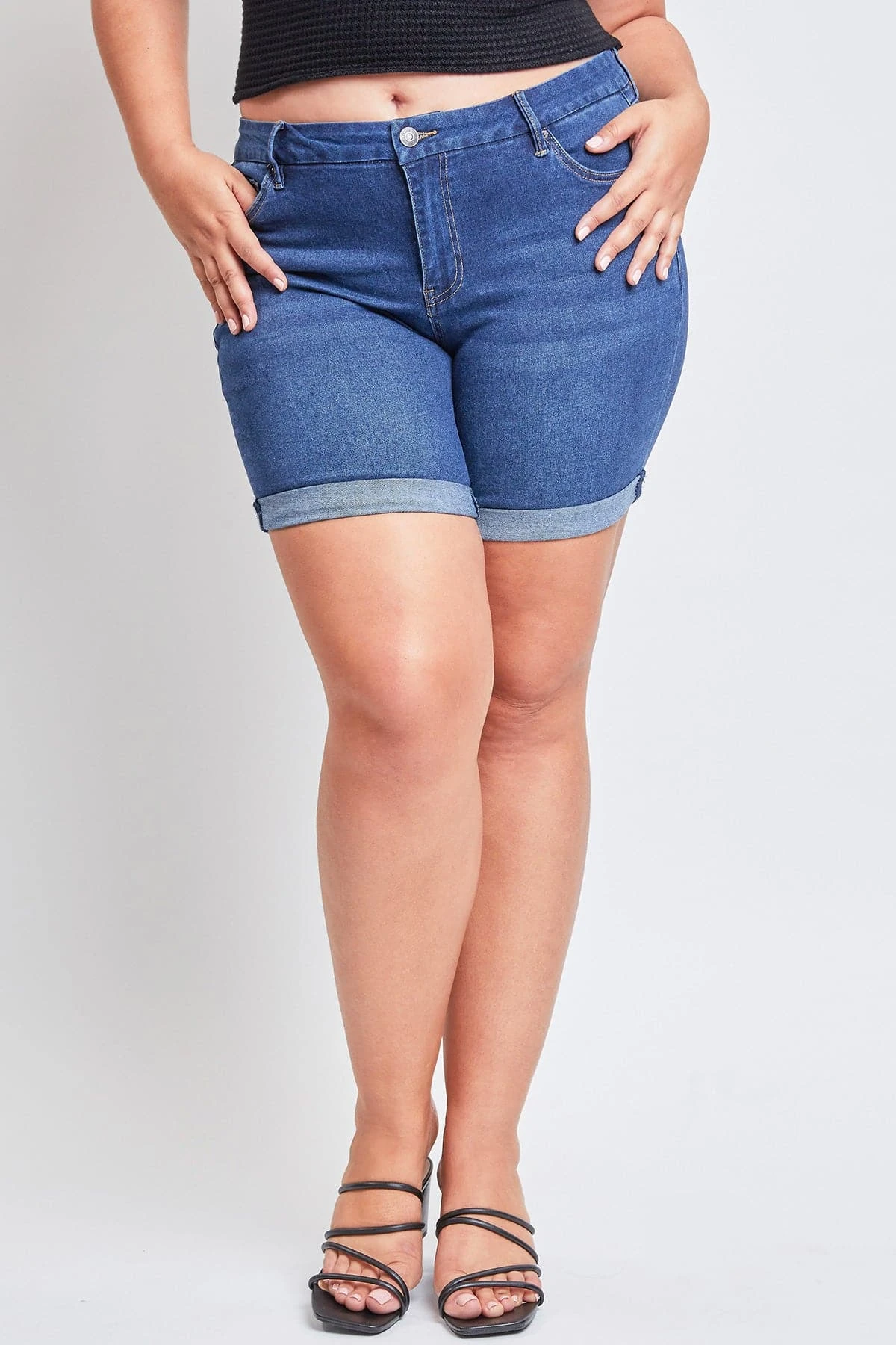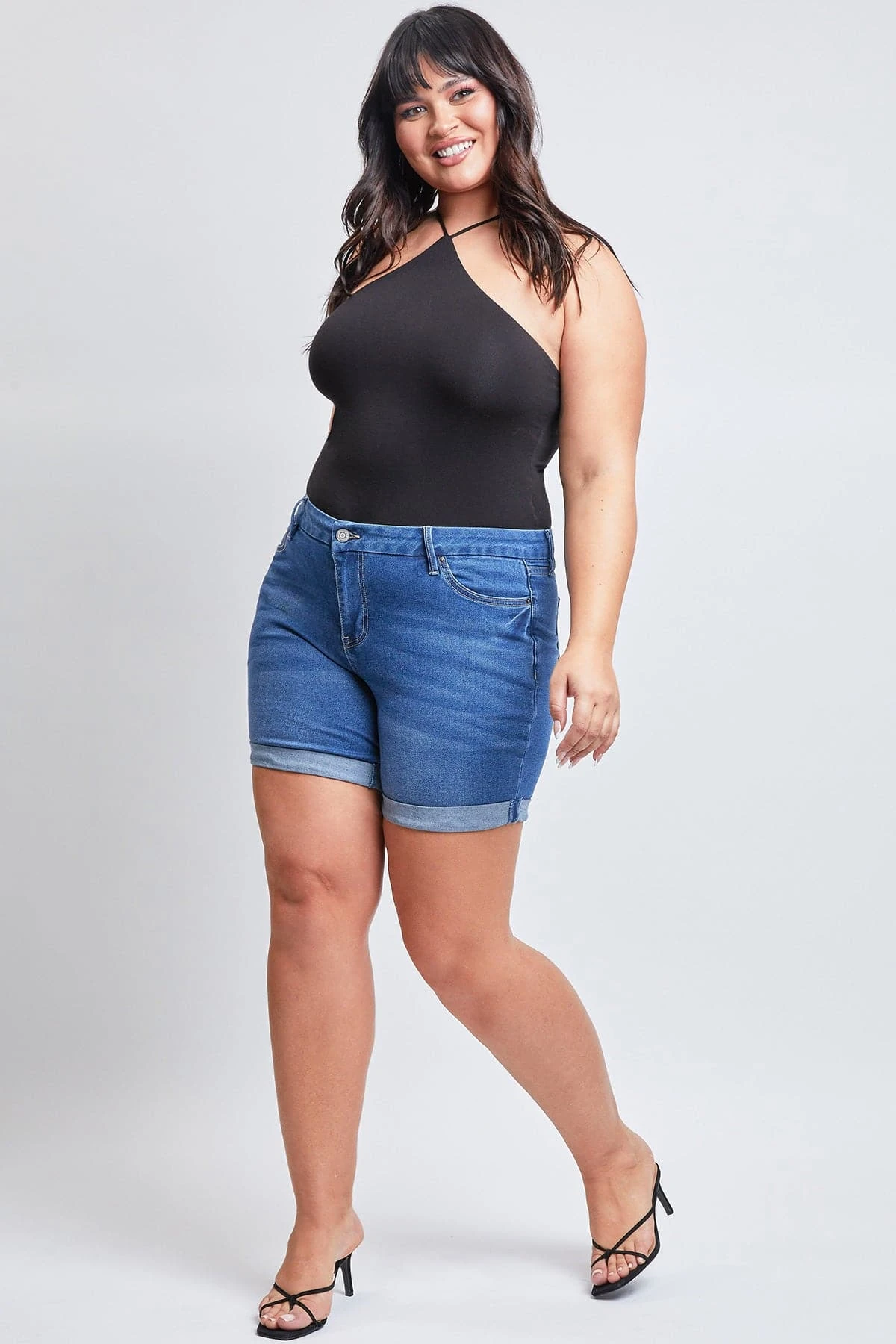 Upgrade your Summer wardrobe with our Women’s Plus Curvy Fit High-Rise Jean Shorts With Rolled Cuffs. Featuring our highest rise and a narrower waist with a contoured band so you no longer have to worry about gapping! Our Curvy Fit is made with a little extra room in the hips and thighs to ensure the best fit. Featuring cuffed hems for a laid-back look. Perfect for any casual occasion, these shorts will quickly become a staple in your wardrobe. Pair with a bodysuit and sneakers for an easy-going look, or dress up with a floral blouse and sandals!