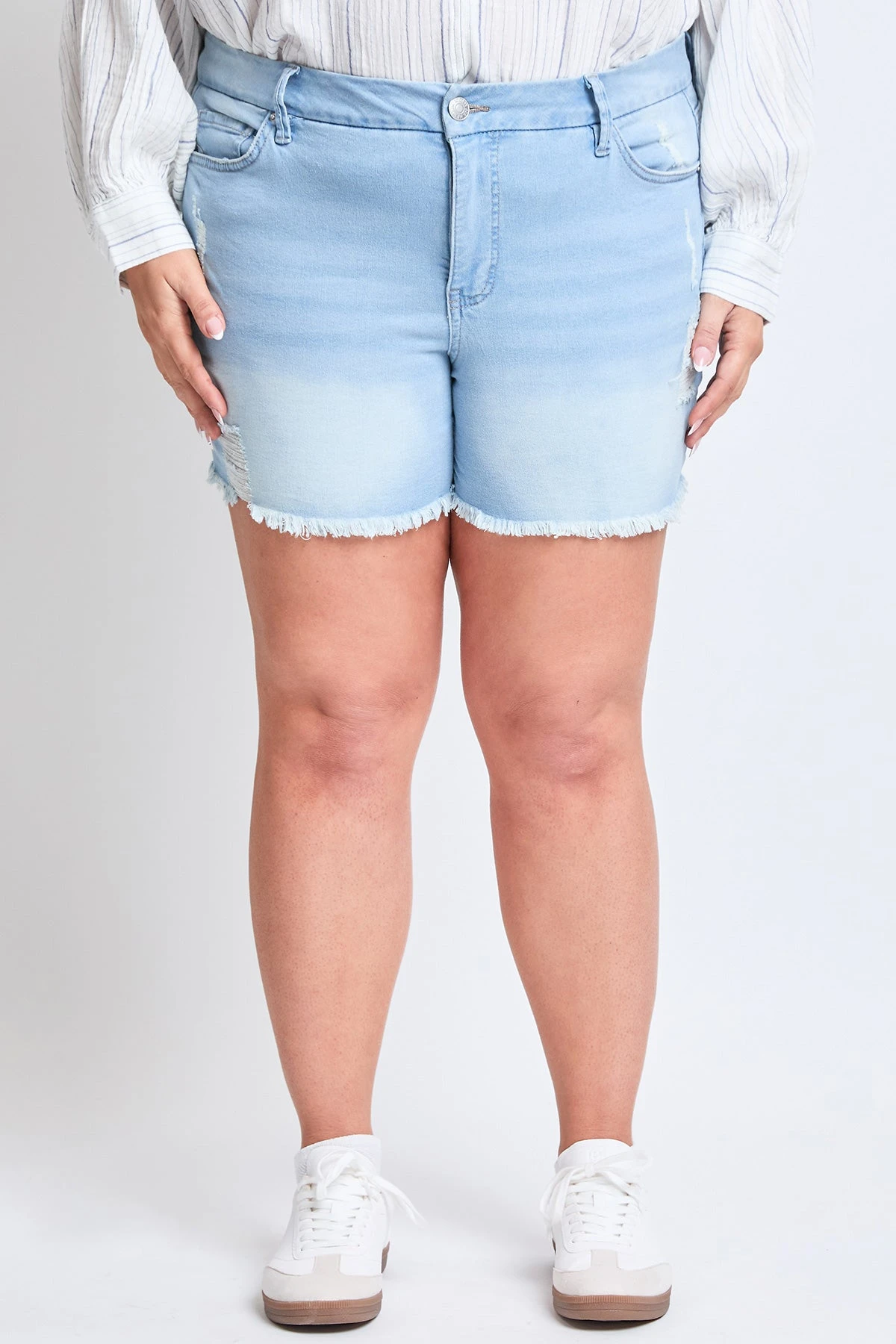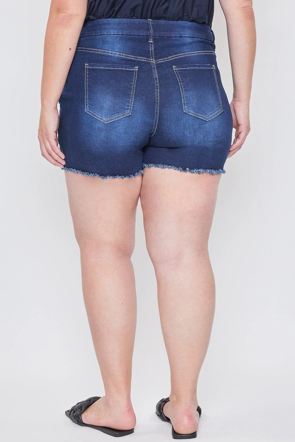 Our Missy Plus Curvy High-Rise Frayed Hem Shorts are designed with fading and whiskering. Also added light distressing & frayed hems. Made with a super stretchy & comfortable denim. Due to the nature of the novelty wash process & hand-crafted design, each garment will have a unique appearance.