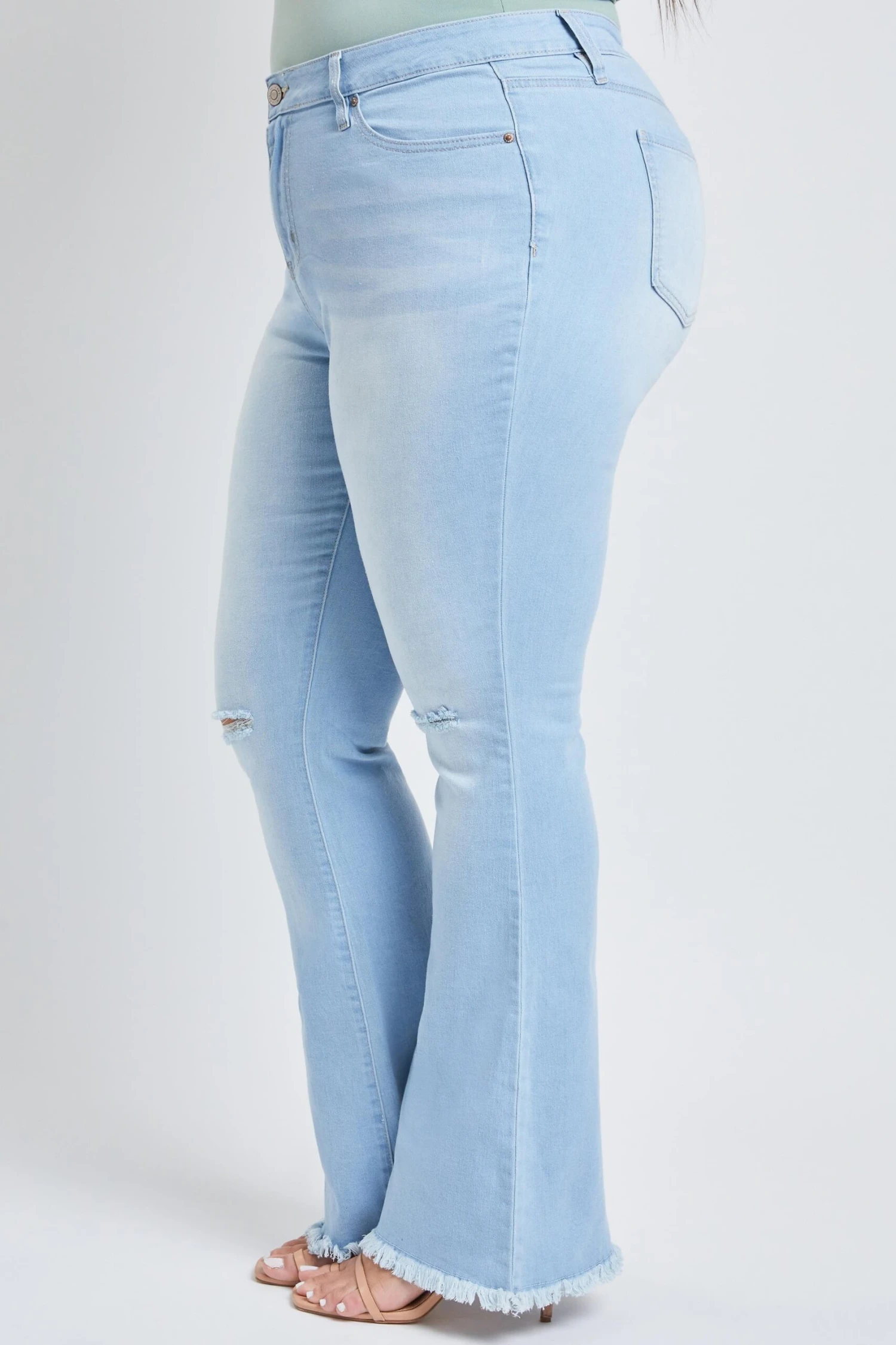 Major trend alert! Our Women’s Plus Size High-Rise Distressed Super Flare Jean. Designed with a flared fit, rips at knees, and frayed hemline. Featuring five-pocket construction, single-summary closure with front zip, and belt loops.