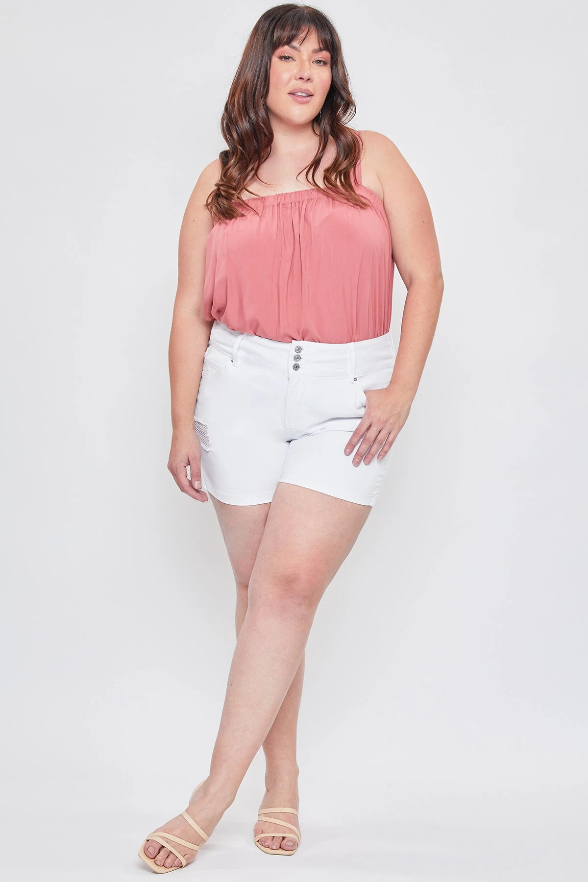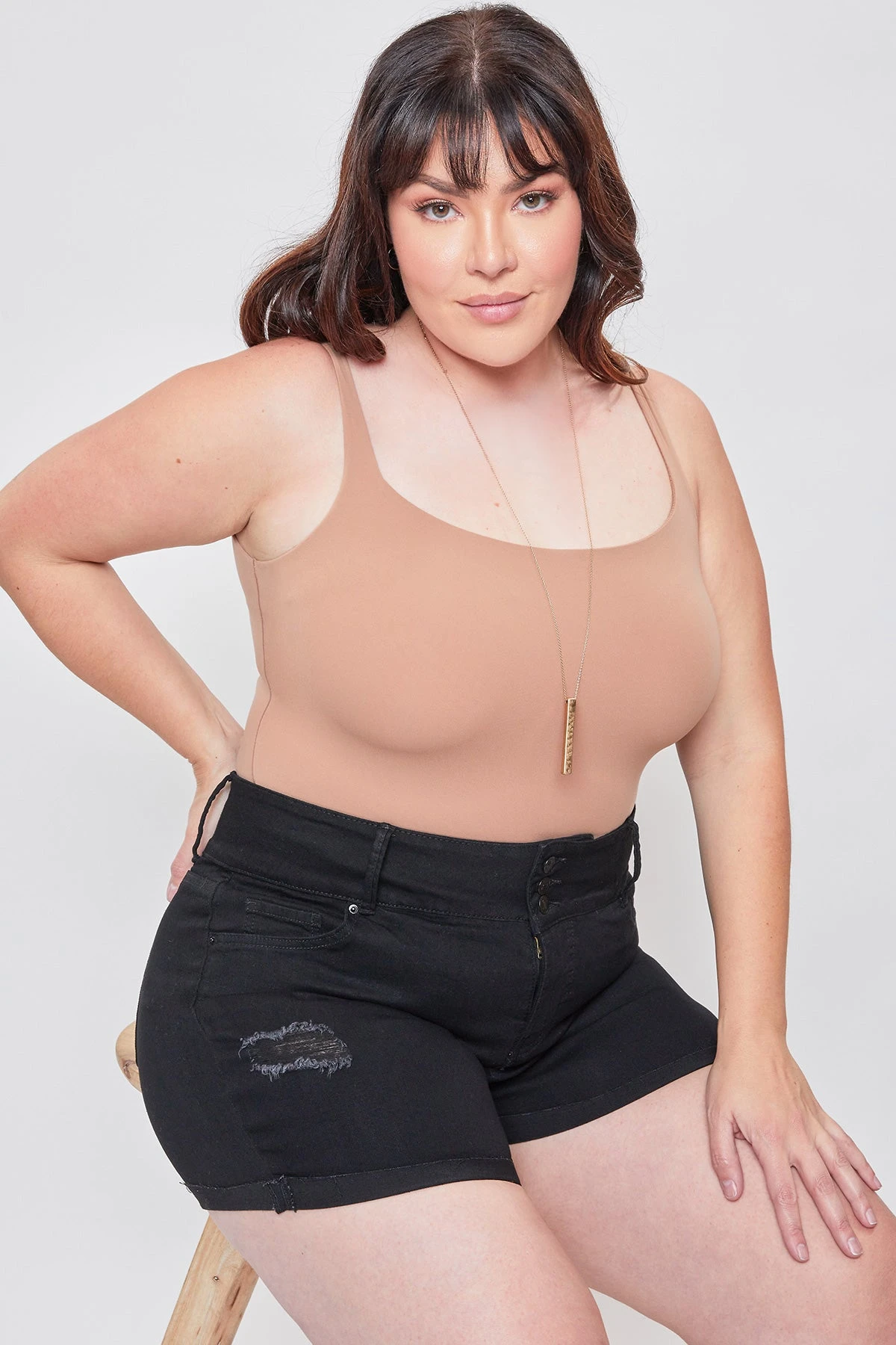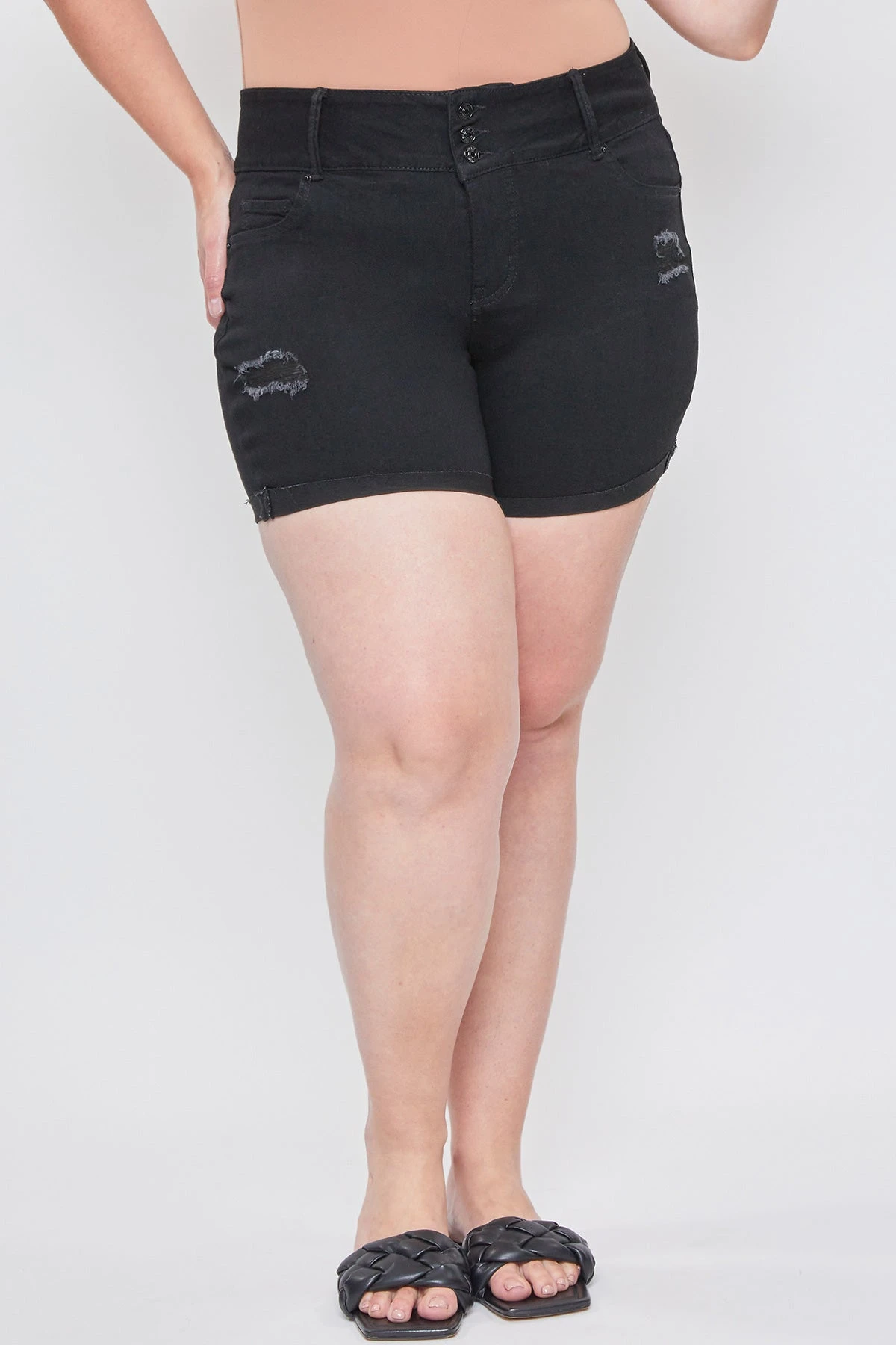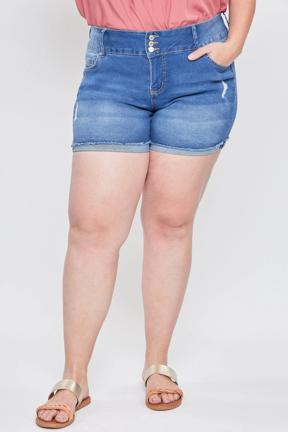 The perfect pair of shorts to add to your wardrobe! Our Missy Plus Basic 3-Button Fray Cuff Shorts give you the perfect combination of trendy and comfy! Designed with an exposed 3-summary design, cuffed hems, and light distressing. Made with a super stretchy and comfortable denim.