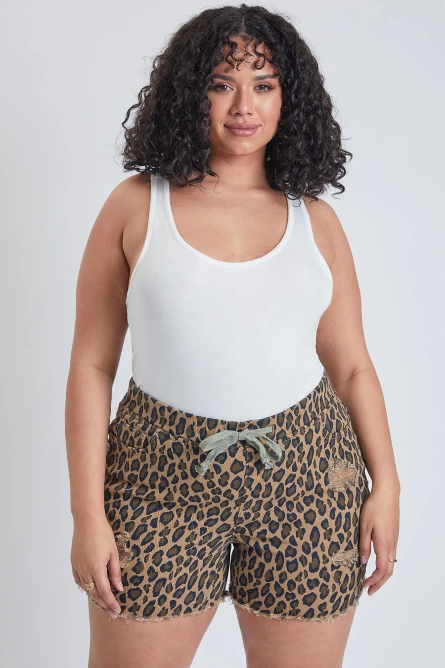 Our Women’s Plus Size High-Rise Fray Hem Jogger Shorts are here! A perfect short with a sporty twist. Featuring classic five-pocket construction, front tie, elastic waistband for added comfort, distressed detailing, and frayed hem.