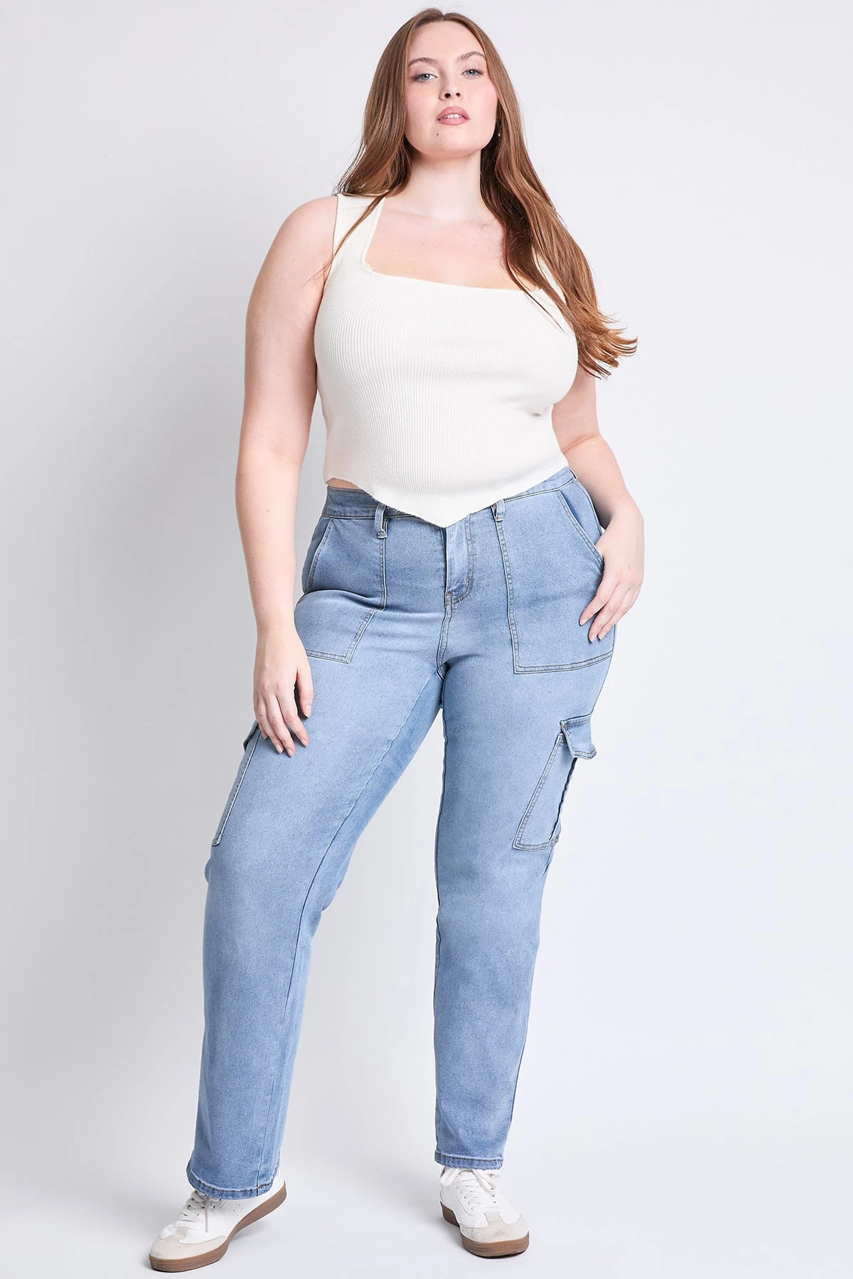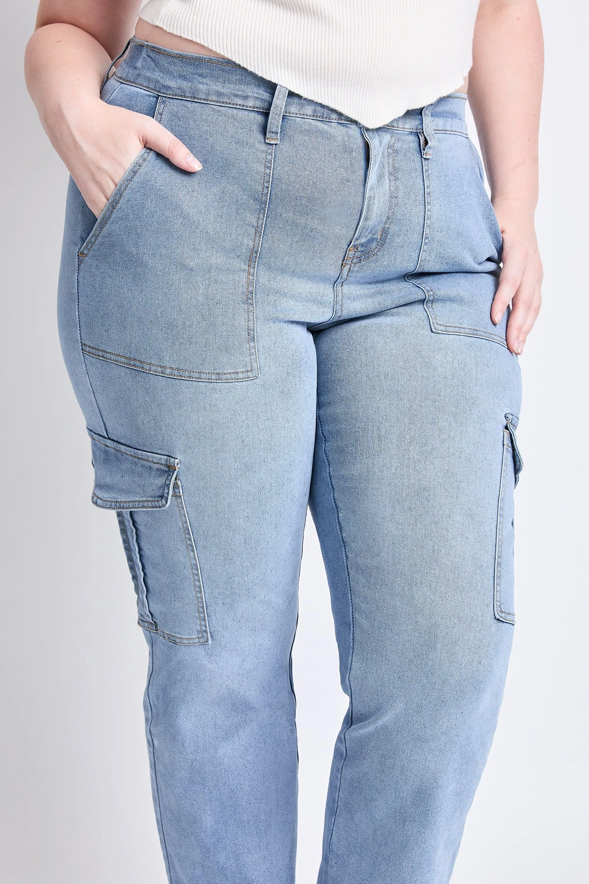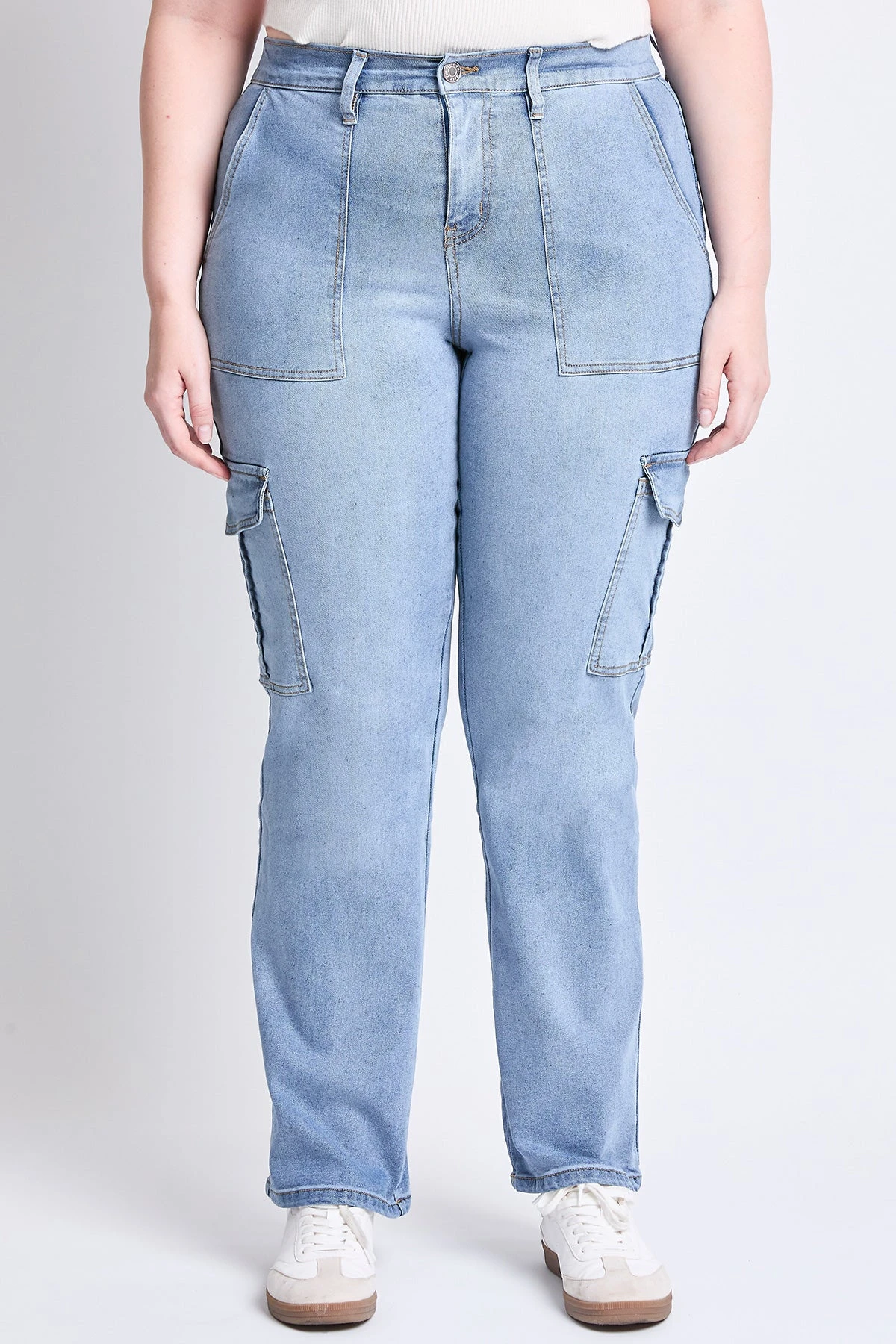 Women’s Plus High Rise Elastic Waist Cargo Straight Leg Jeans are the ultimate combination of utility and contemporary style. These jeans feature a high-rise waist and a straight-leg silhouette, offering a flattering fit with a modern edge.