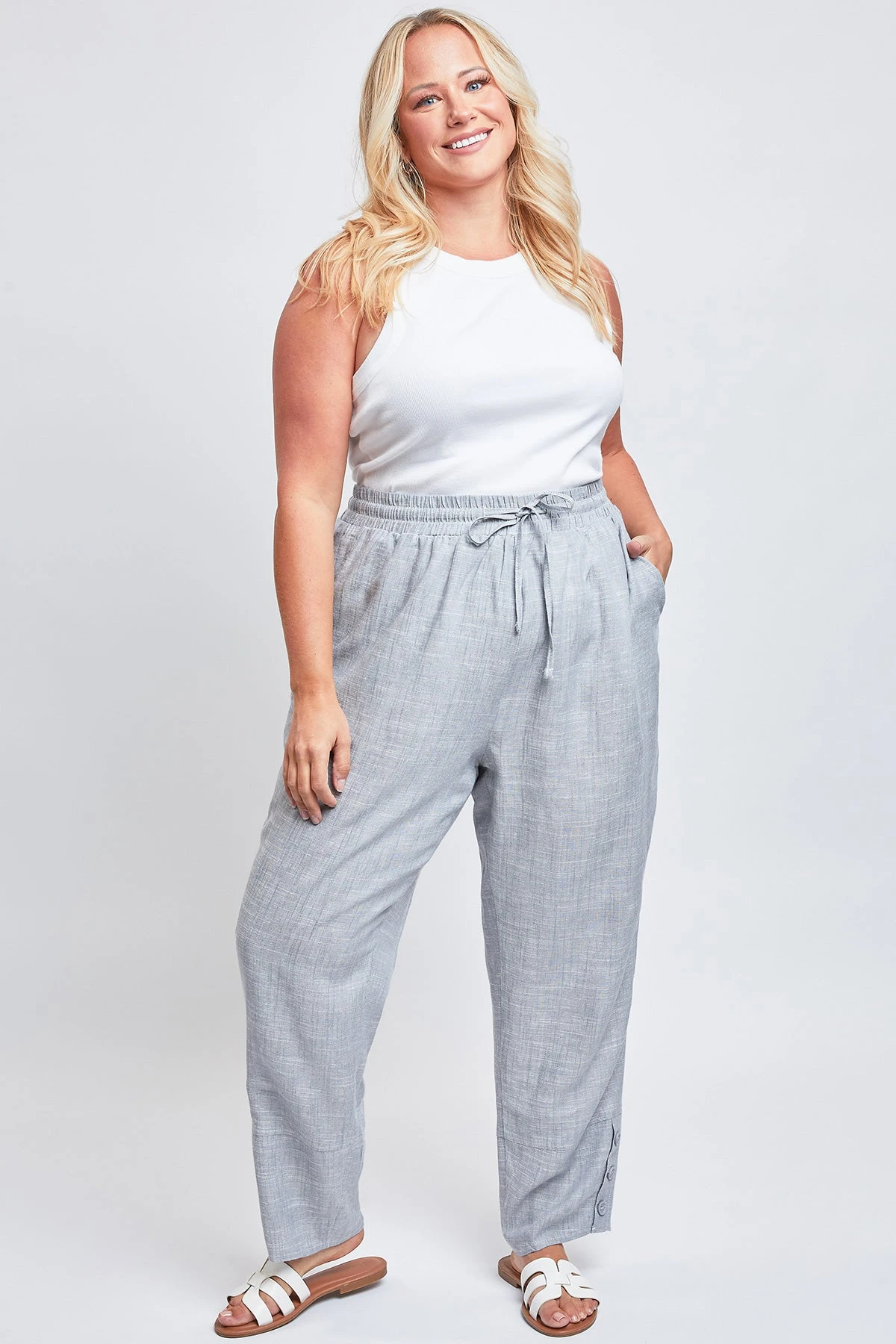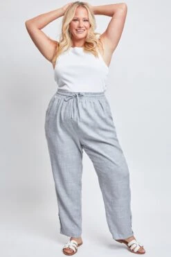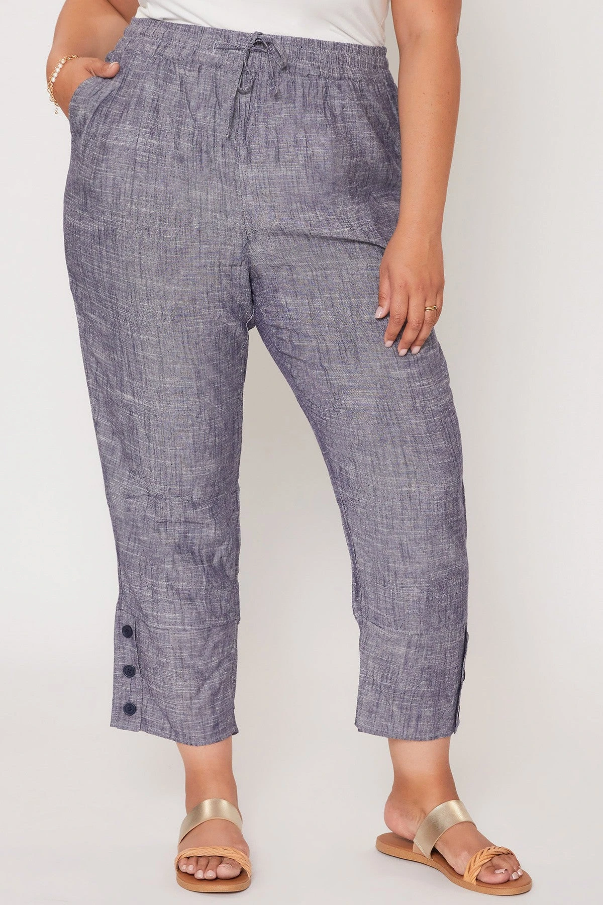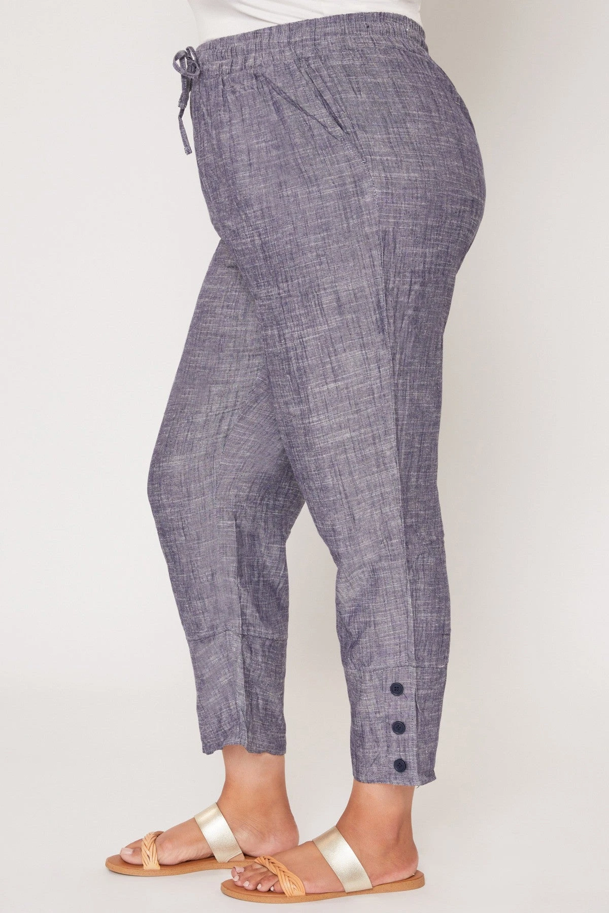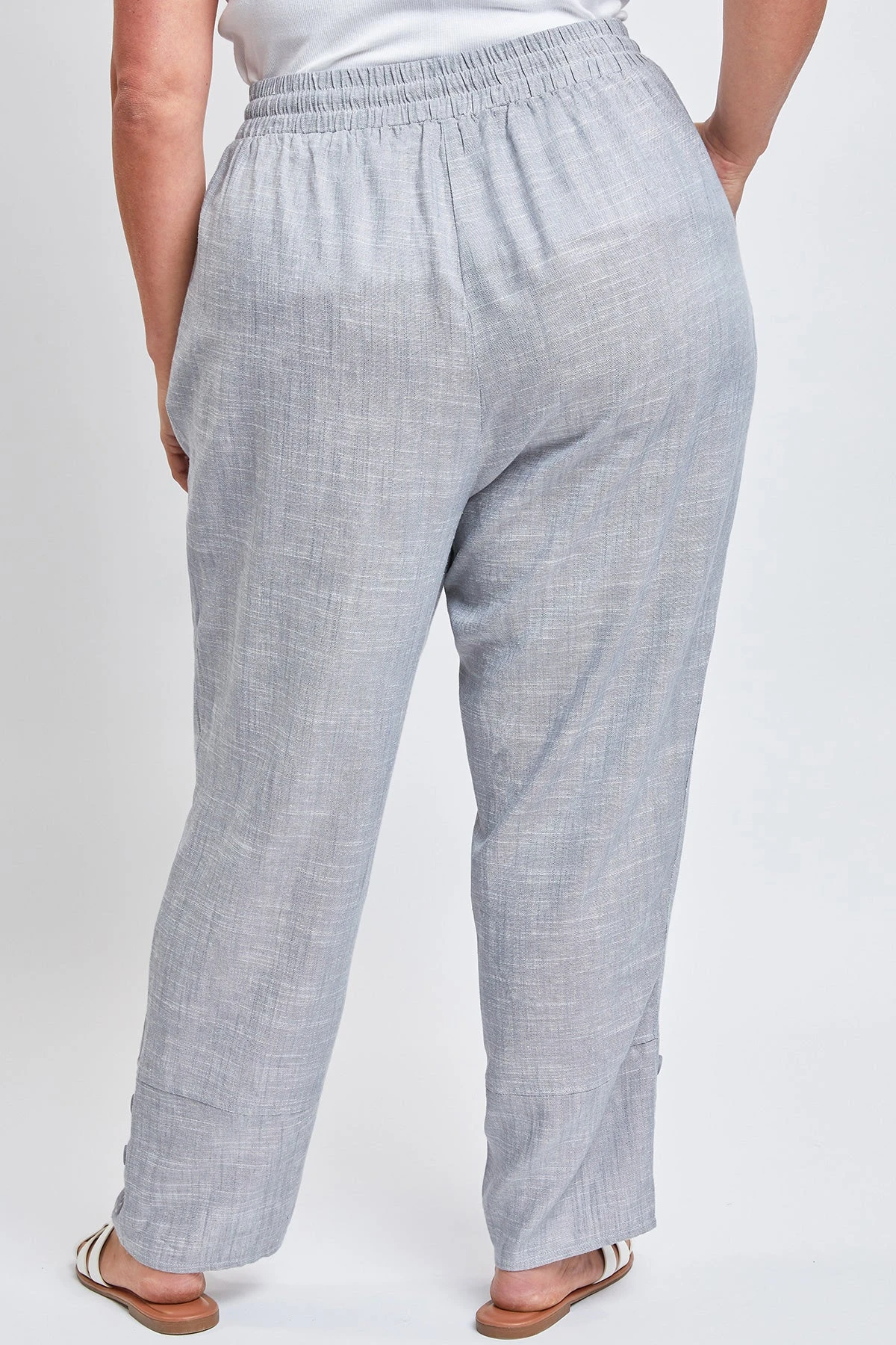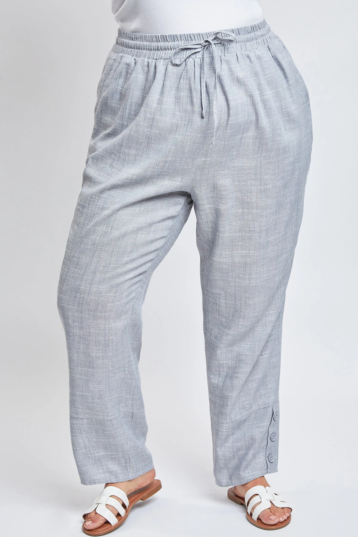 Our comfy Women’s Pull On Button Hem Pants are a fantastic addition to your year round wardrobe. Featuring a wide-width waistband, elastic waistband, drawstring feature, and 3 summary hem detail.