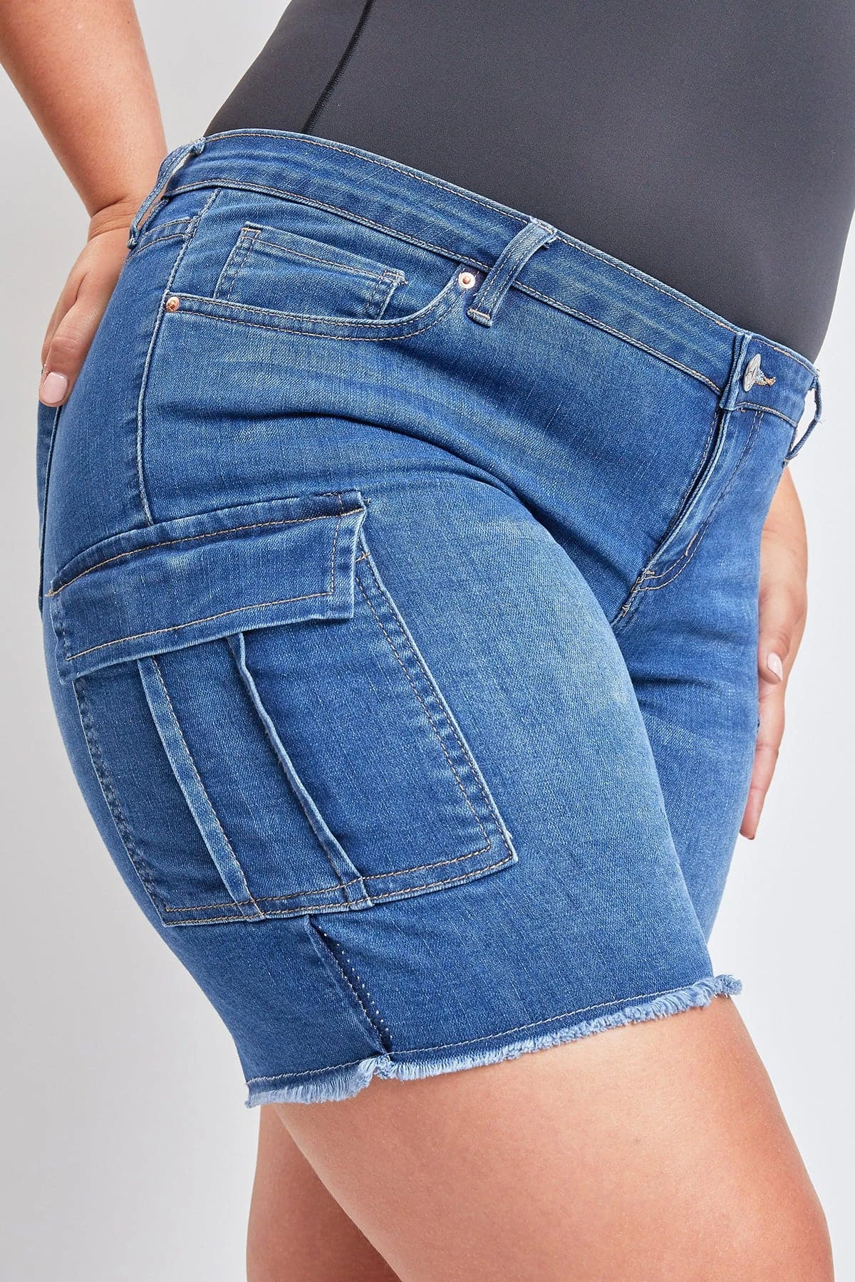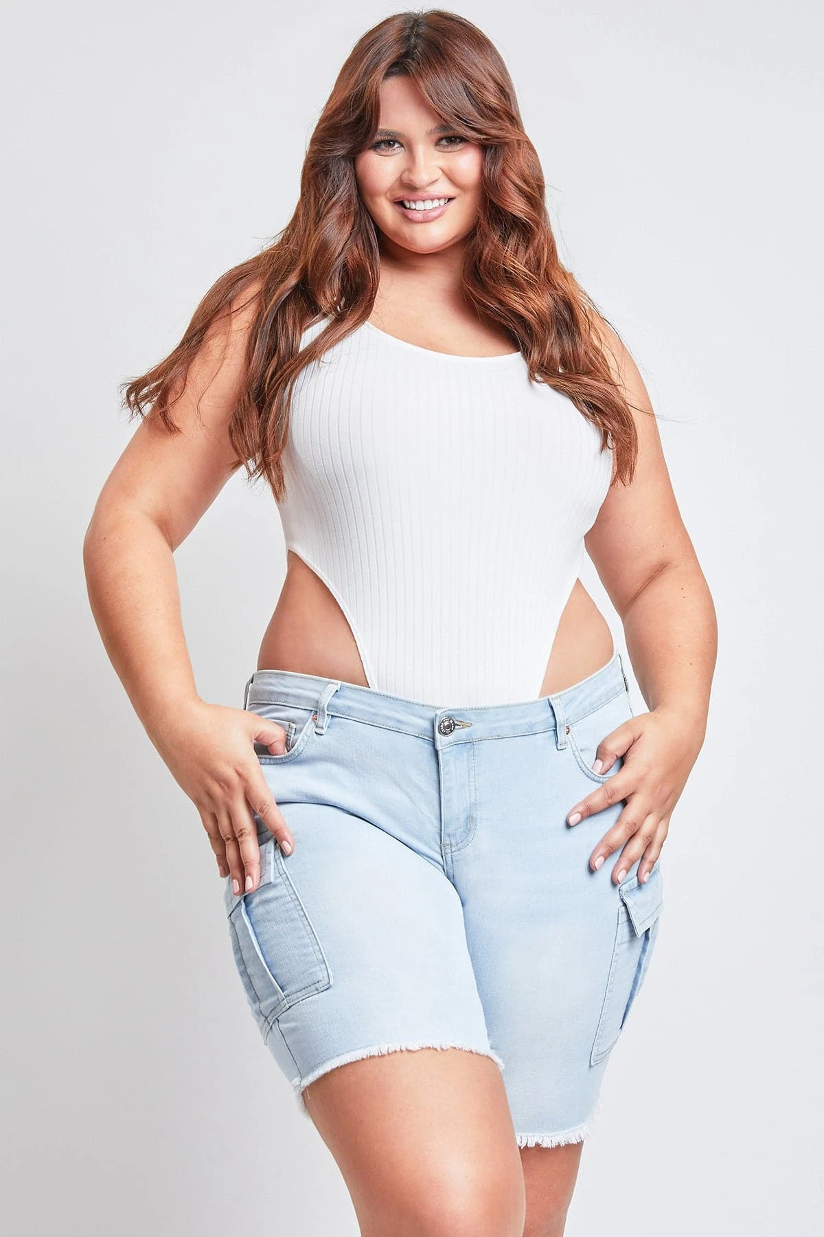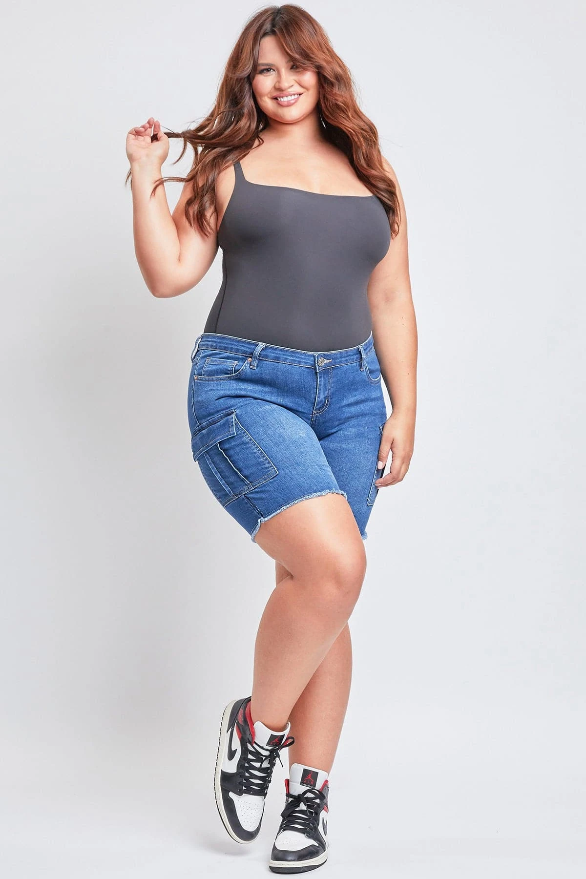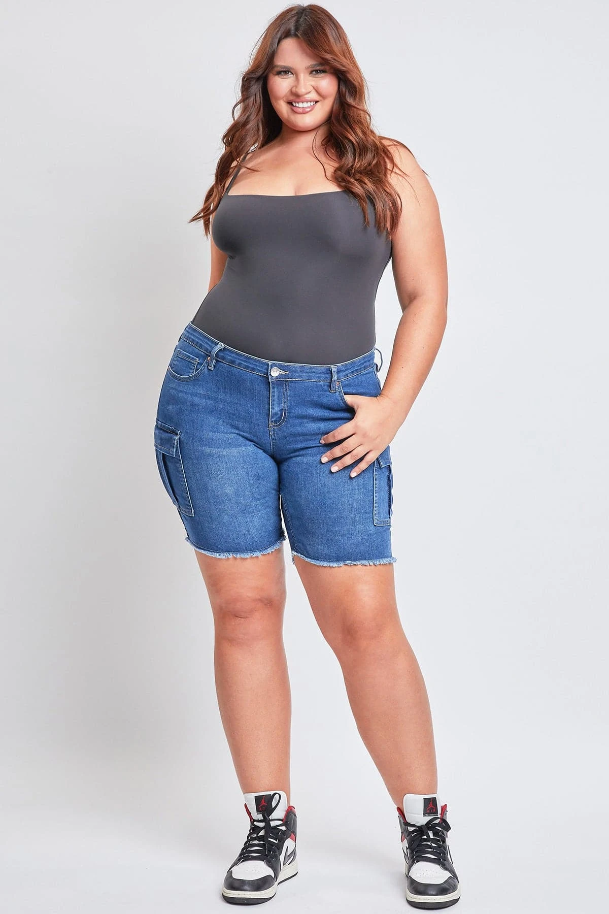 Who says shorts actually have to be short? Our Women’s Plus Low Rise Cargo Bermuda Shorts with Frayed Hem will have you ready to heat things up. This low-waisted denim short features flap cargo pockets at the side and a raw hem for a true utilitarian look. Wear these jean utility Bermudas with a crop top and sneakers, or dress them up with a bodysuit and heeled sandals for a sultry vibe!