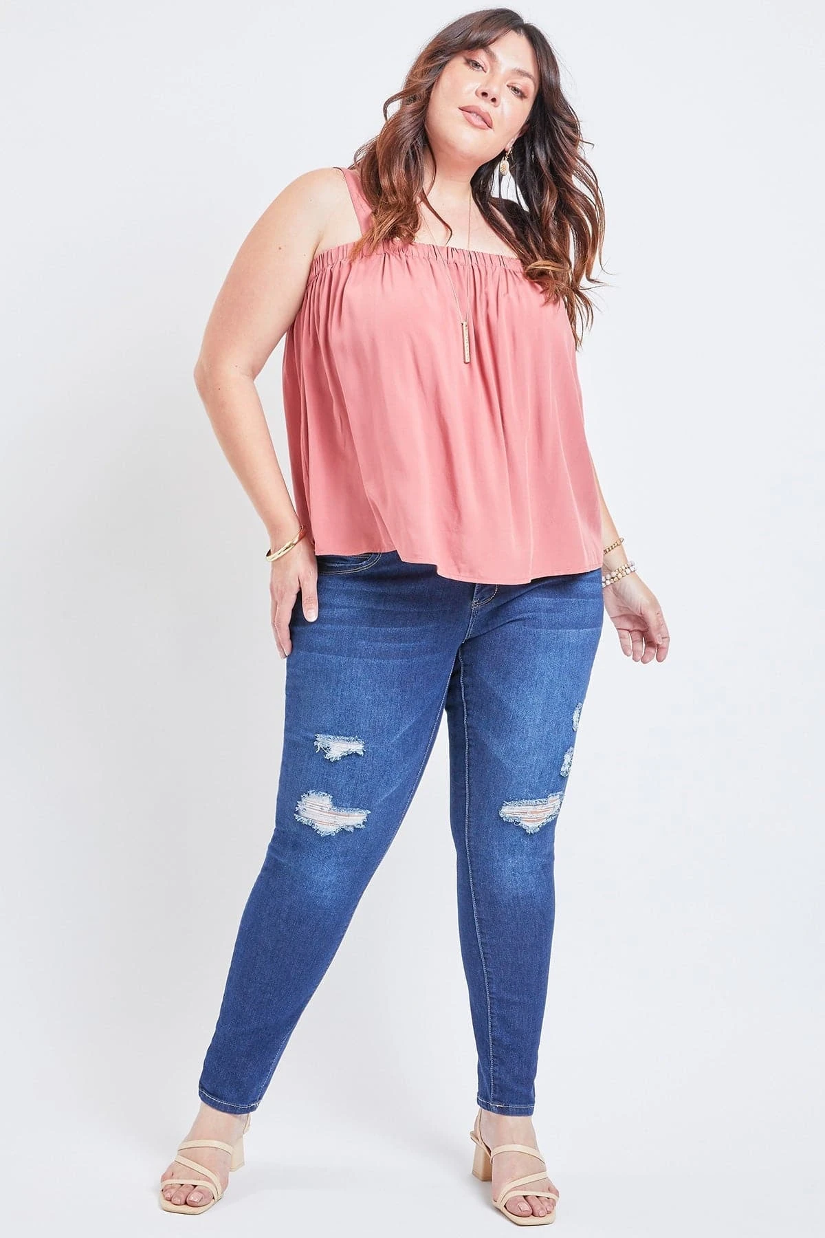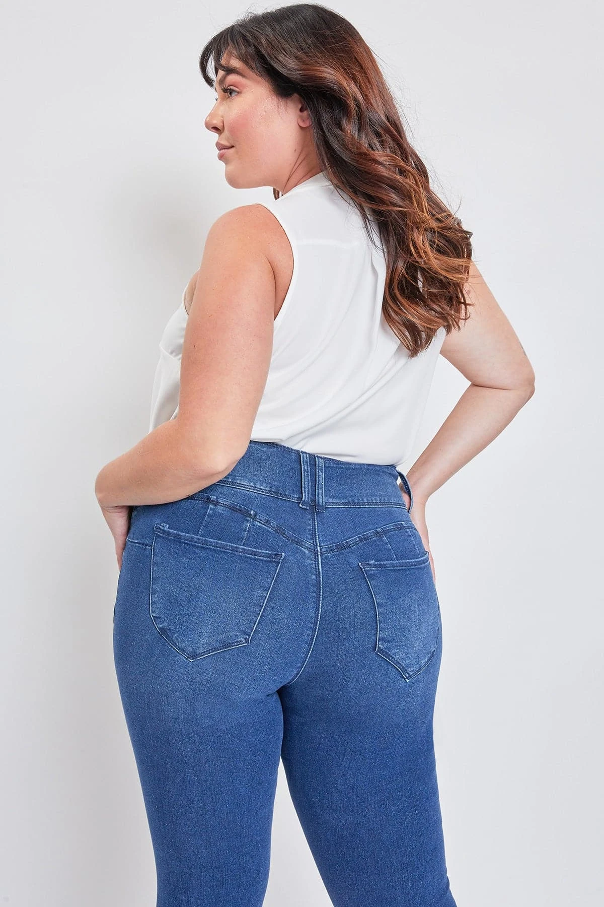 Your love for skinny jeans just got greater with our Women Plus Size WannaBettaButt Lycra Jean Made with Recycled Fibers. Our signature skinny jeans updated with vintage-like characteristics, such as an exposed summary fly to give a slightly rigid look. Made with lightweight and stretchy, yet durable recycled micro fibers, our WannaBettaButt recycled fabric denim collection provides you with the right amount of comfort and stretch for your jeans. Style these with a form-fitting tucked in top, or front tuck a loose blouse to show off the trendy summary fly detailing.Â