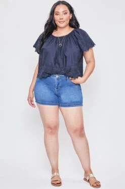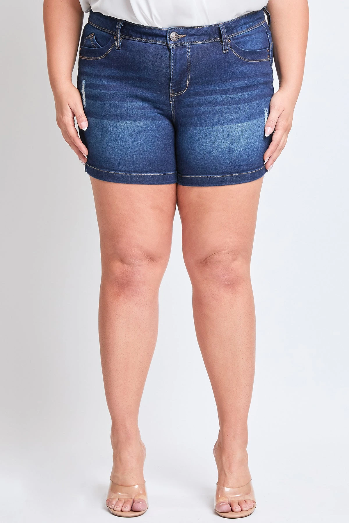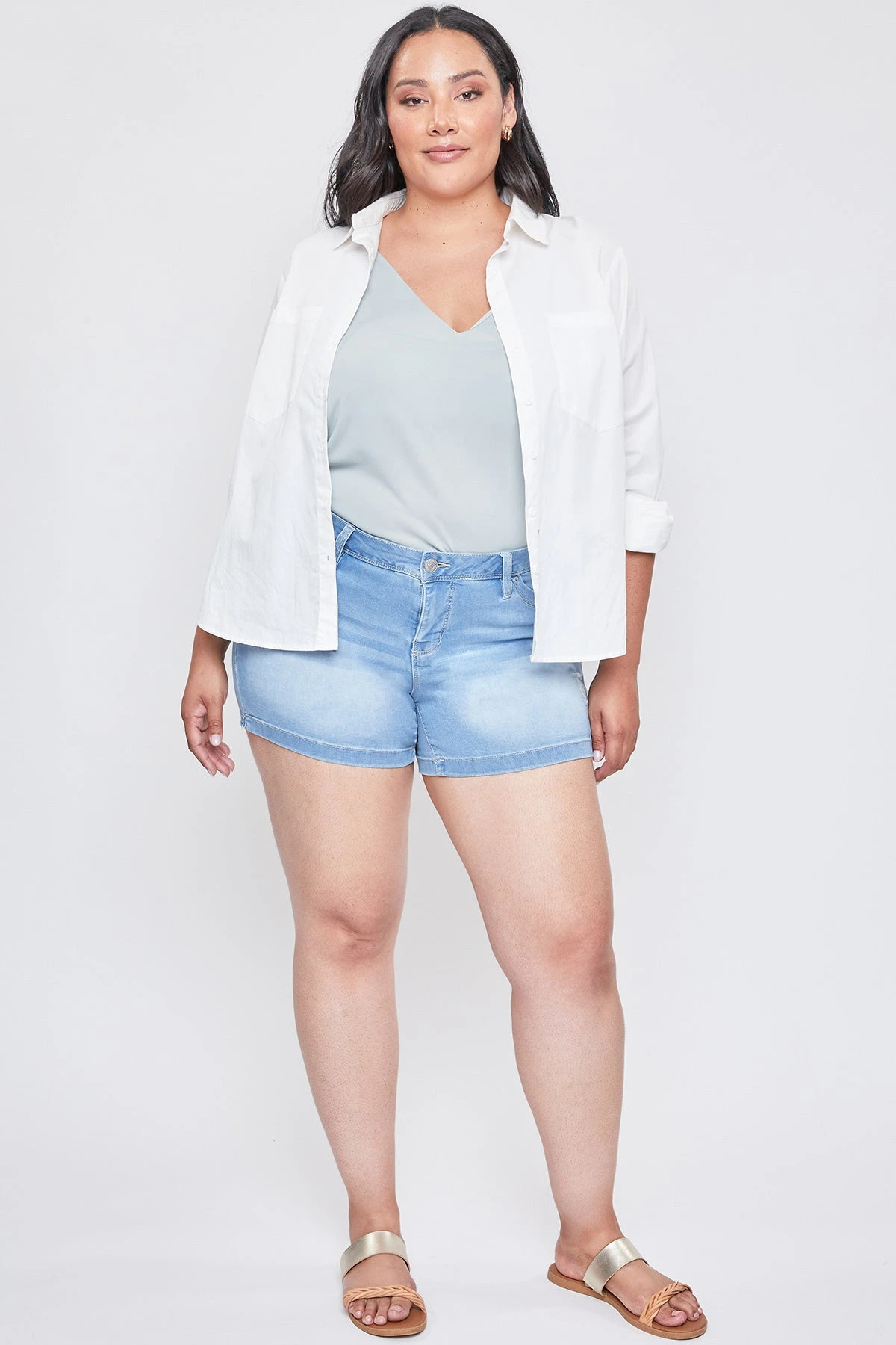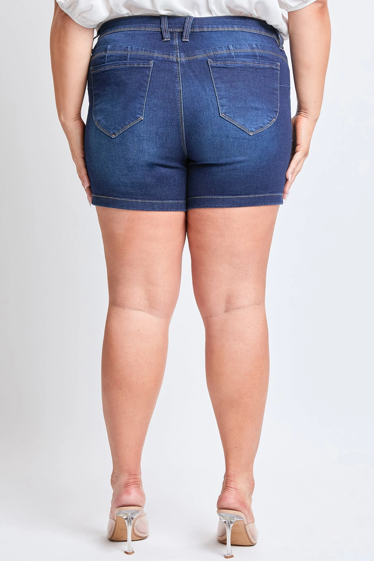 A classic style, but with the most flattering fit! Our Women Plus Size WannaBettaButt 1-Button Side Slit Hem Shorts Made with Recycled Fibers are made with our signature WBB heart-shaped butt stitching and uniquely crafted pockets to naturally contour and lift your bum. Made to flatter with a mid-rise that sits comfortable in between your hips and belly summary. Because these shorts are such a classic style, you can pair them with pretty much anything! We love these styled with a loose summary-down front tucked, and sandals for an effortless, off-duty look.Â